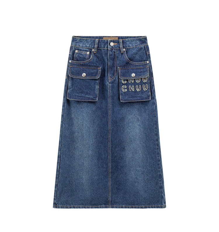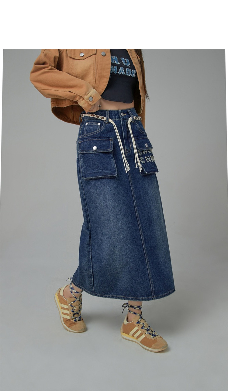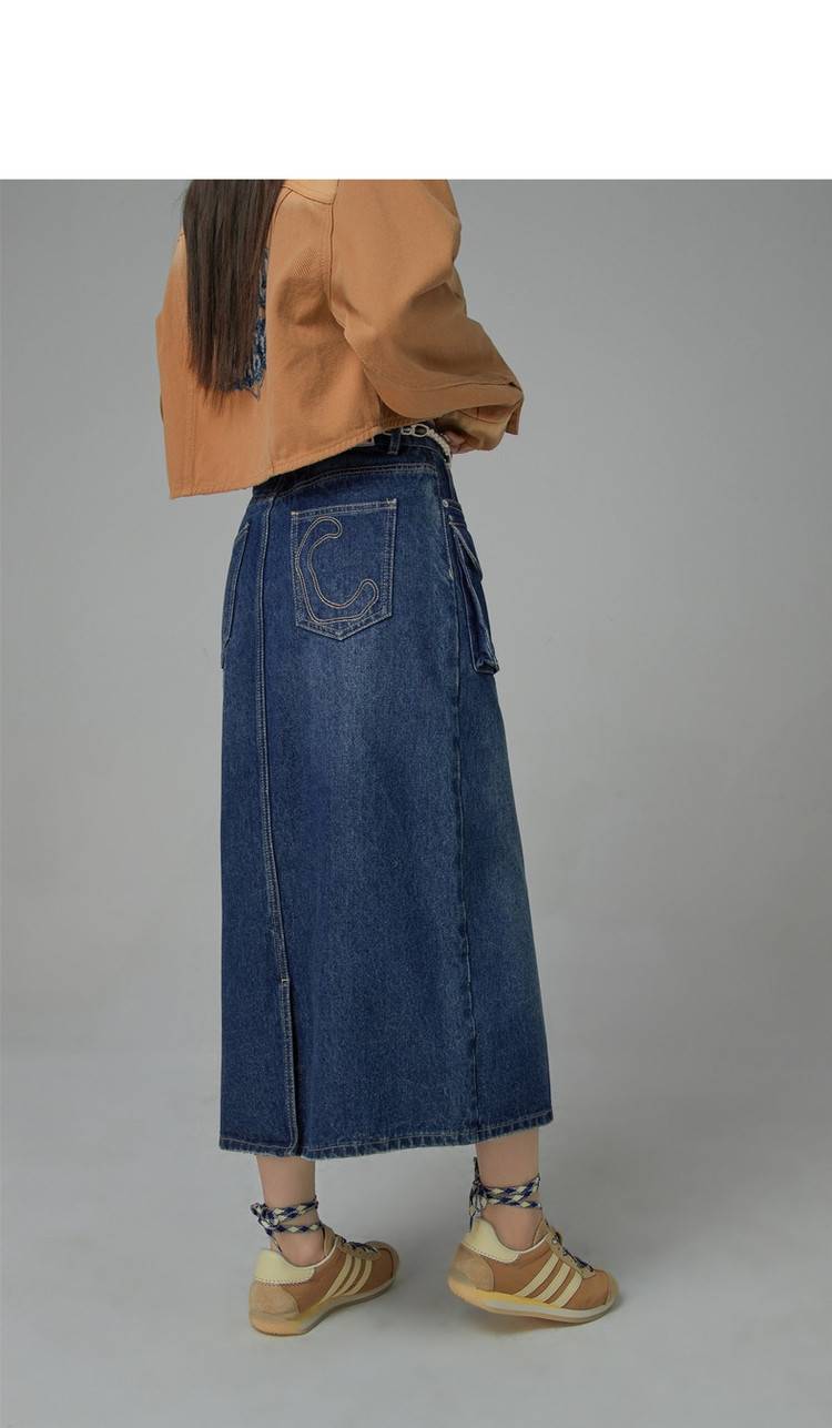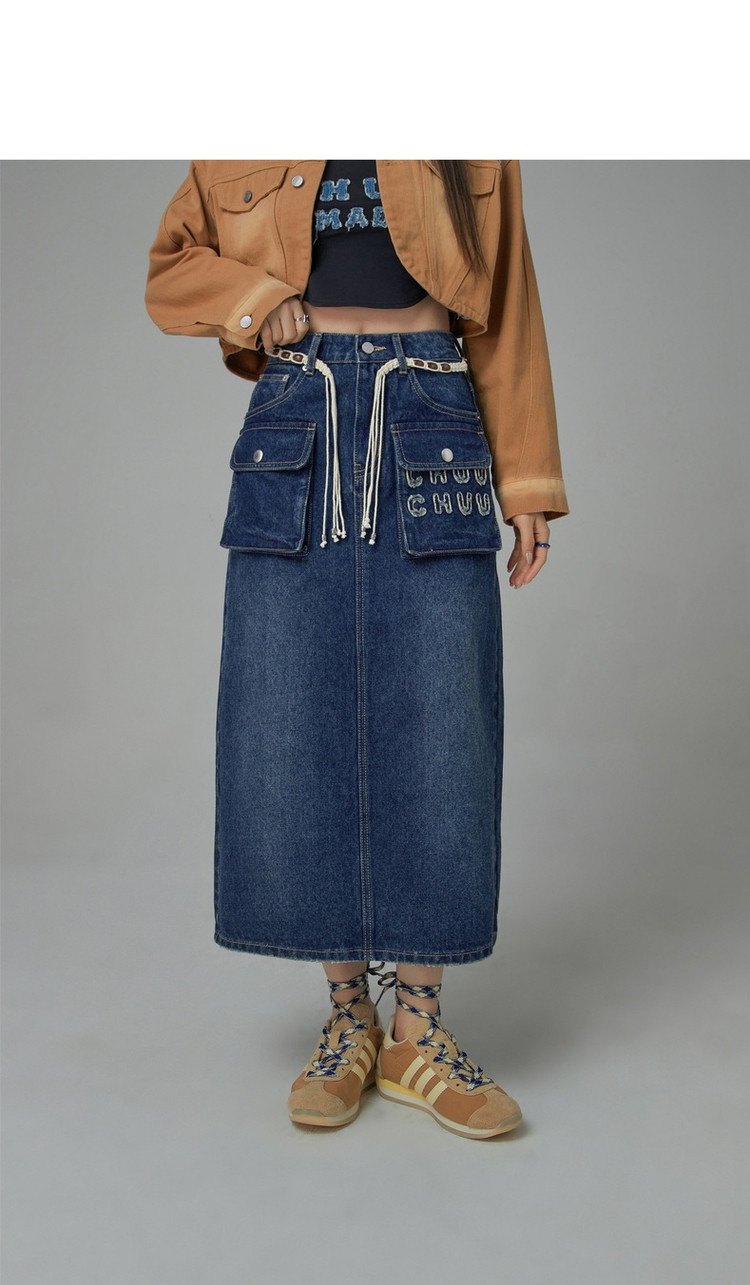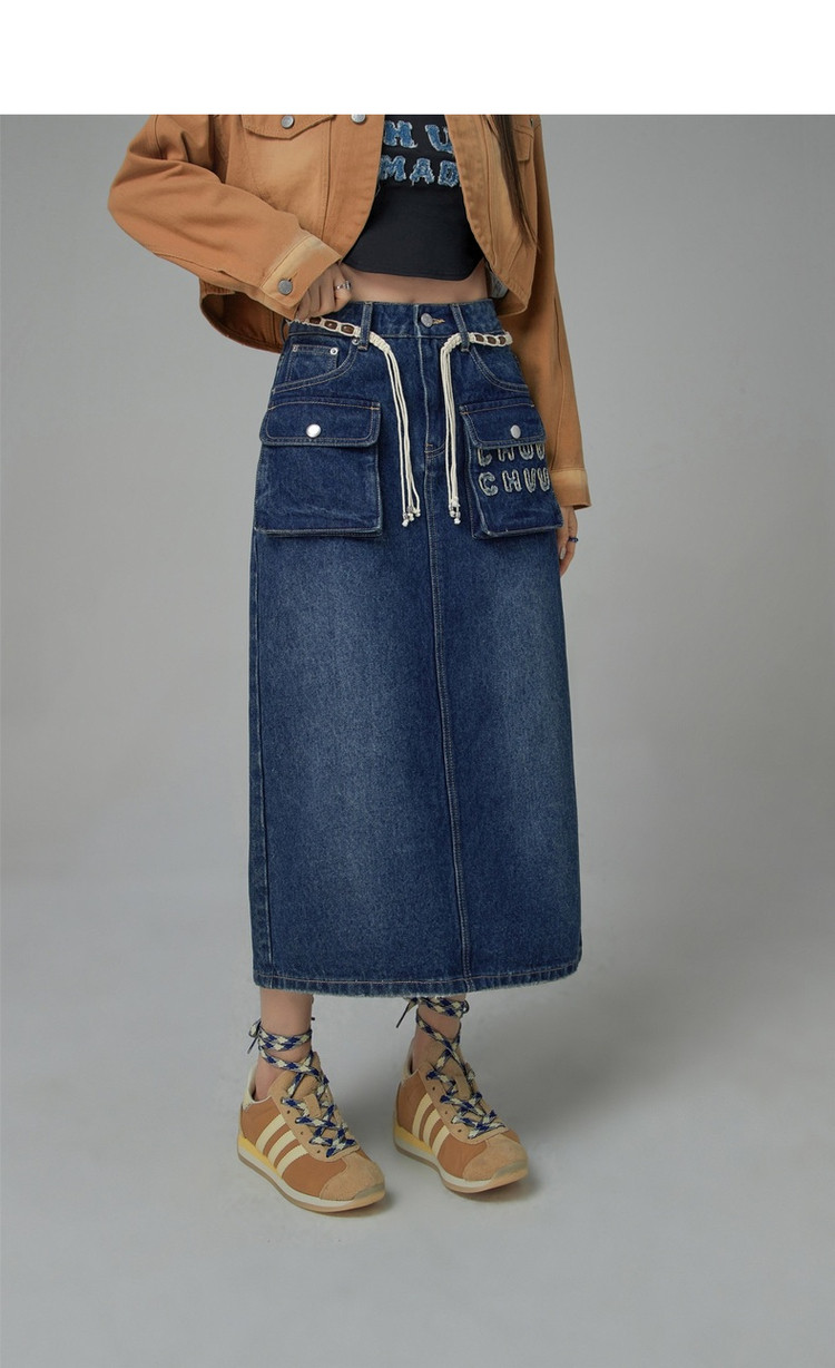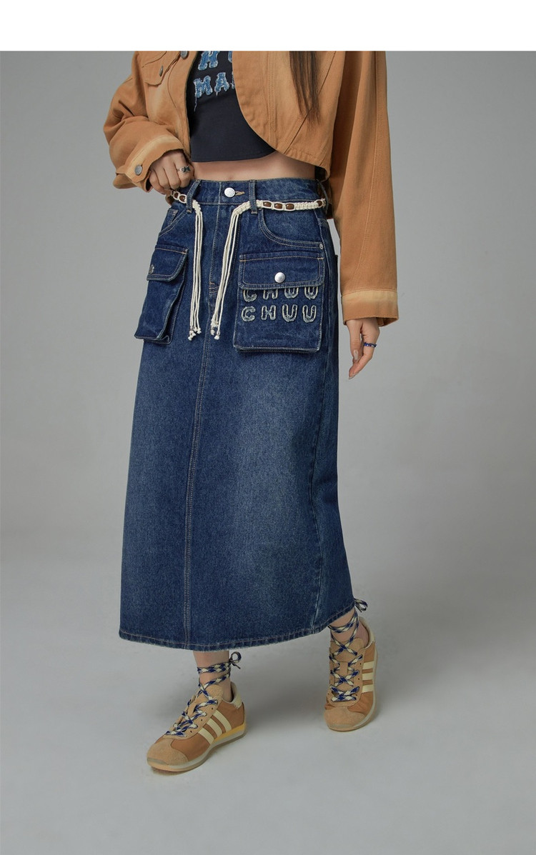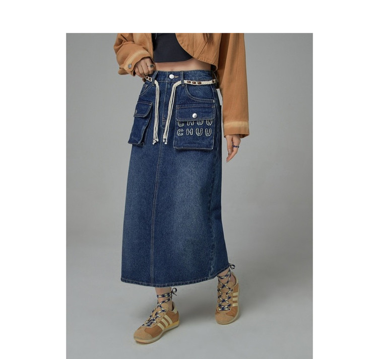 商品名称:高腰牛仔裙春秋字母毛巾绣口袋高腰长款半身裙 612563