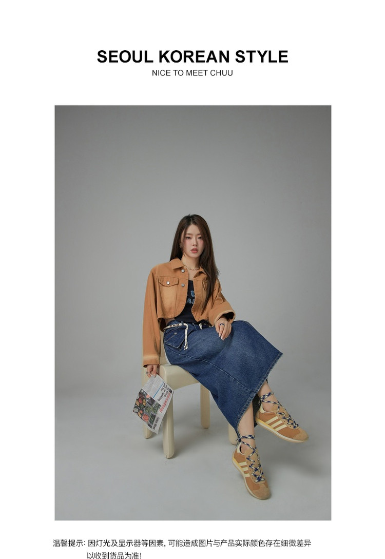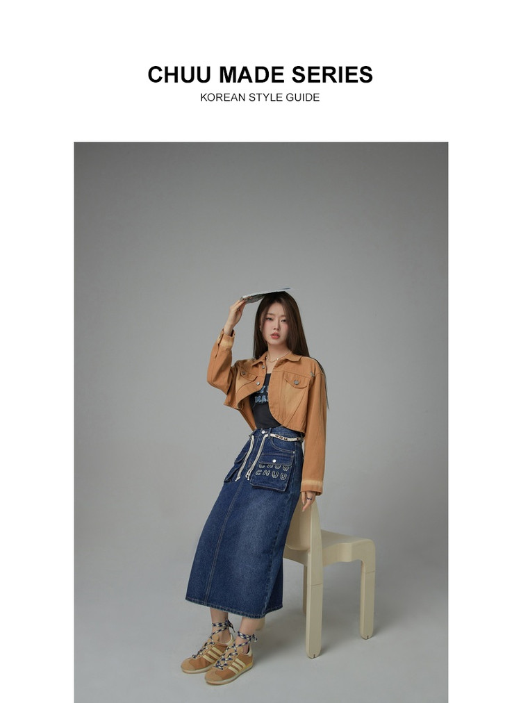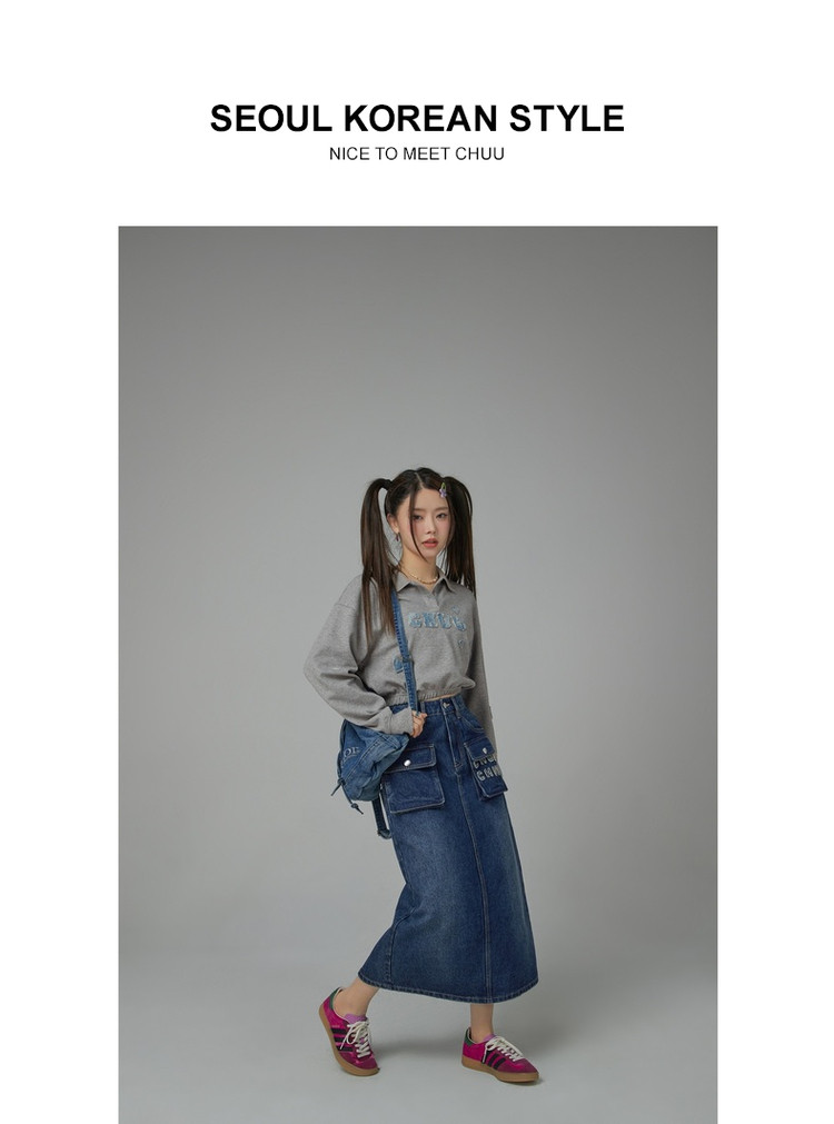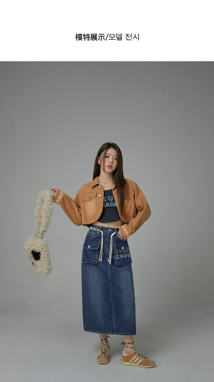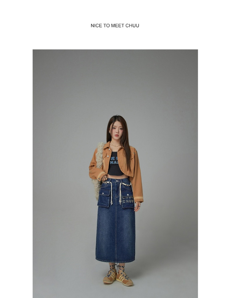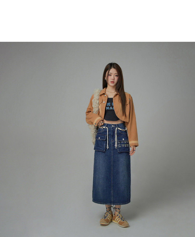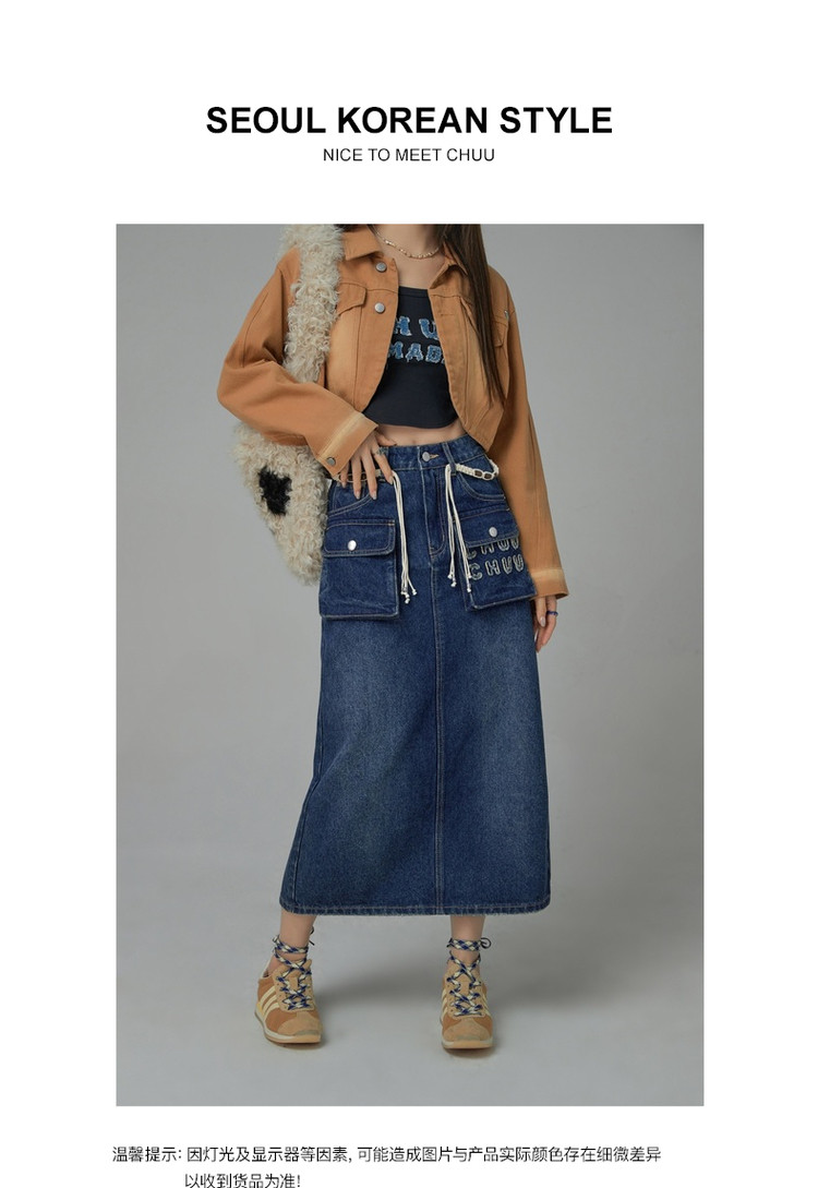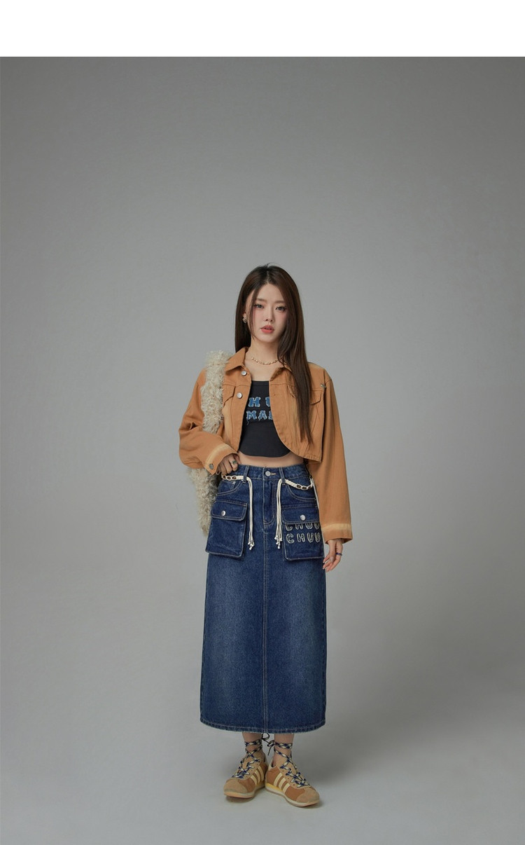 商品名称:高腰牛仔裙春秋字母毛巾绣口袋高腰长款半身裙 612563