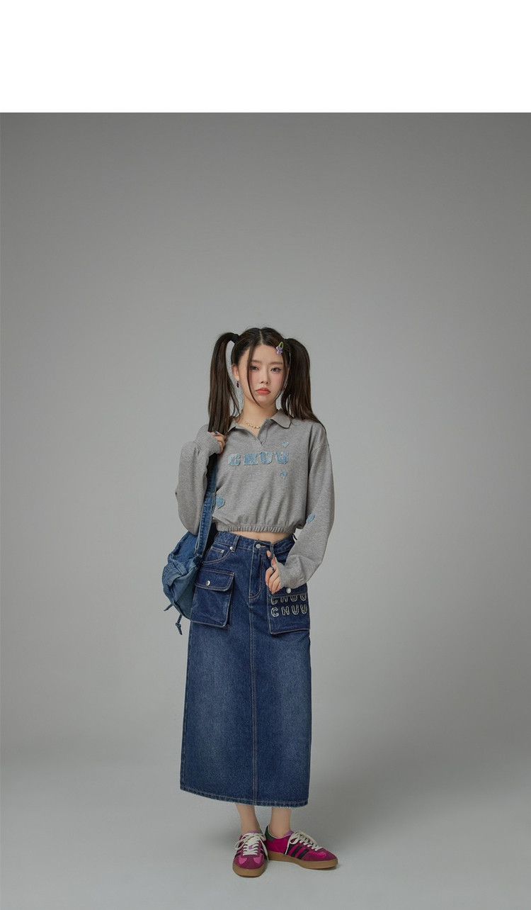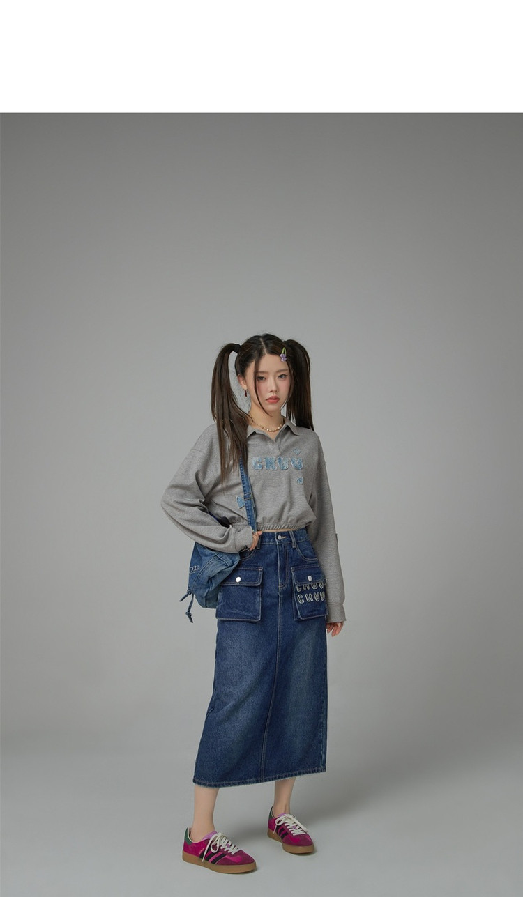 高腰牛仔裙春秋字母毛巾绣口袋高腰长款半身裙 612563