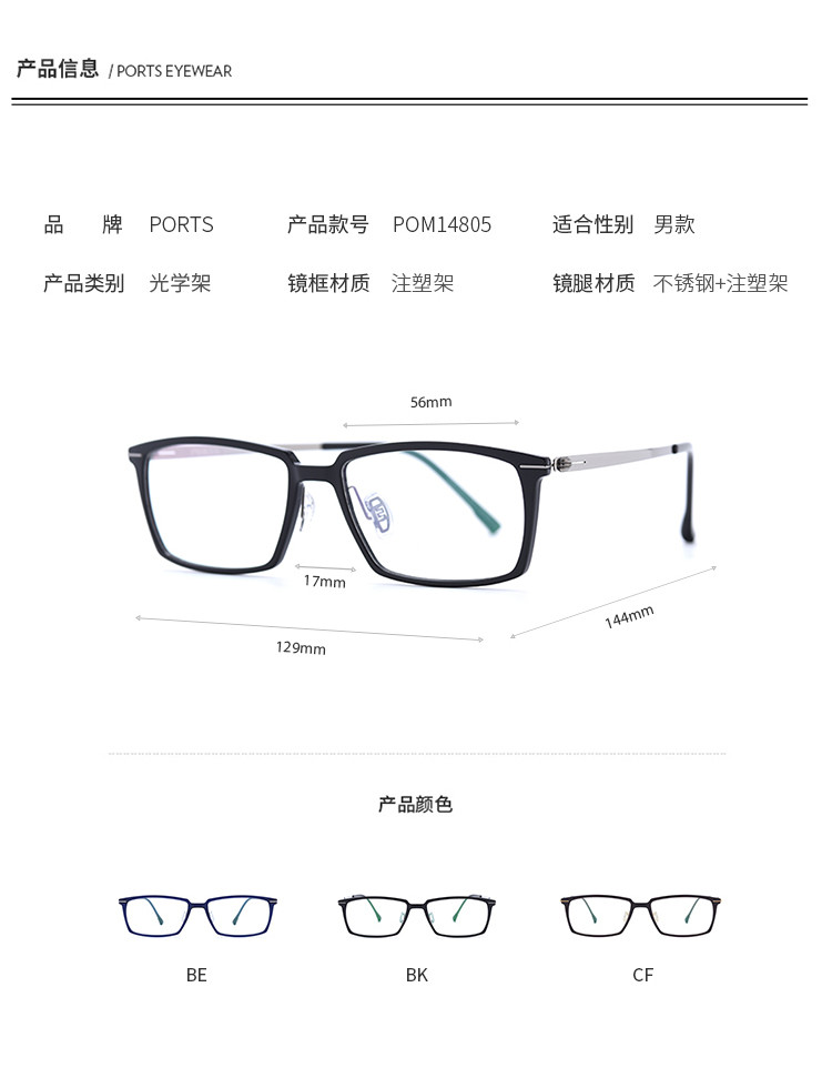 商品名称:PORTS眼镜男款经典休闲百搭眼镜架光学架POM14805 280458