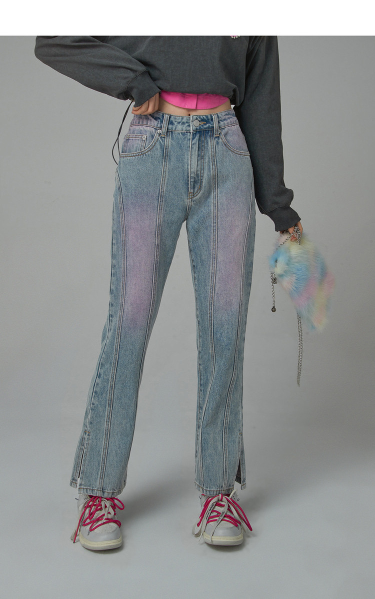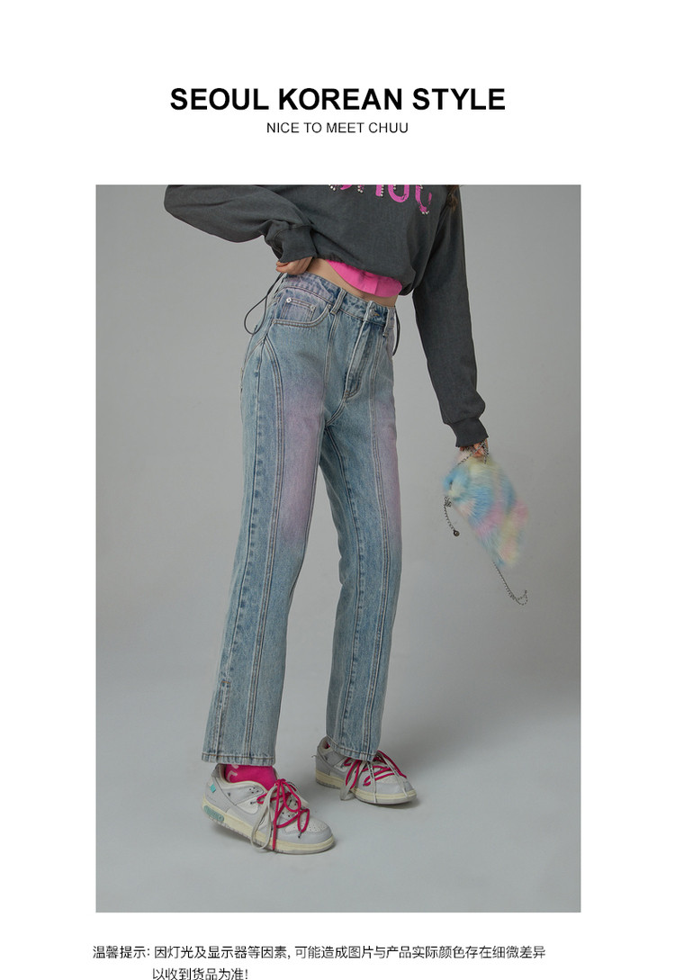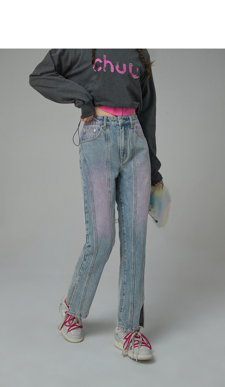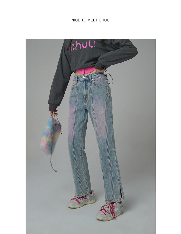 商品名称:撞色牛仔裤女春秋高腰直筒显瘦开叉微喇九分裤 577491