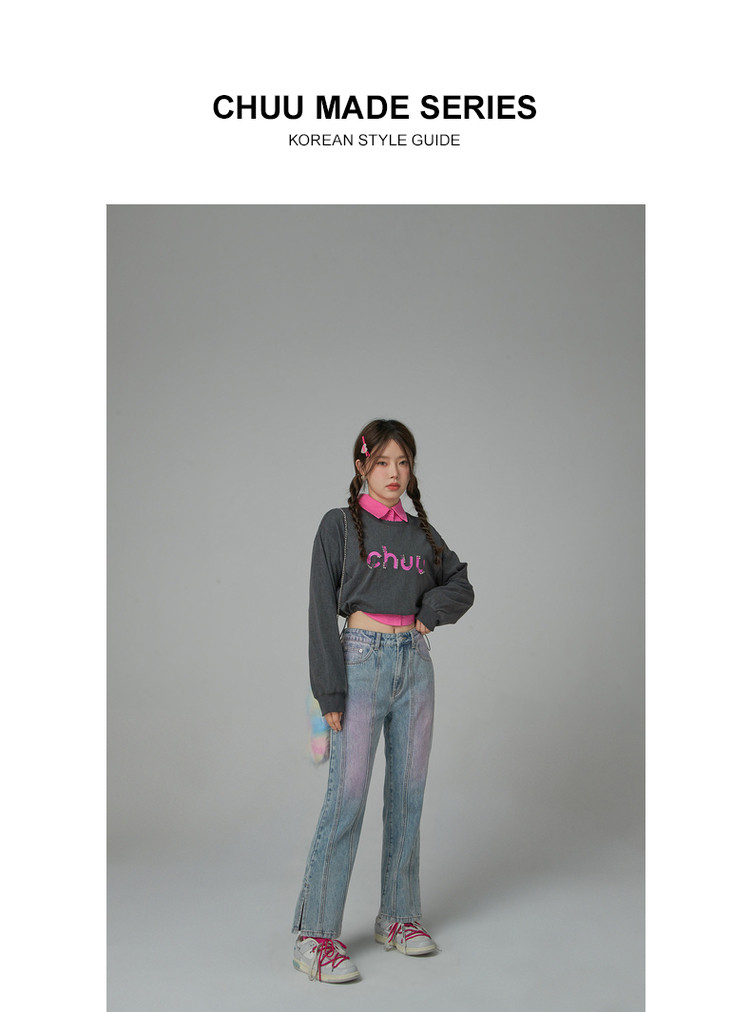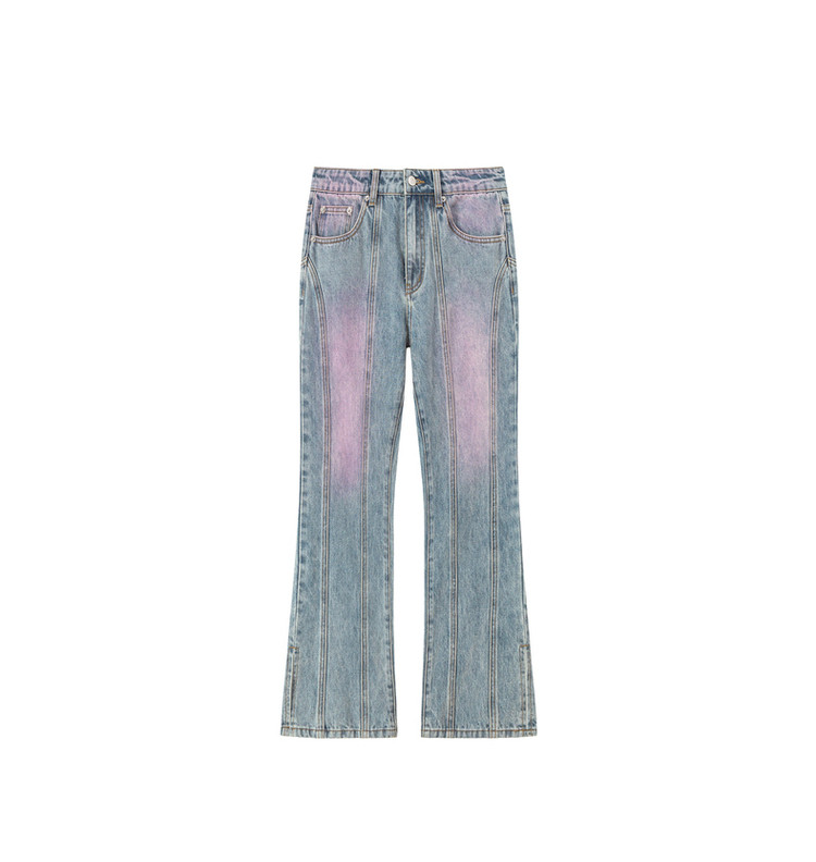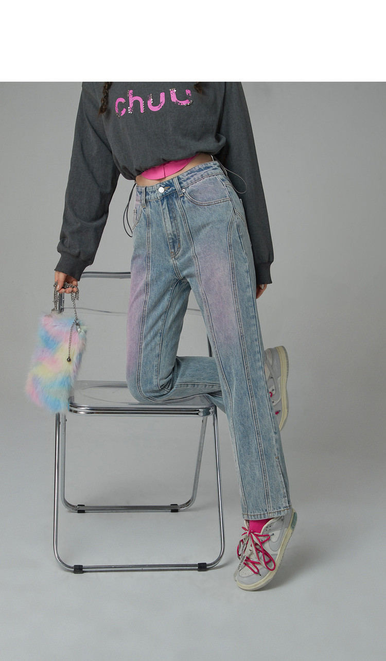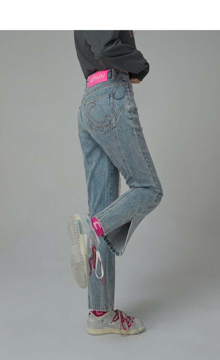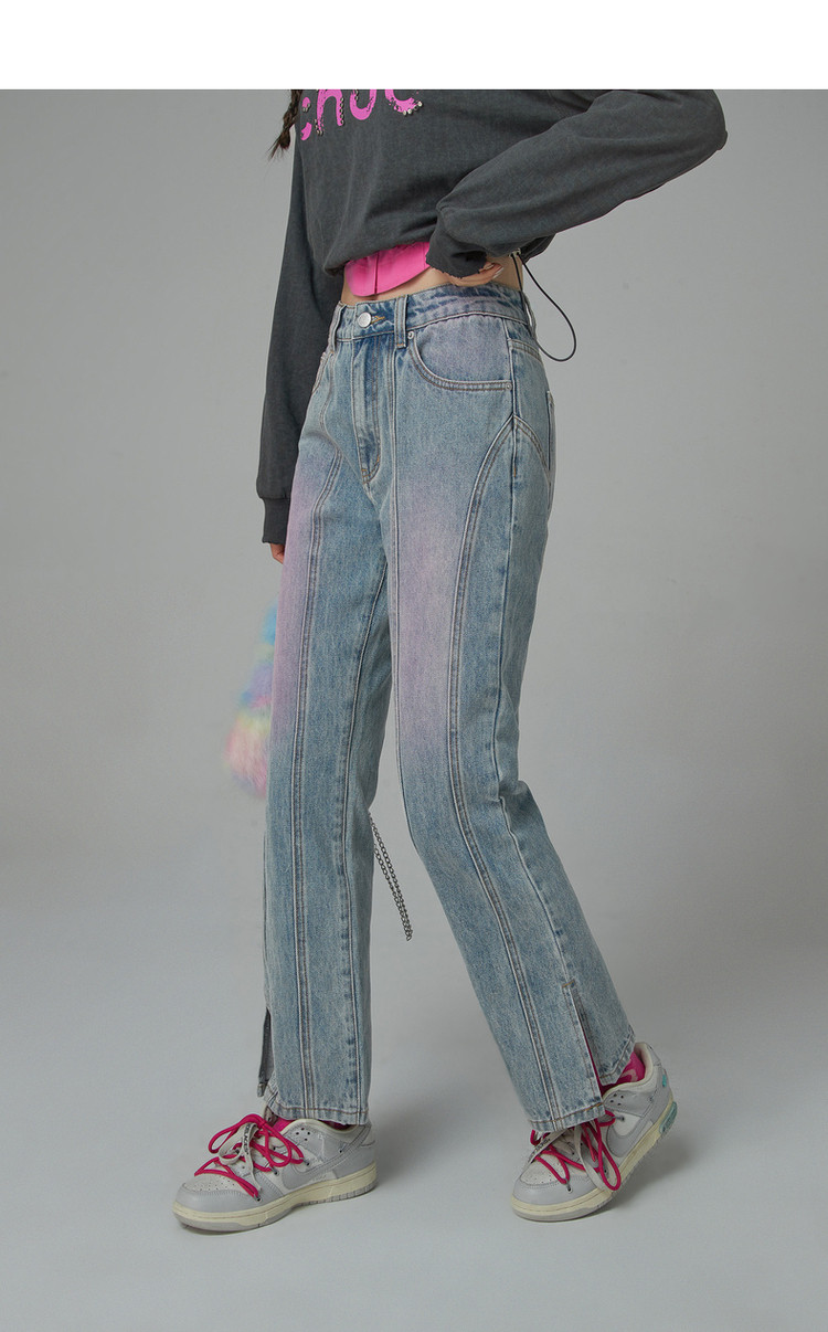 商品名称:撞色牛仔裤女春秋高腰直筒显瘦开叉微喇九分裤 577491