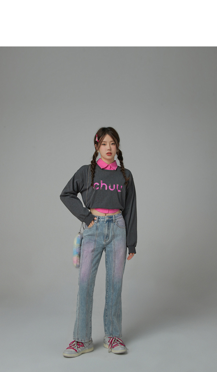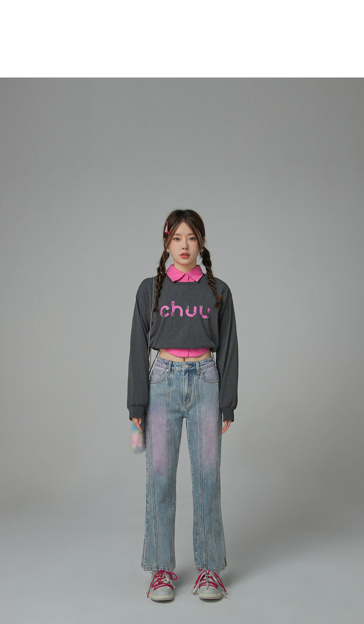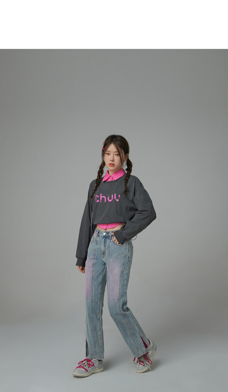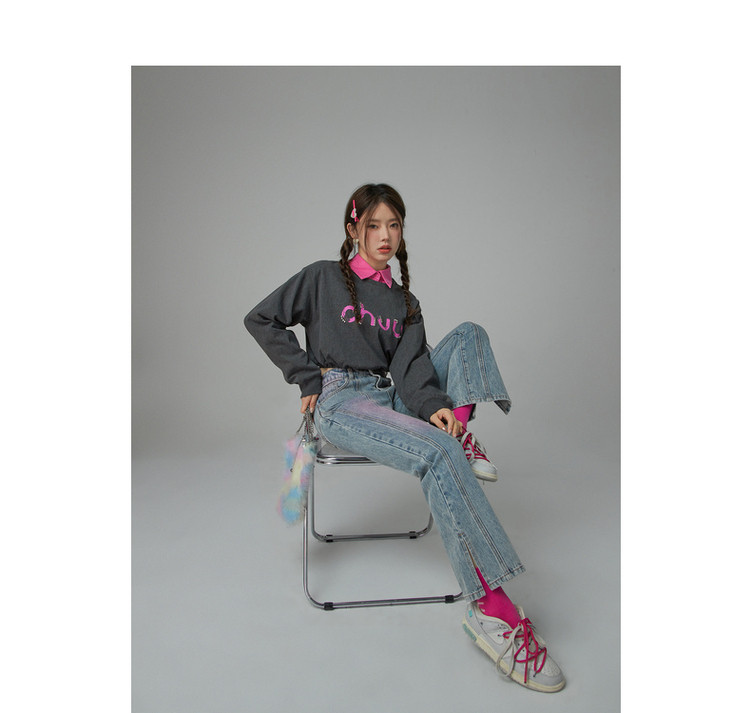 撞色牛仔裤女春秋高腰直筒显瘦开叉微喇九分裤 577491