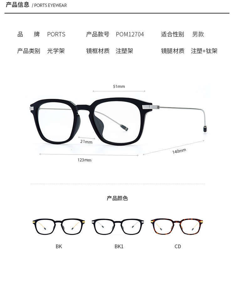 商品名称:PORTS眼镜男款板材纯钛时尚眼镜架光学架POM12704 776778
