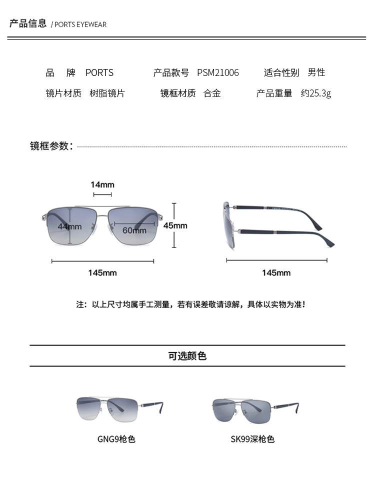 商品名称:Ports眼镜男款经典双梁商务方框太阳镜PSM21006 817482