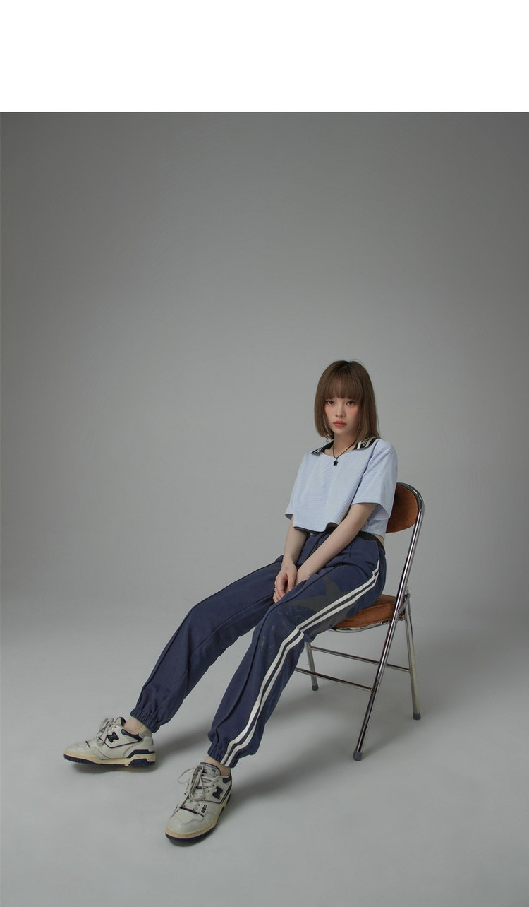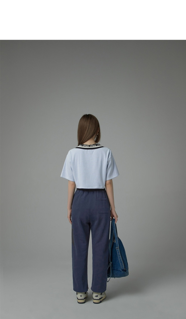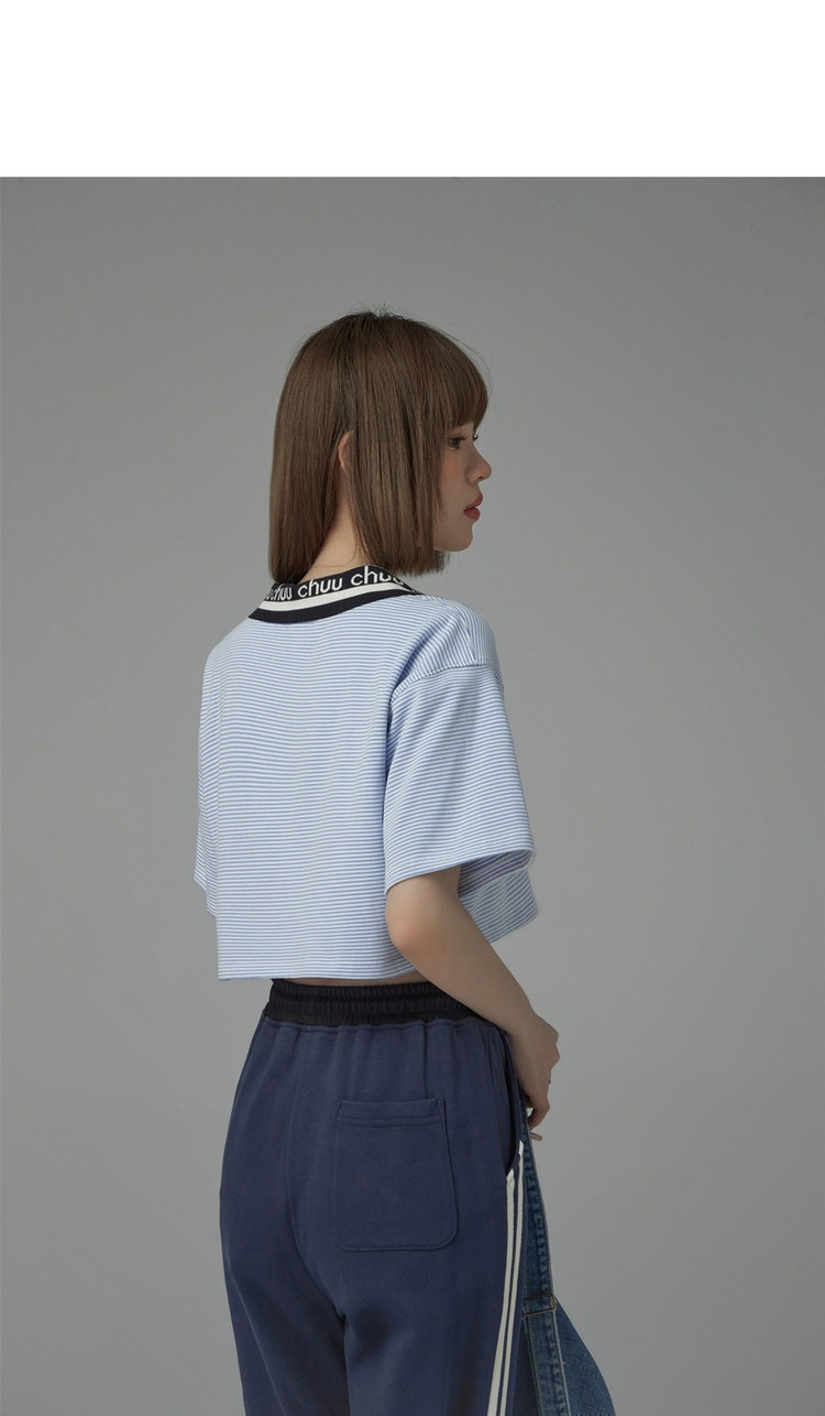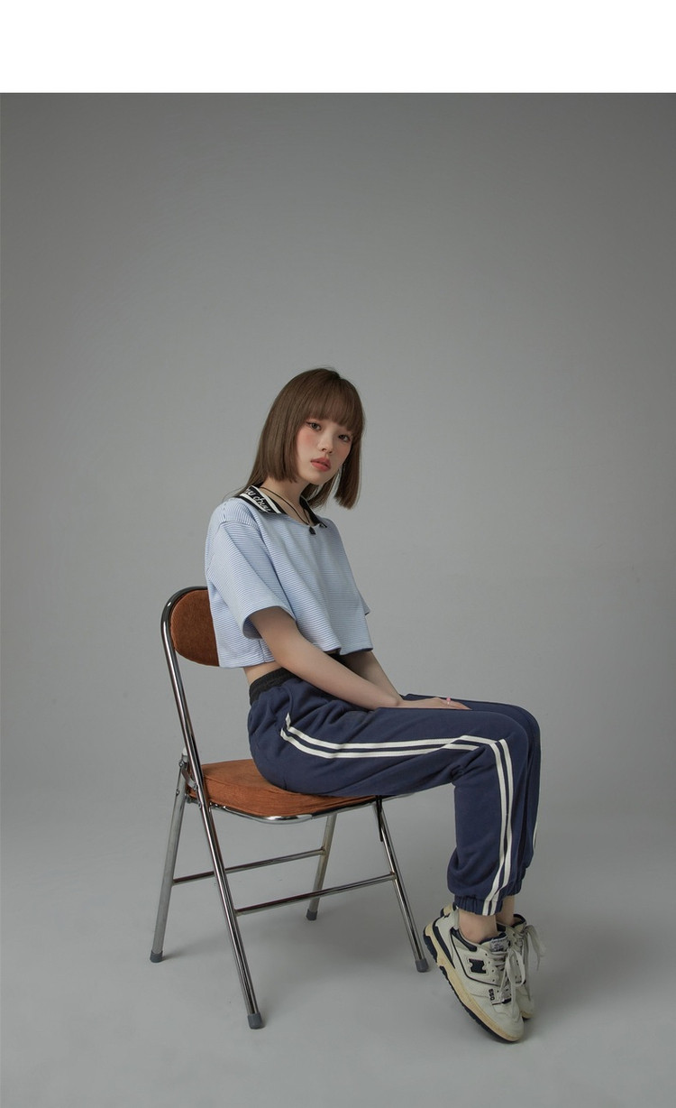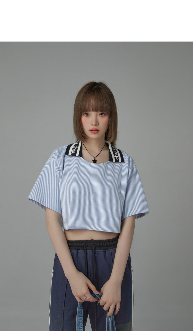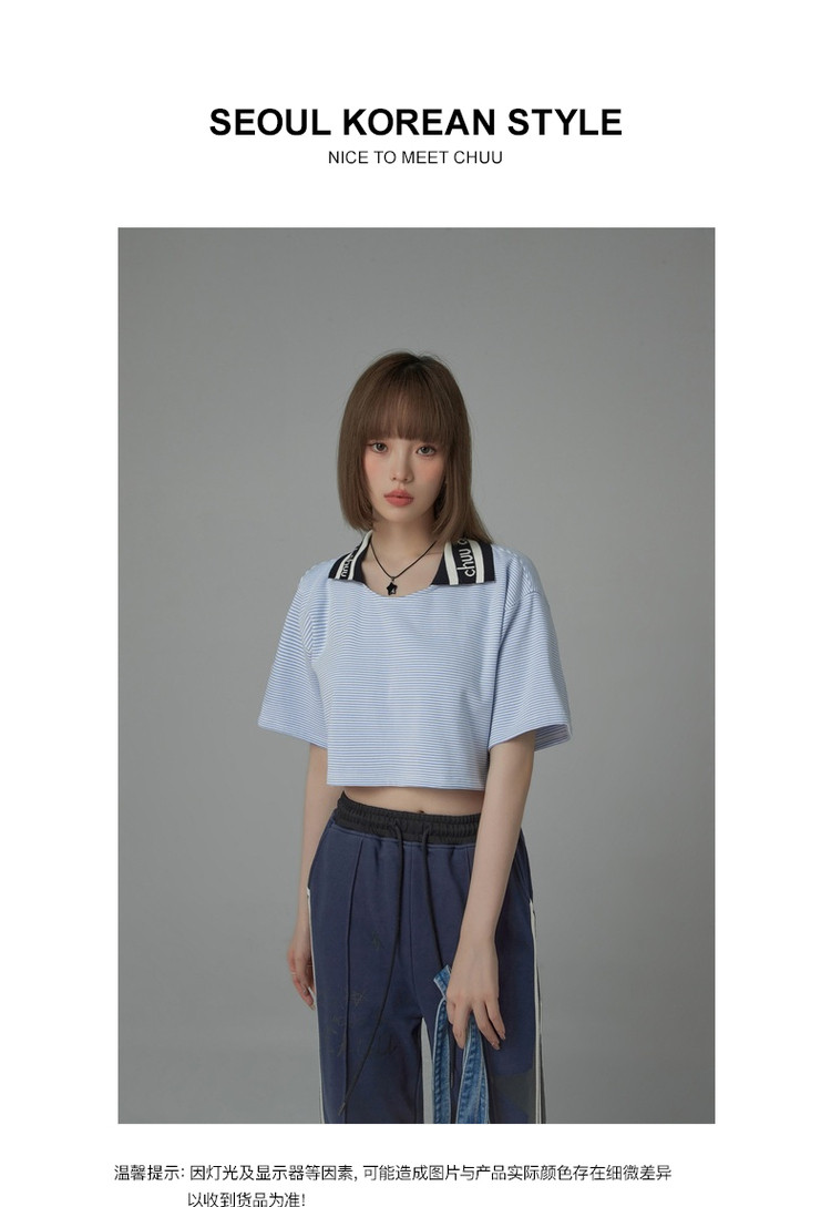 商品名称:翻领条纹t恤女秋少女感宽松短袖打底衫短款上衣 442643
