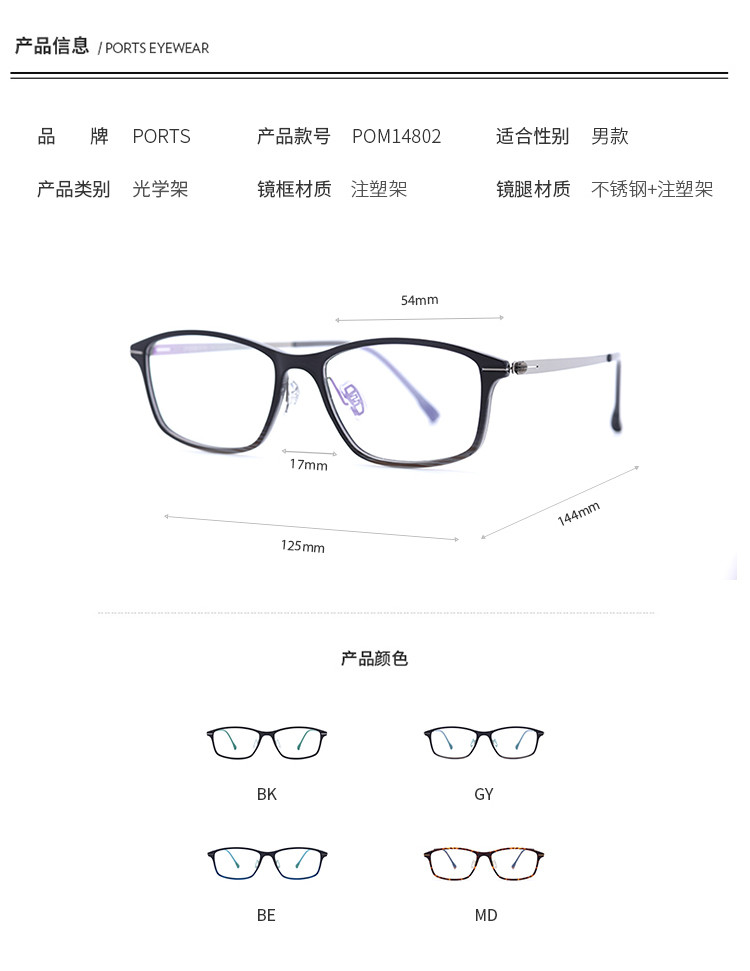 商品名称:PORTS眼镜男款商务时尚方框超眼镜架光学架POM14802 586762