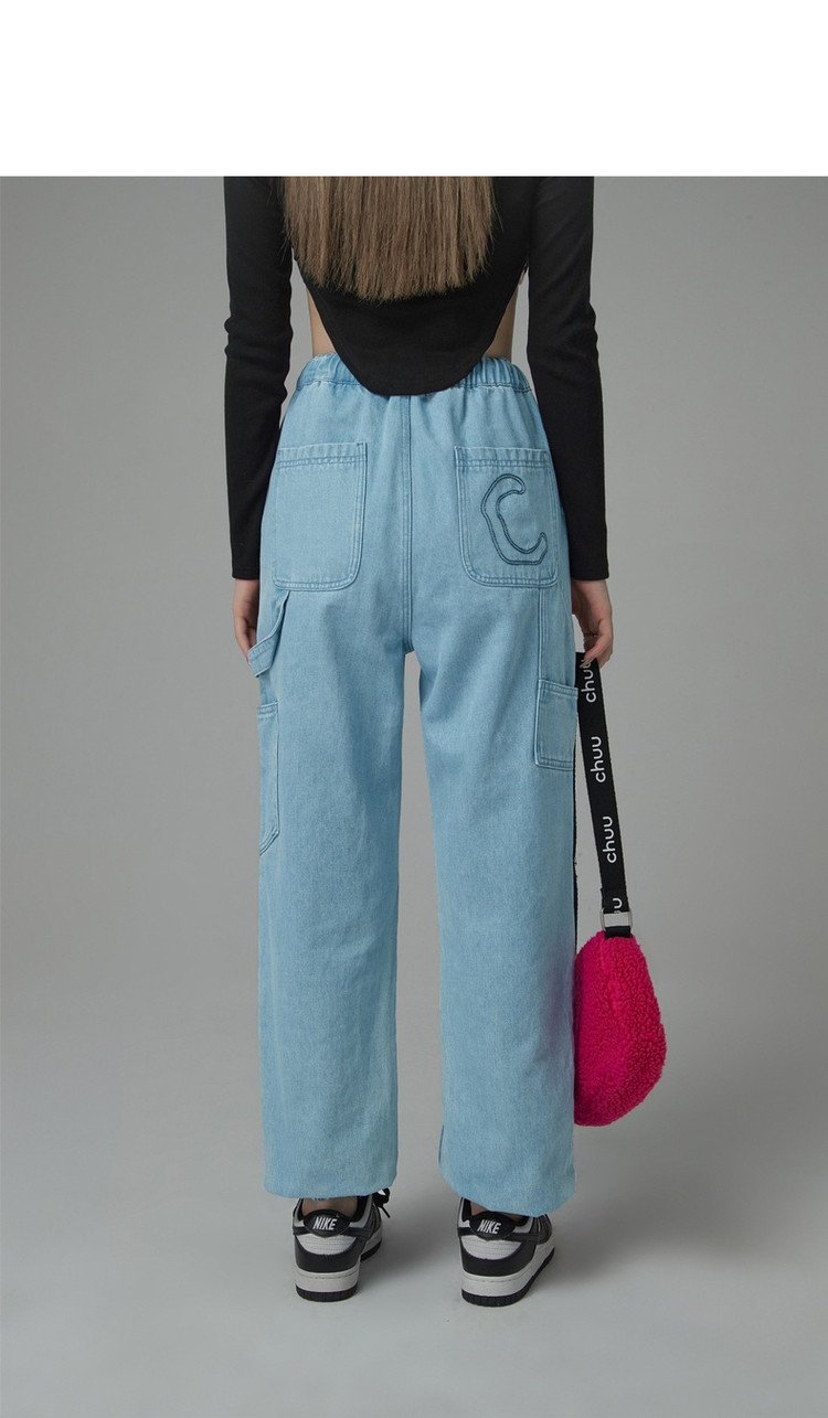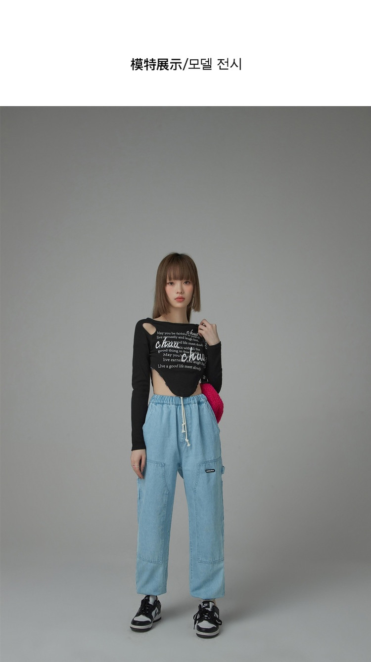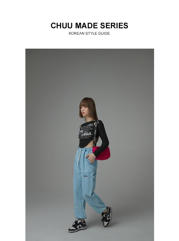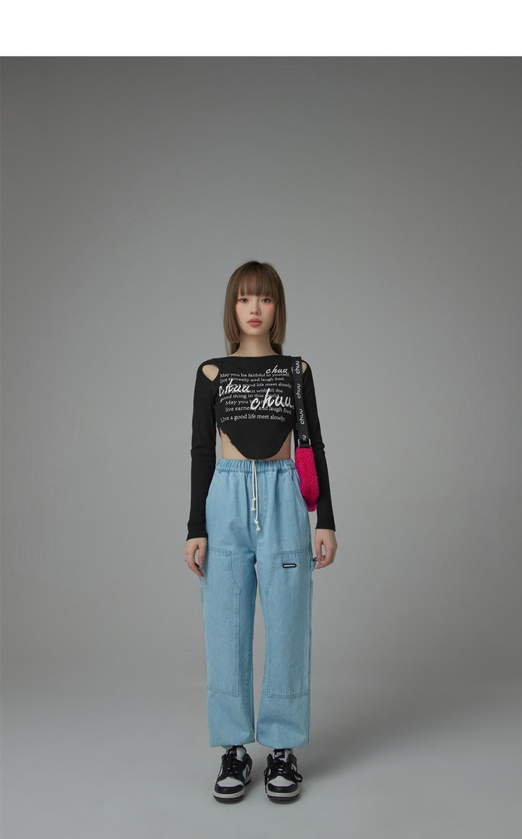chuu高腰阔腿休闲裤女春秋字母休闲宽松破洞长裤 380947