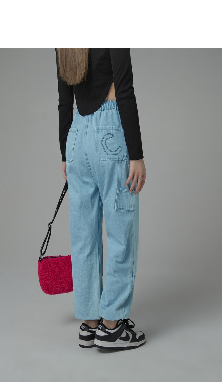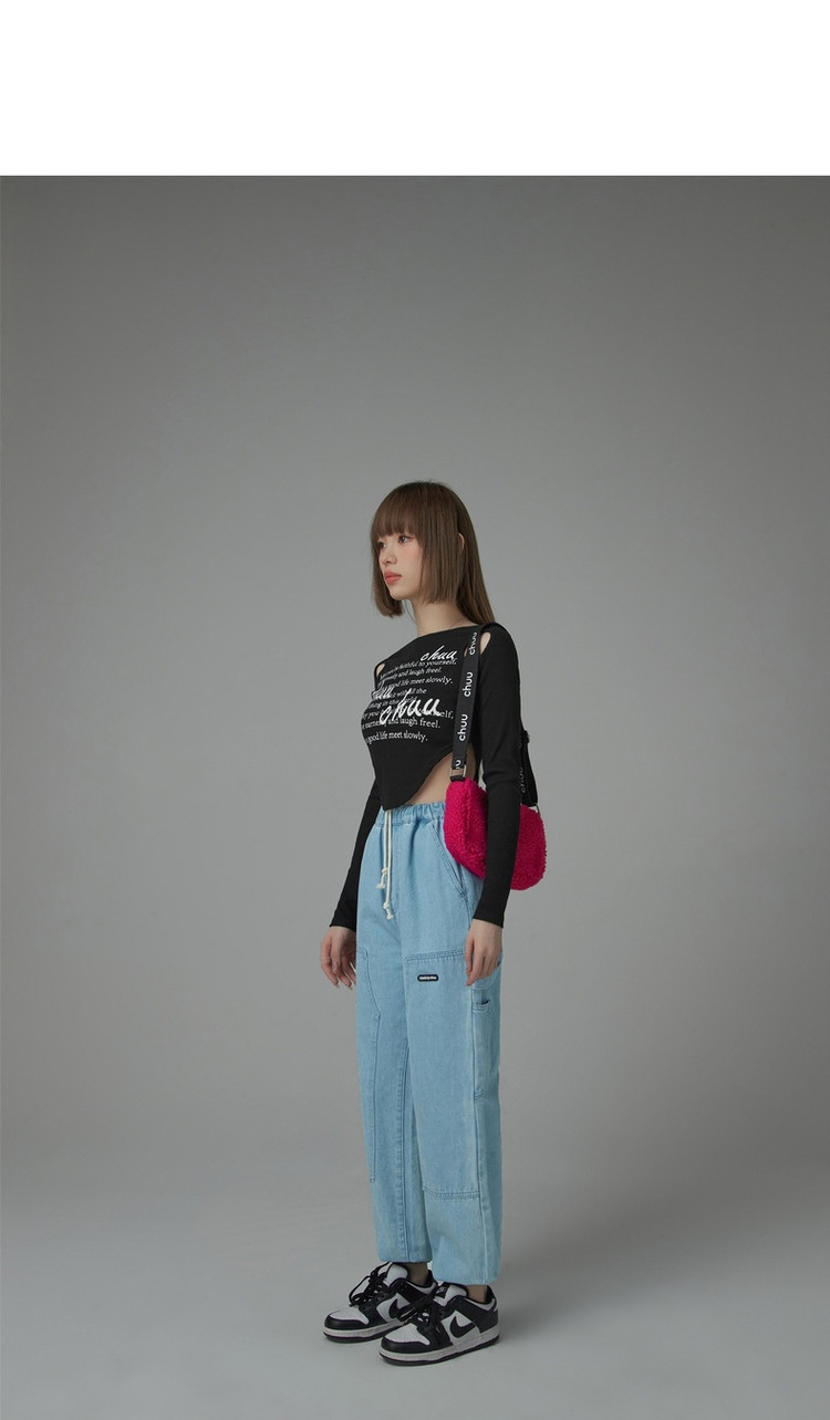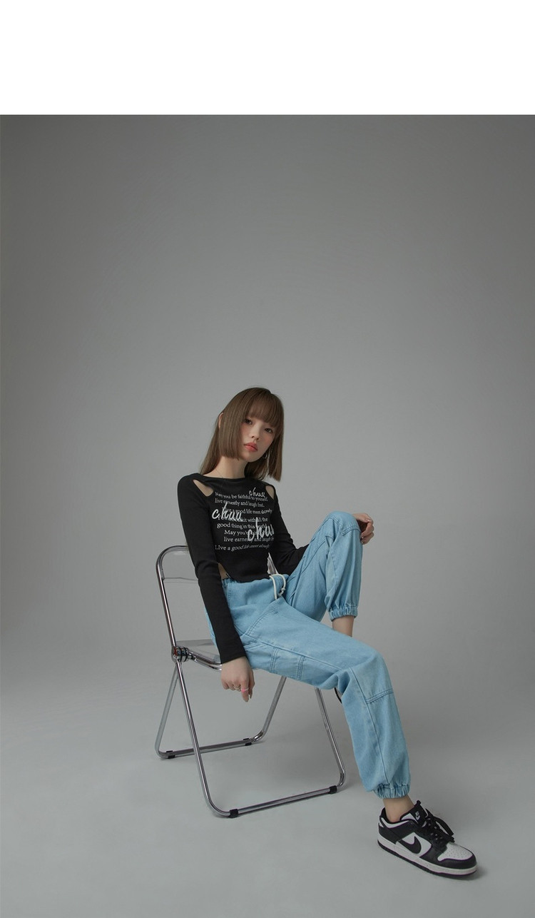 chuu高腰阔腿休闲裤女春秋字母休闲宽松破洞长裤 380947