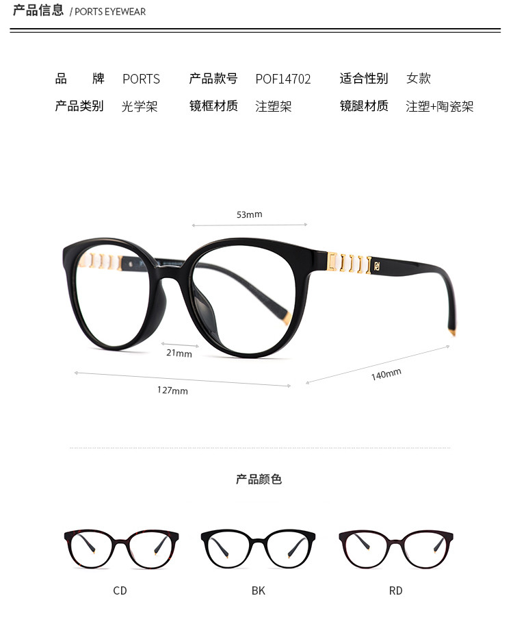 商品名称:Ports眼镜女款简约TR圆形大框眼镜架光学架POF14702 479498