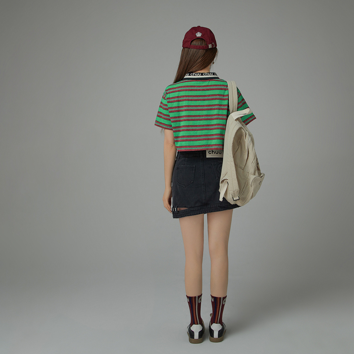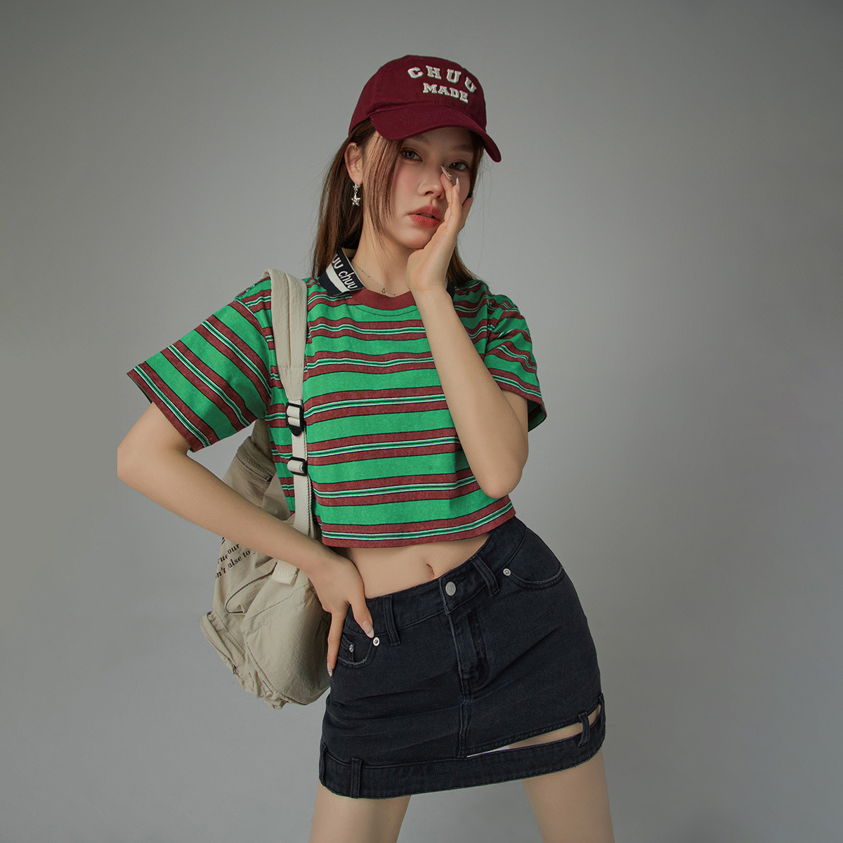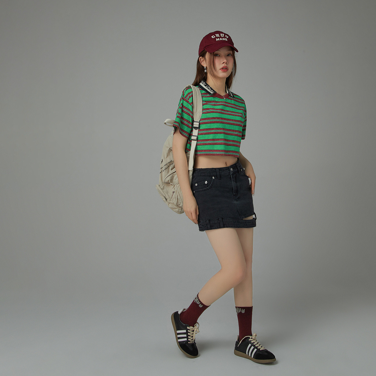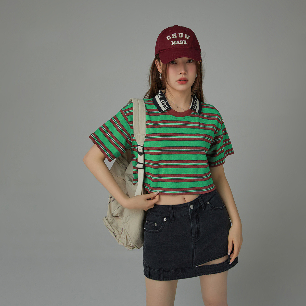 条纹撞色T恤女秋字母翻领潮流短袖套头上衣 517715