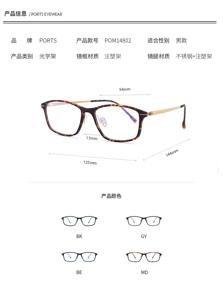 商品名称:PORTS眼镜男款商务时尚方框超眼镜架光学架POM14802 288714