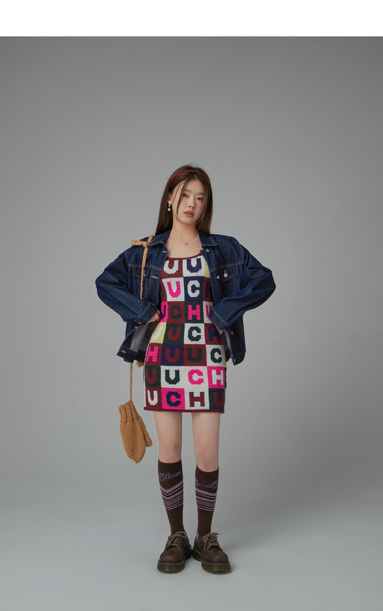 CHUU字母满印连衣裙女士春秋吊带a字包臀针织短裙 323539