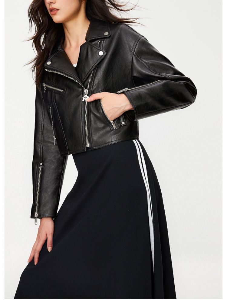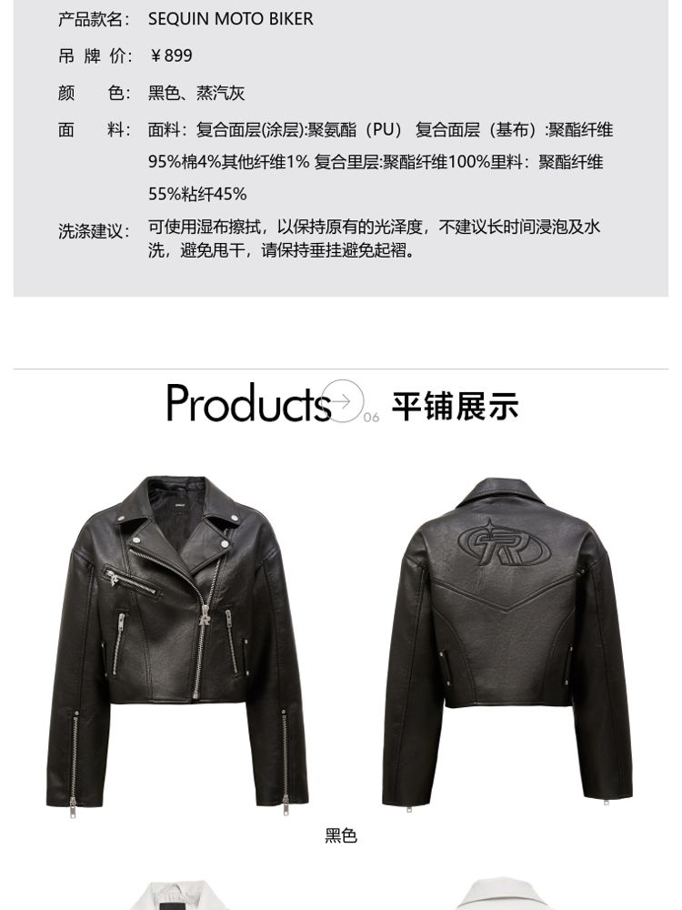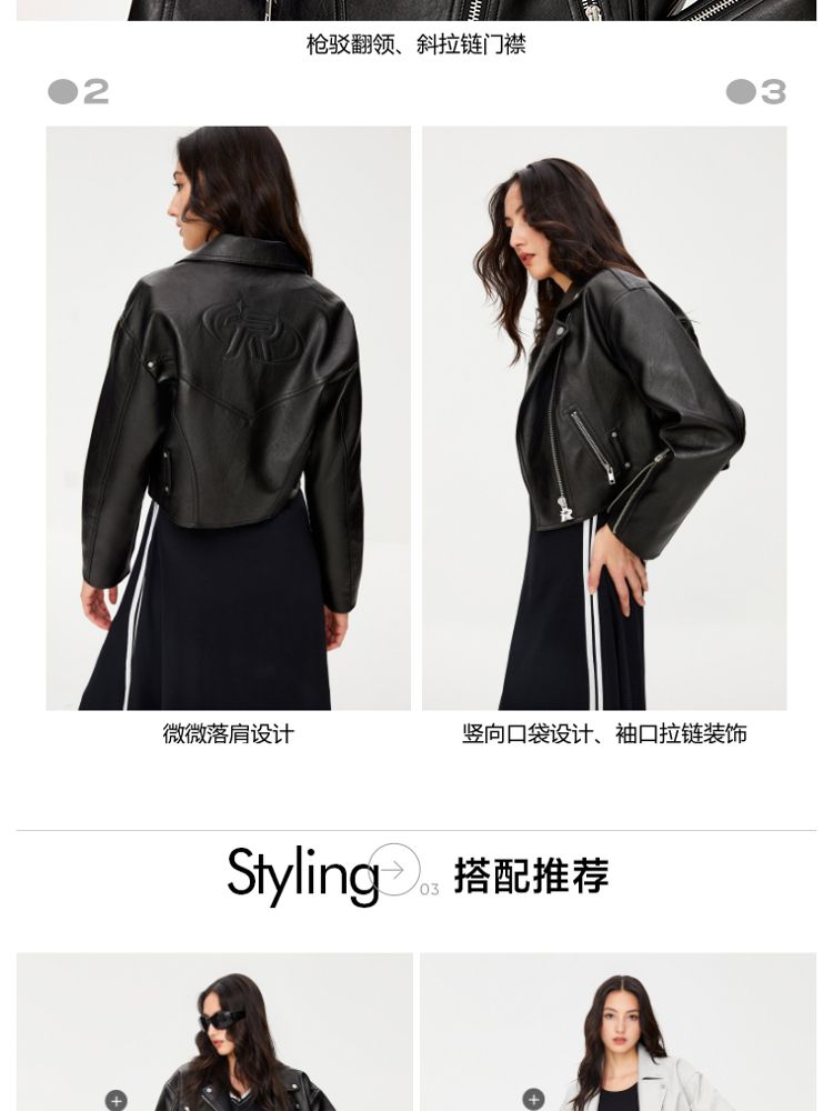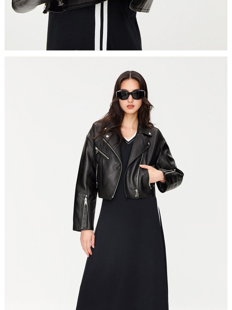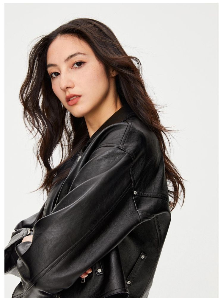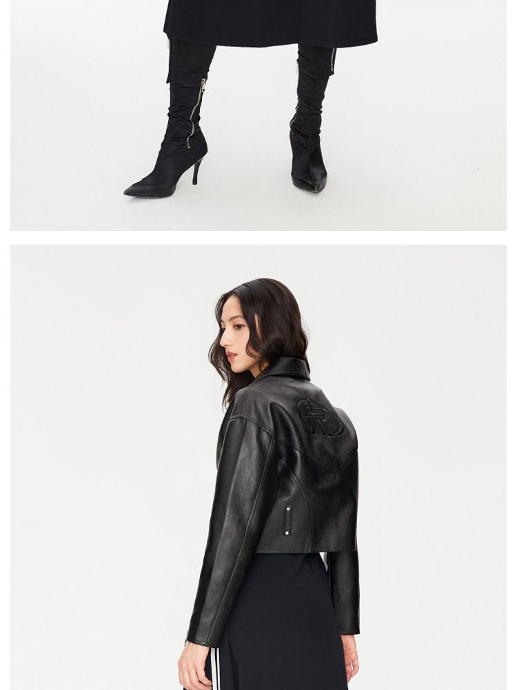 商品名称:【袖口拉链】春季简约翻领长袖短款夹克PU外套女 517594