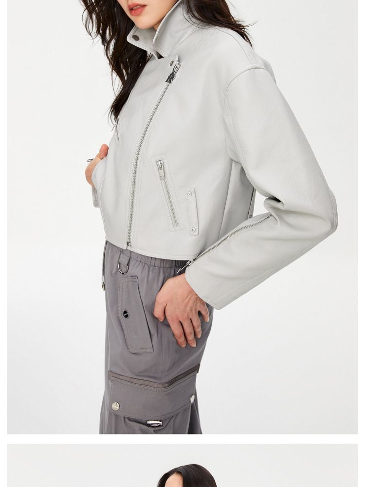 【袖口拉链】春季简约翻领长袖短款夹克PU外套女 517594