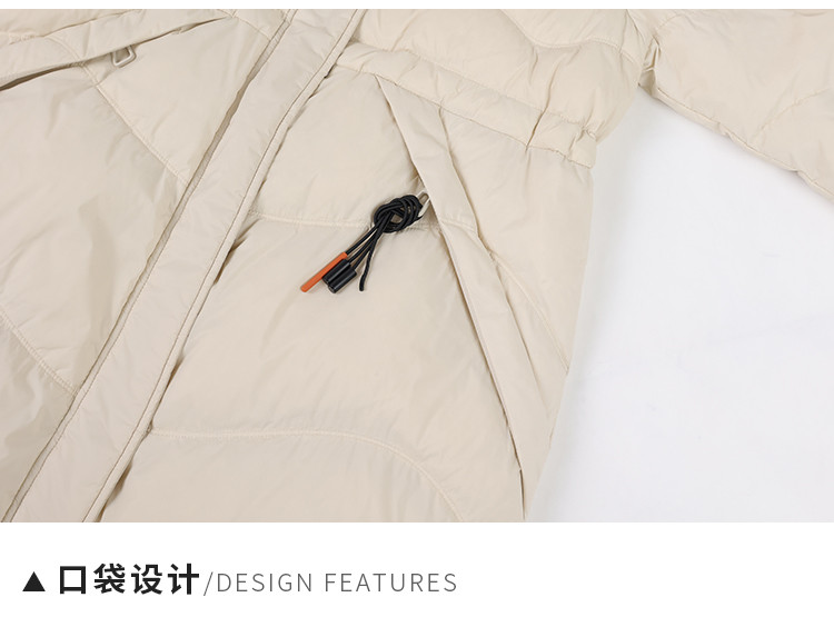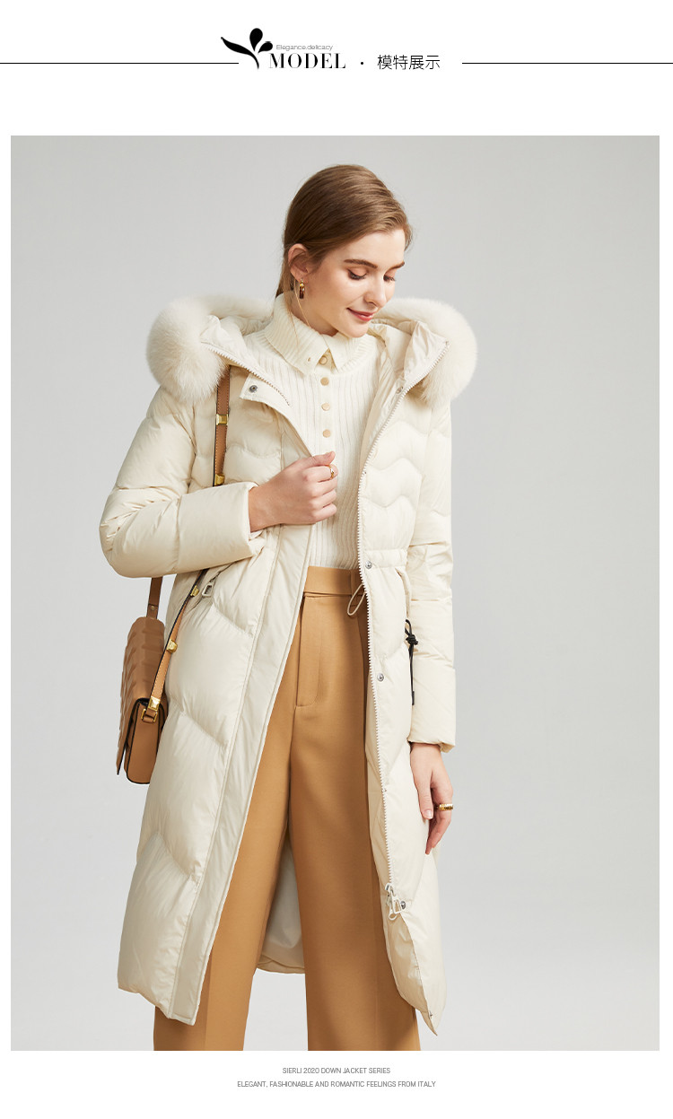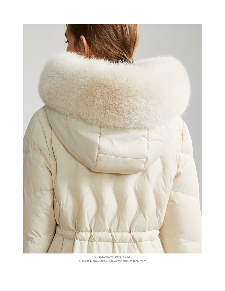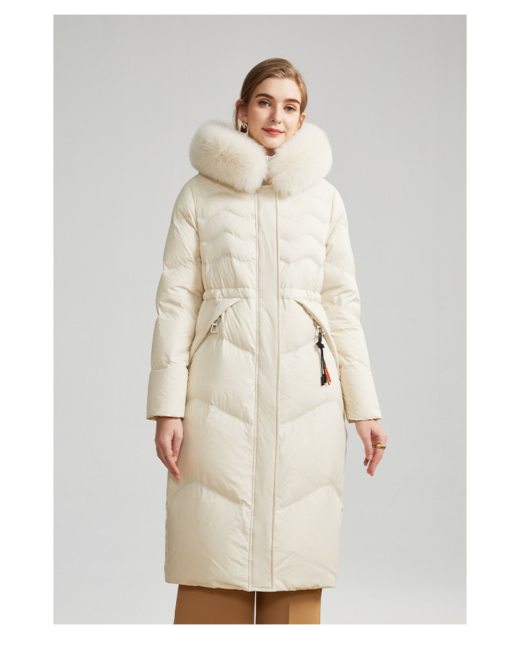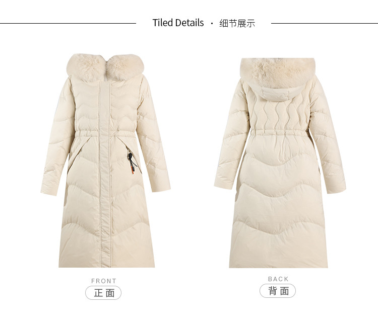 商品名称:女式防风袖柔软狐狸毛领收腰显瘦长款连帽保暖休闲羽绒服 082015