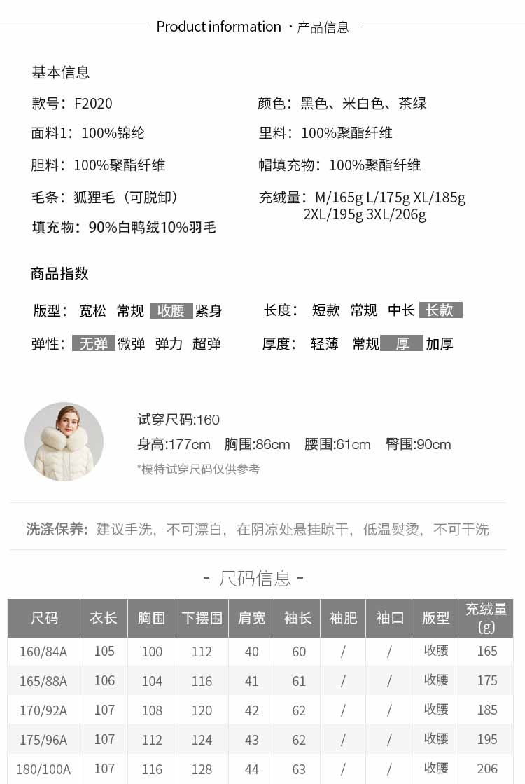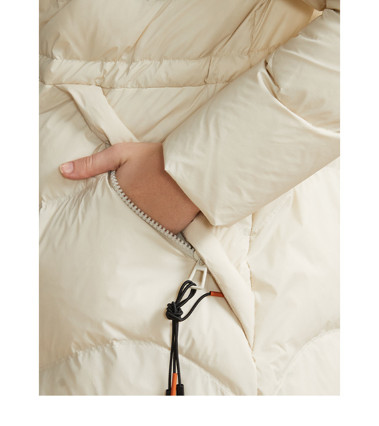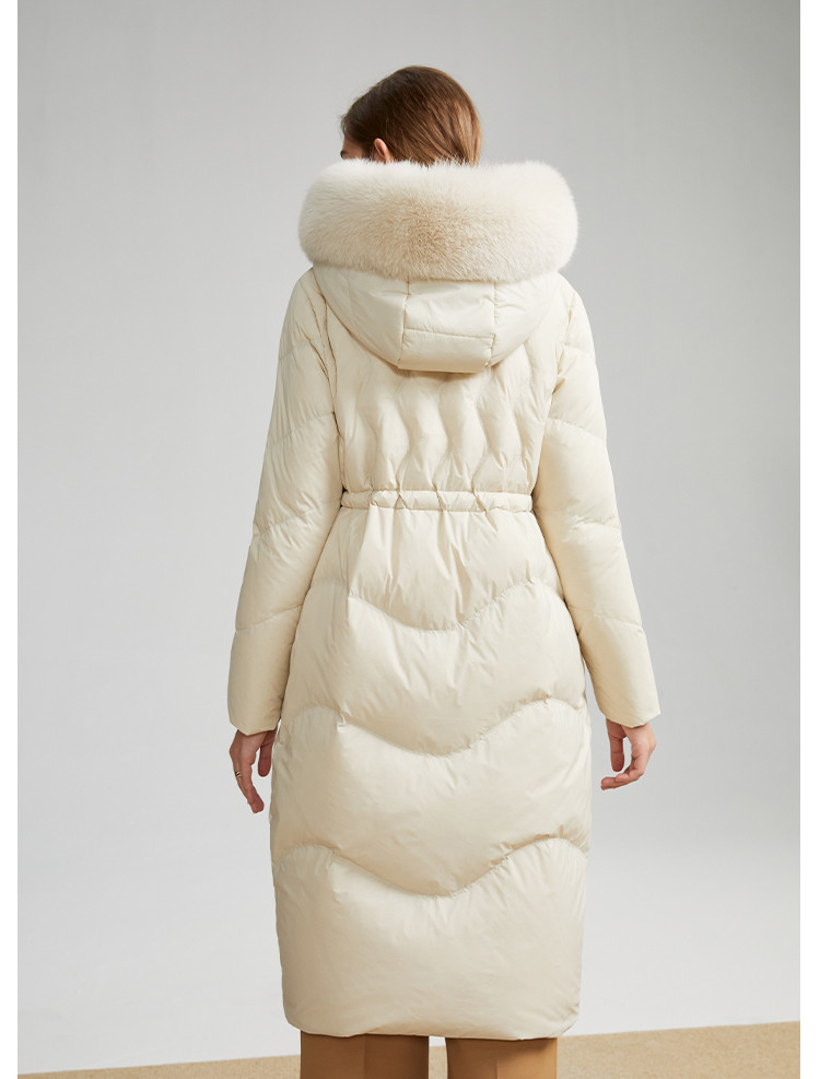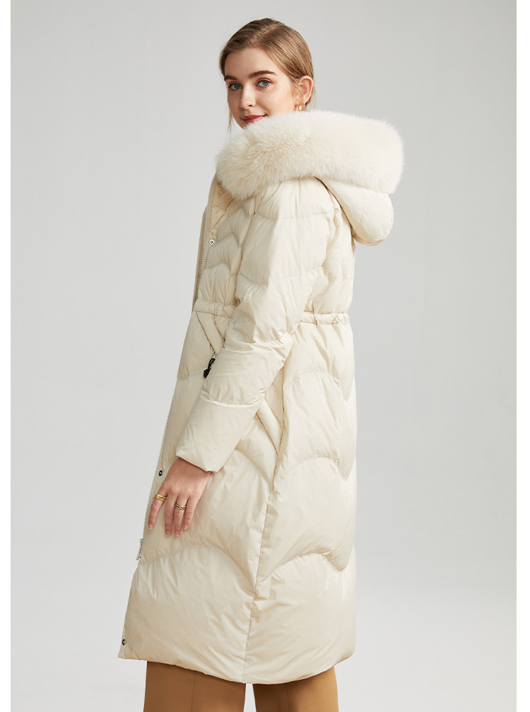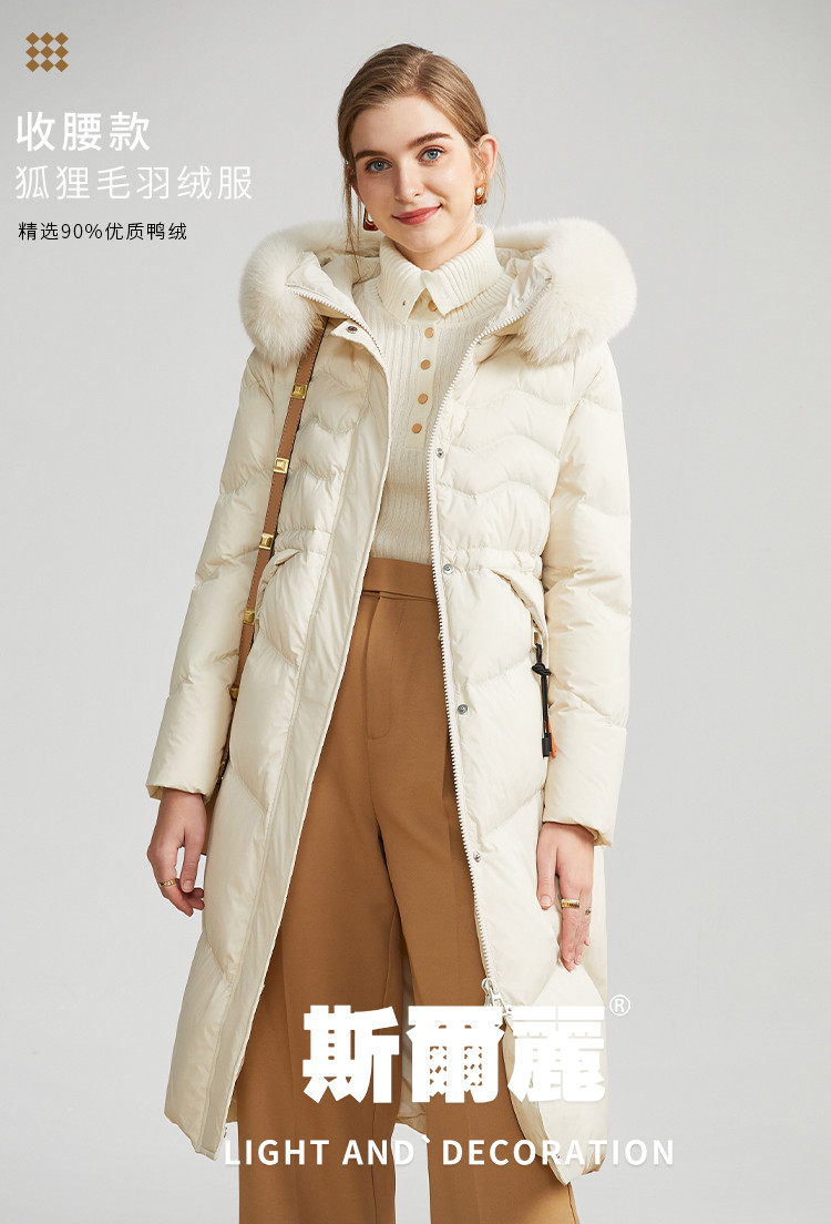商品名称:女式防风袖柔软狐狸毛领收腰显瘦长款连帽保暖休闲羽绒服 082015