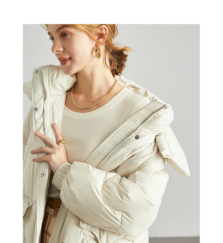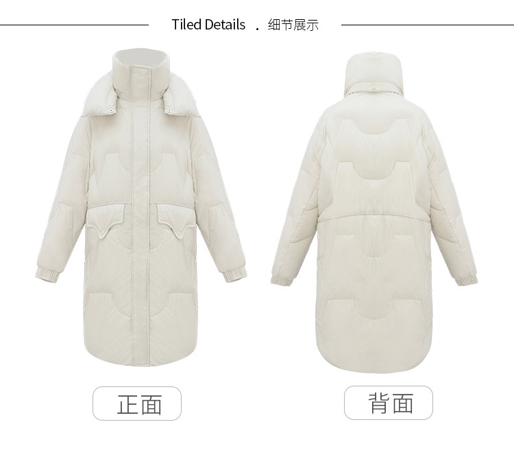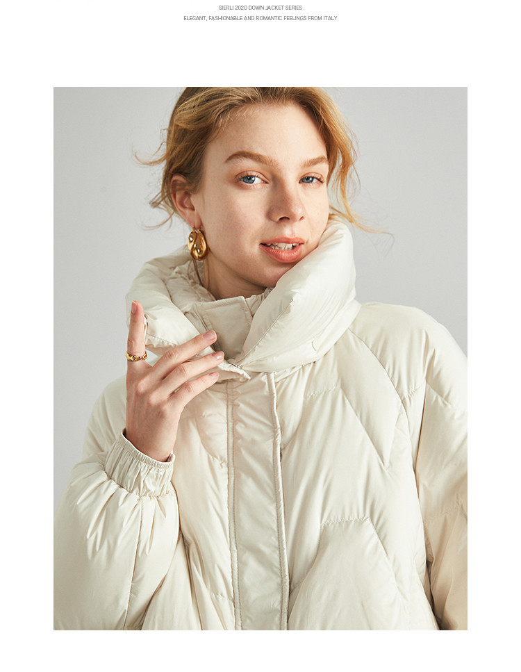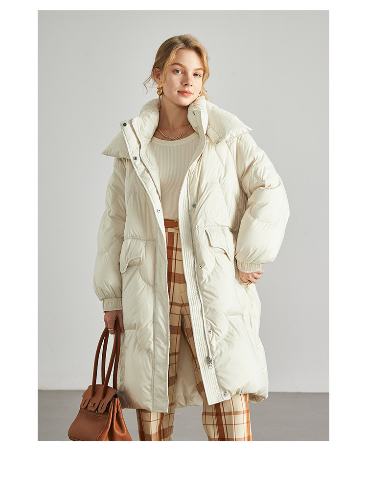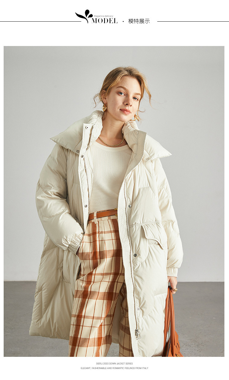 商品名称:女式双层立领优质90绒保暖宽松廓形休闲长款羽绒服 118431