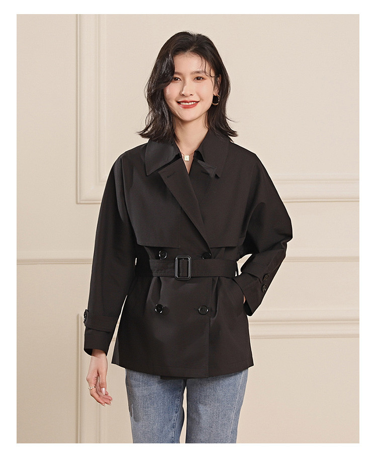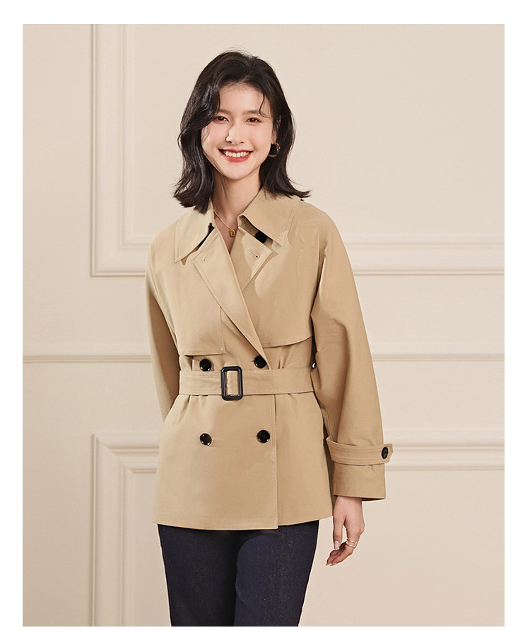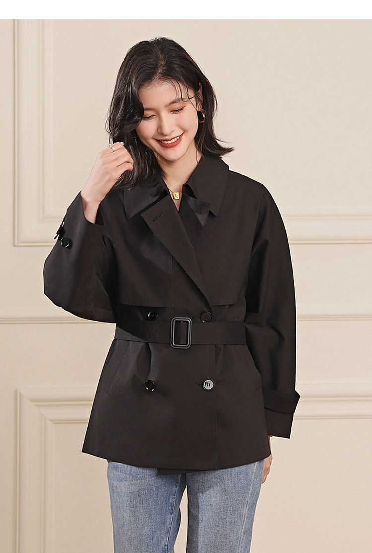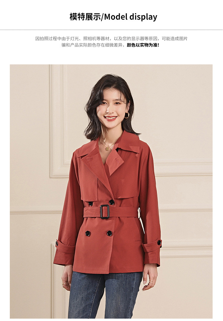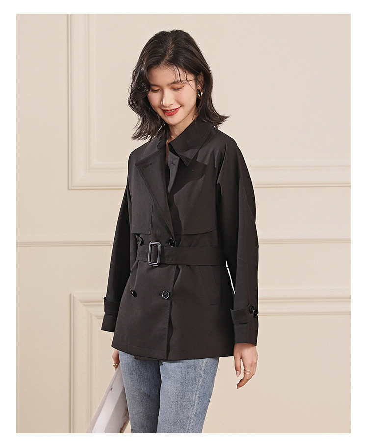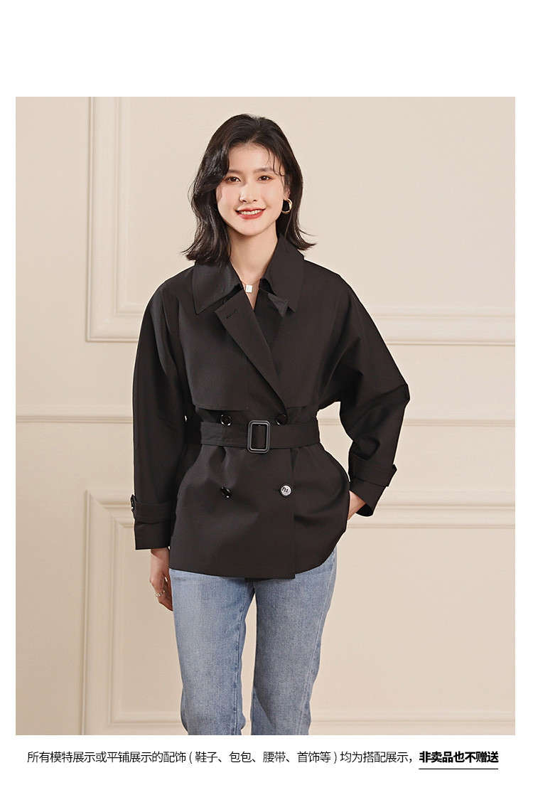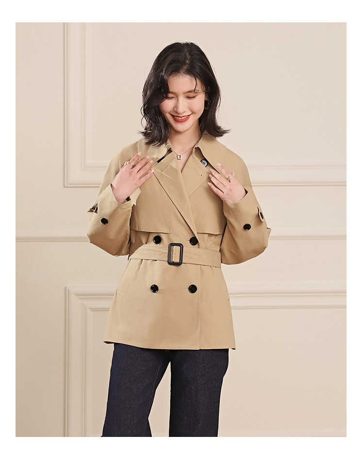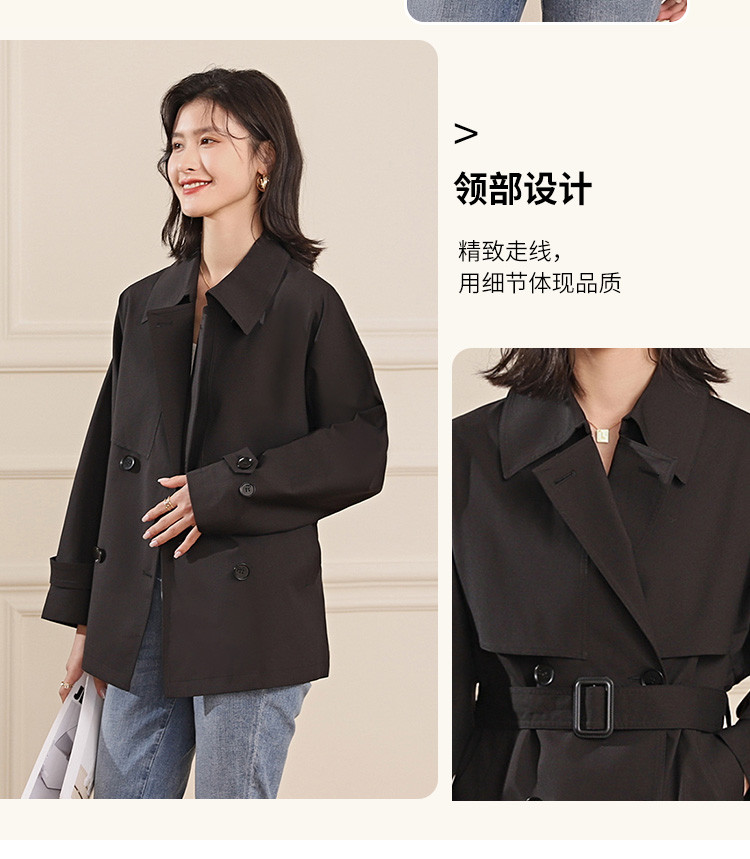 商品名称:春秋新款小个子韩版长袖双排扣短款侧插袋女式系带风衣外套 380127