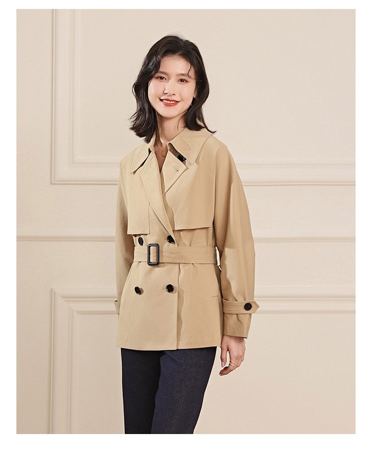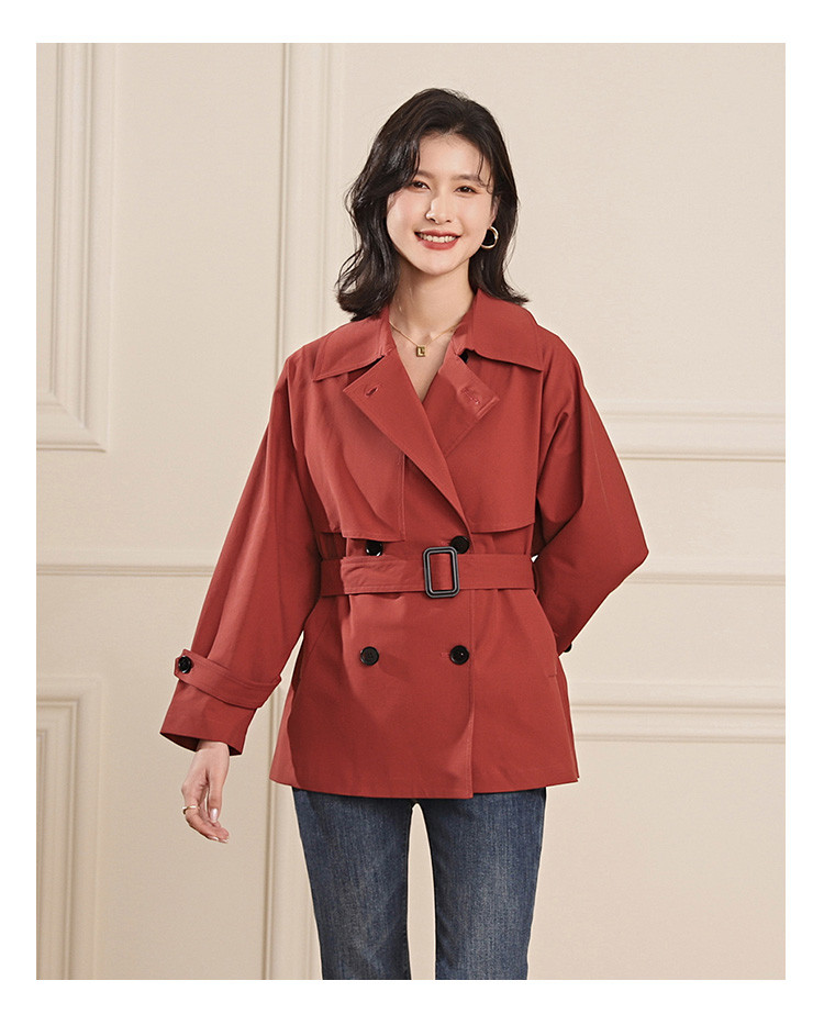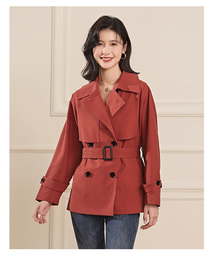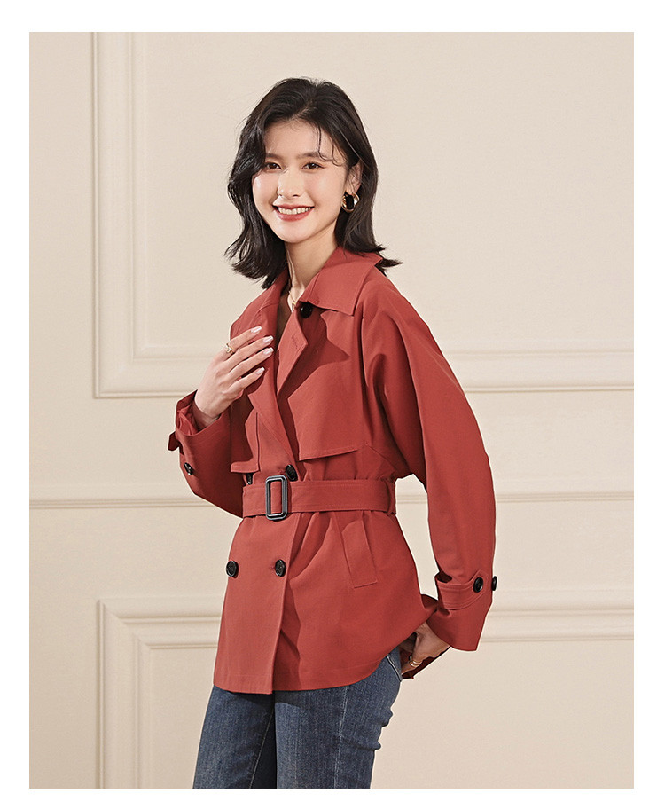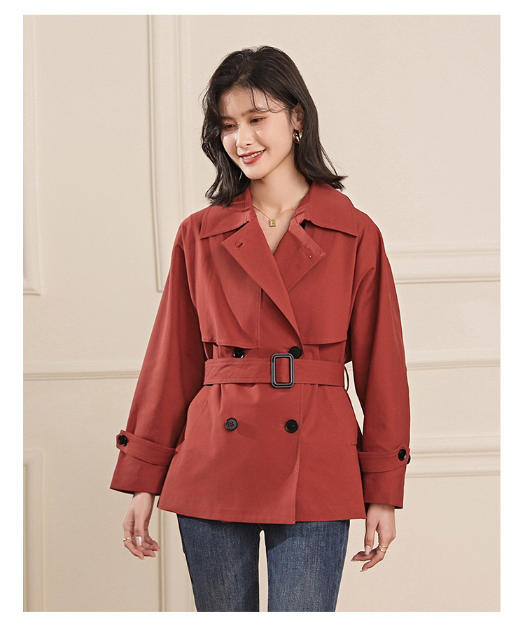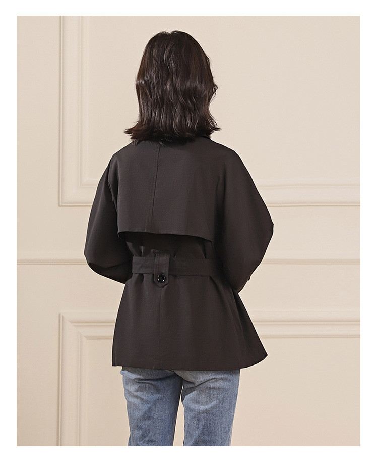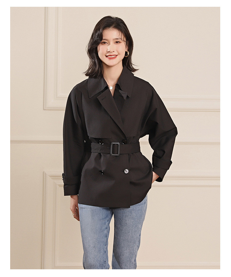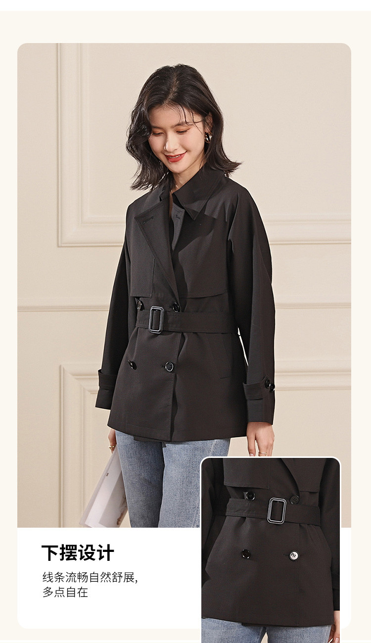 商品名称:春秋新款小个子韩版长袖双排扣短款侧插袋女式系带风衣外套 380127