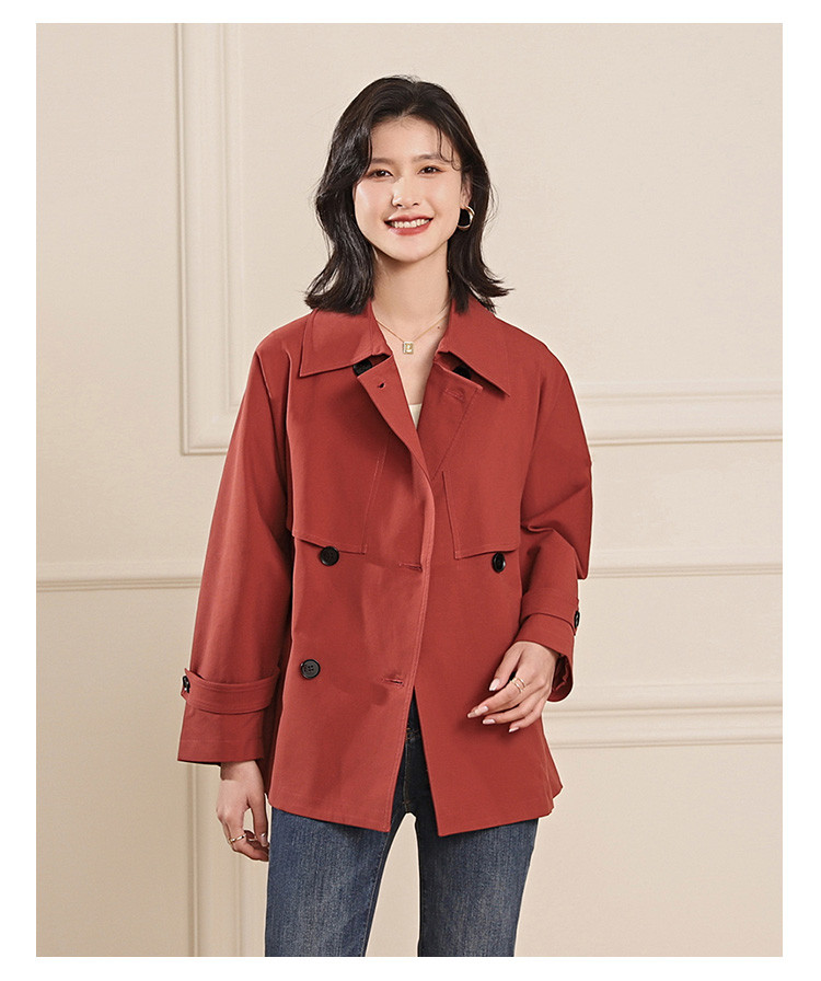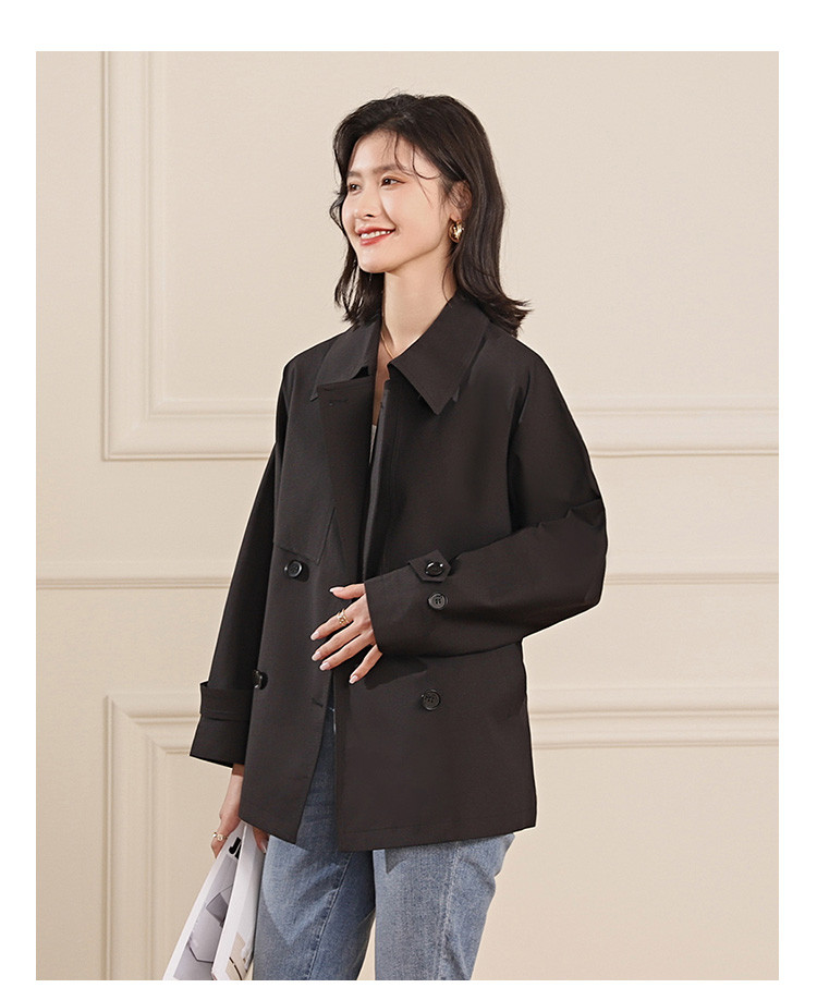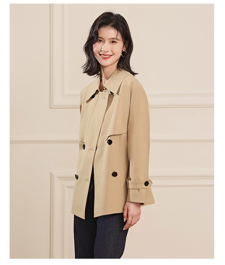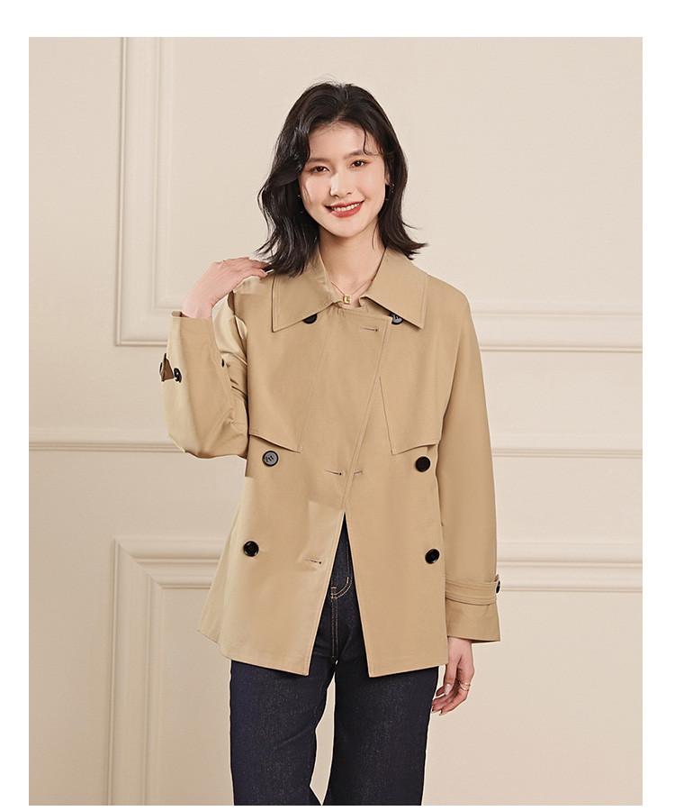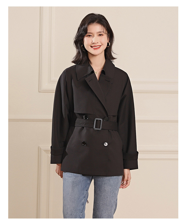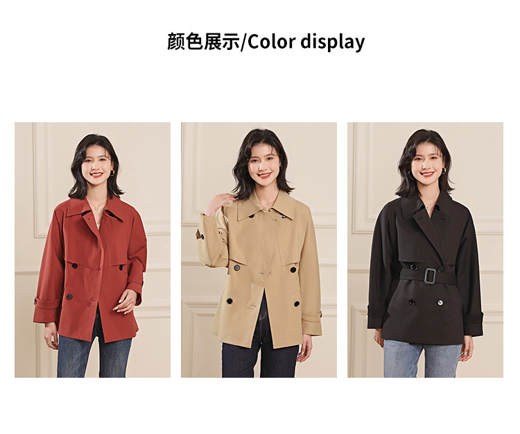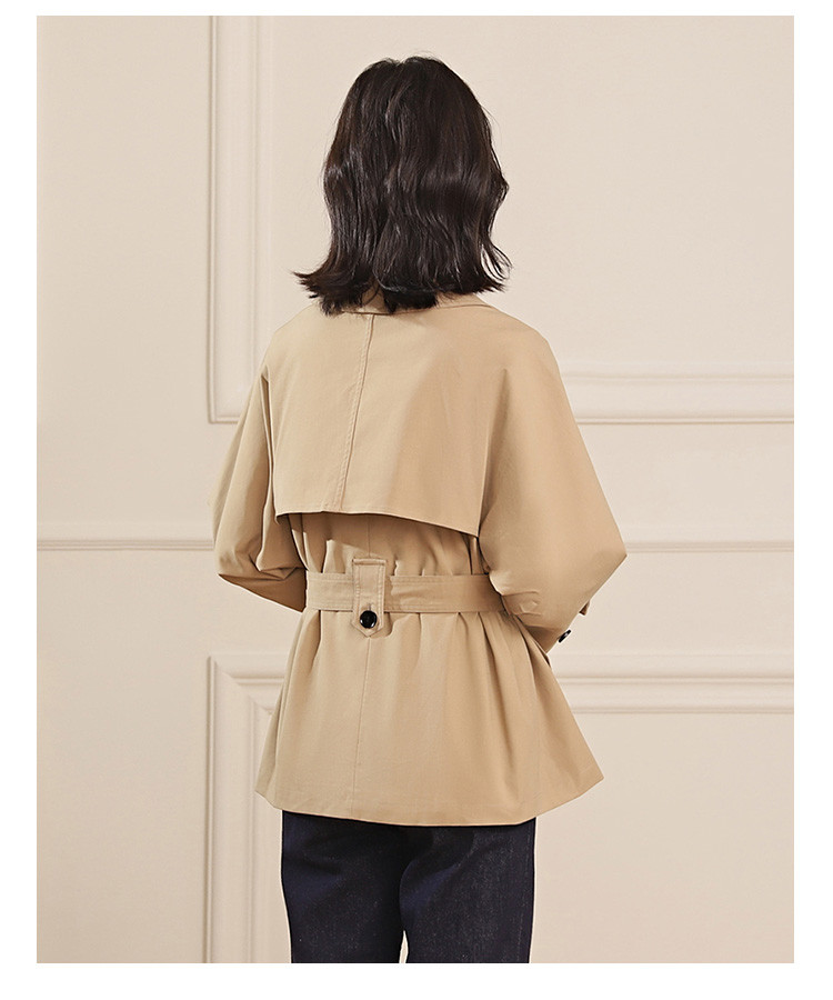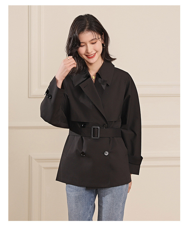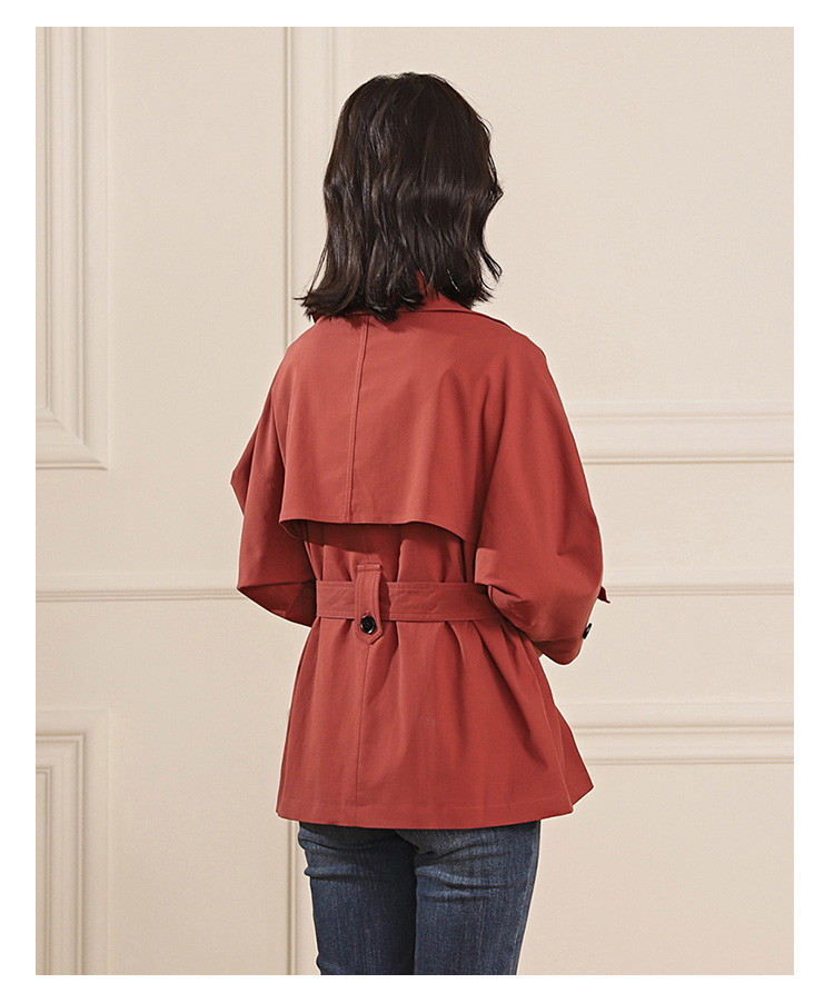 商品名称:春秋新款小个子韩版长袖双排扣短款侧插袋女式系带风衣外套 380127