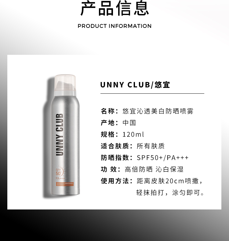 商品名称:unny club悠宜 沁透防晒喷雾120ml 面部身体通用 防隔离紫外线 清爽不油腻妆后可喷
