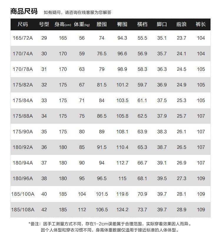 | 尺码 | 后浪(cm) | 腰围(cm) | 裤长(cm) | 前浪(cm) | 臀围(cm) | 号型 |