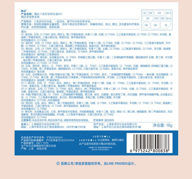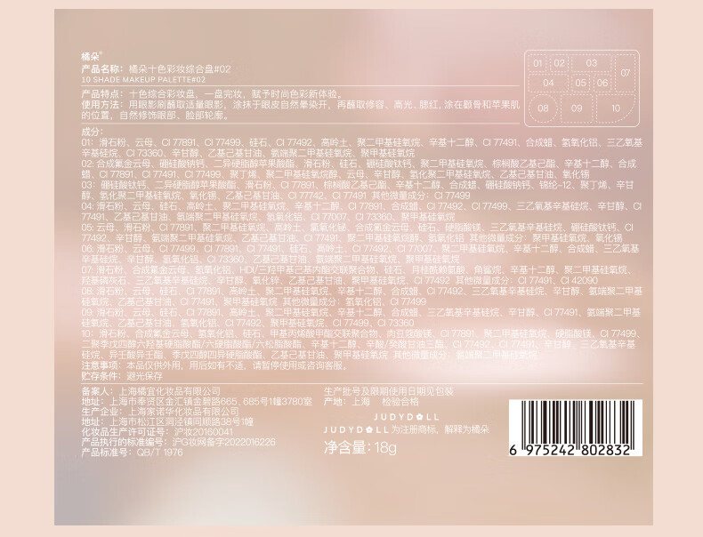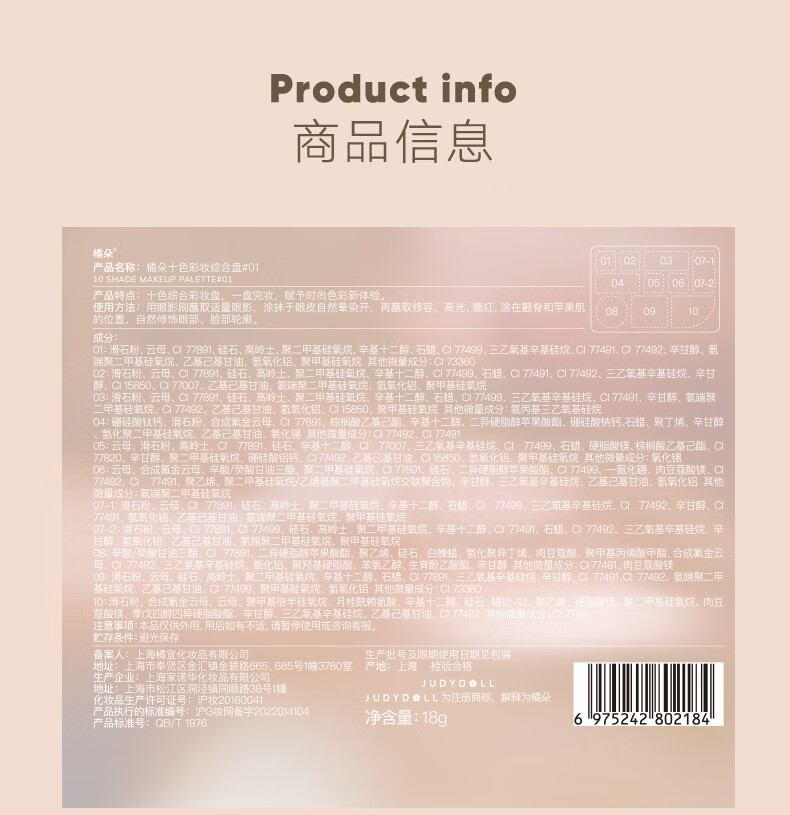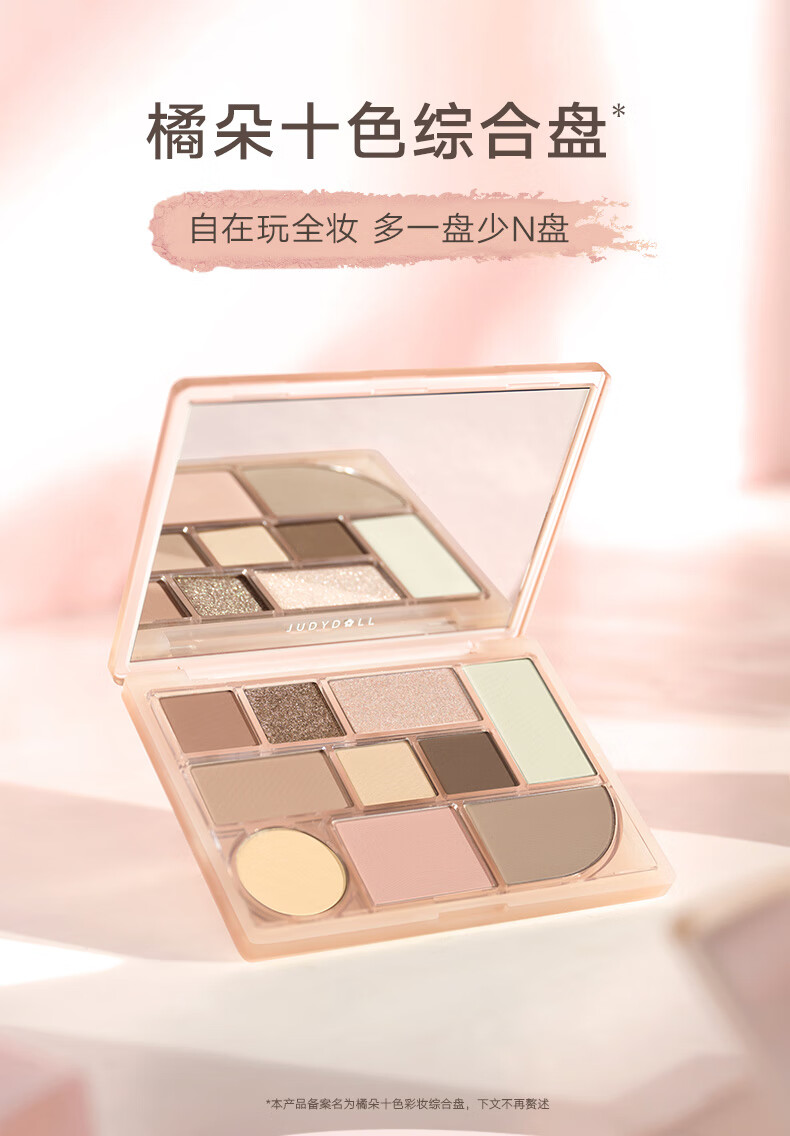 商品名称:Judydoll/橘朵 十色彩妆综合眼影盘 18g 腮红修容高光亮片易上色哑光细闪