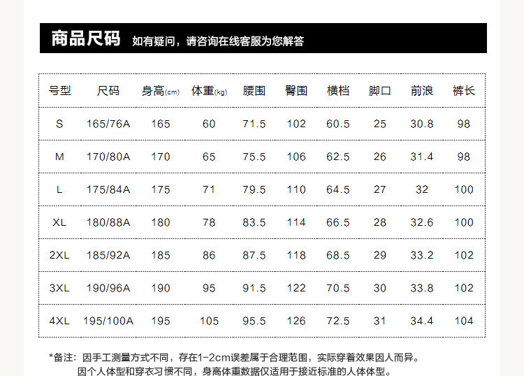 | 尺码 | 后浪(cm) | 腰围(cm) | 裤长(cm) | 前浪(cm) | 臀围(cm) | 号型 |