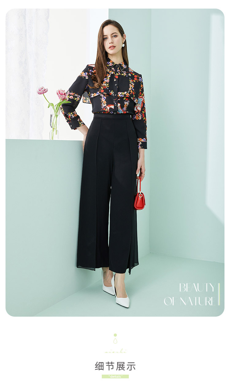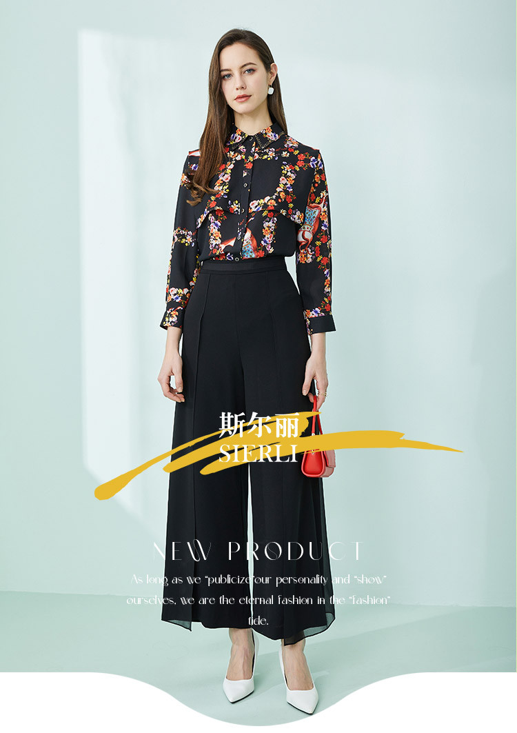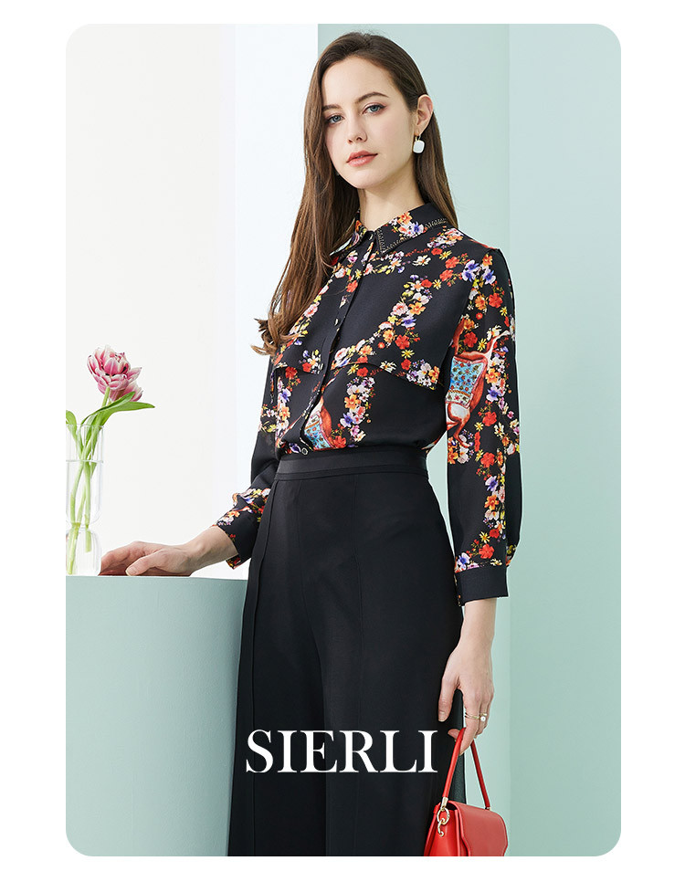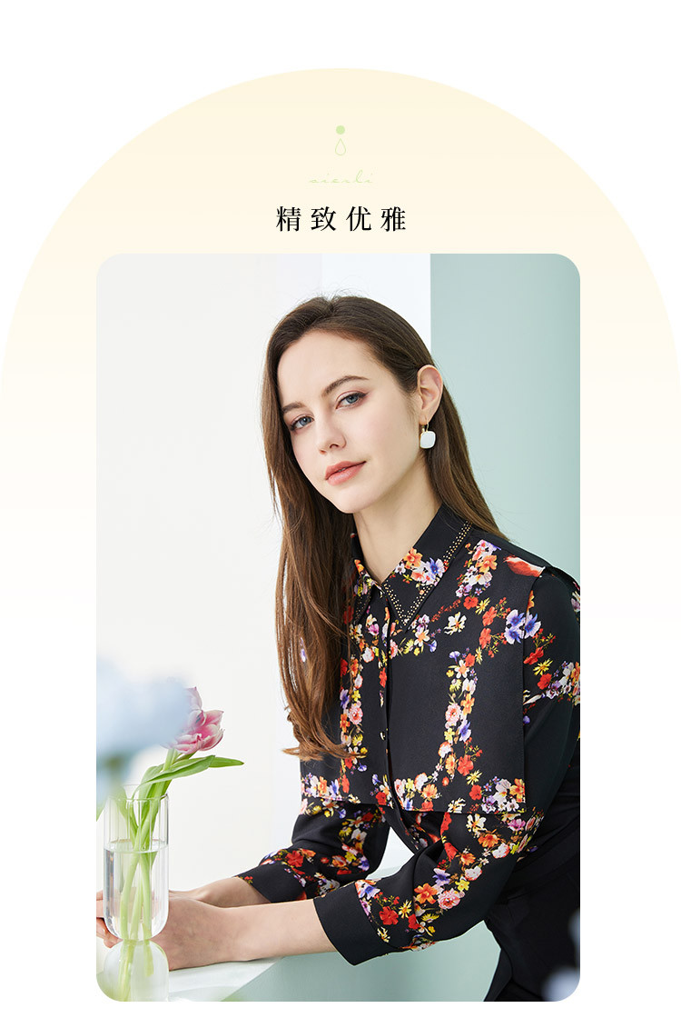 商品名称:商场同款春季复古印花叠层通勤淑女范翻领长袖衬衣 737503