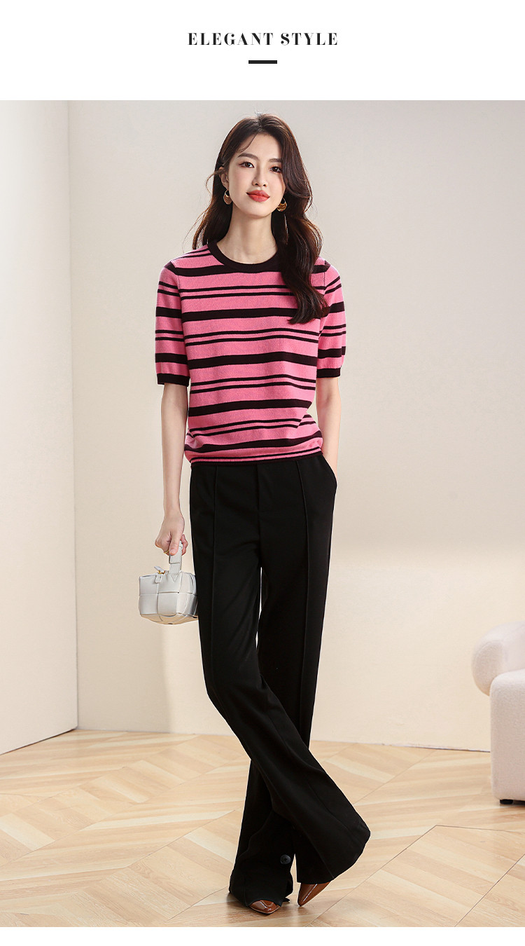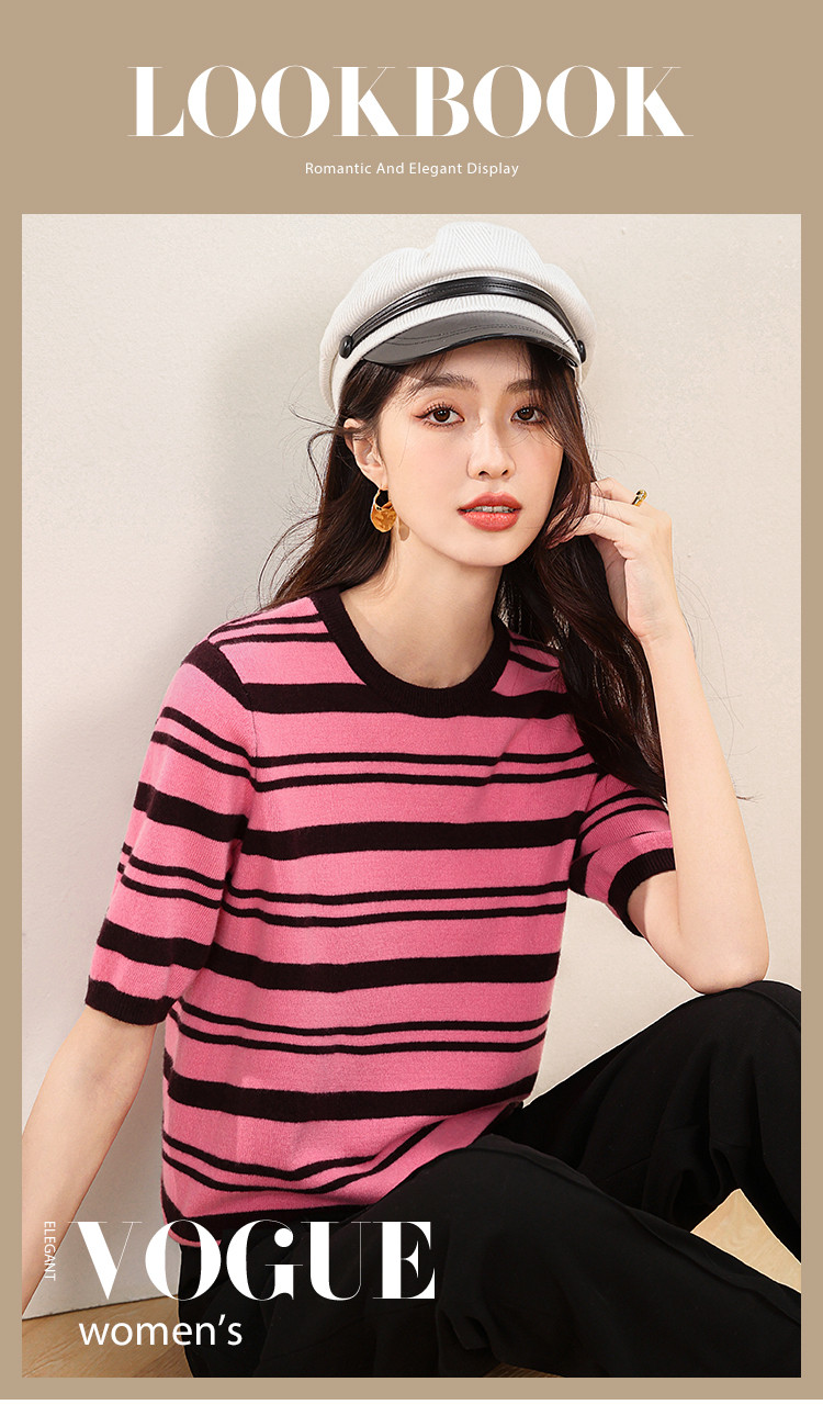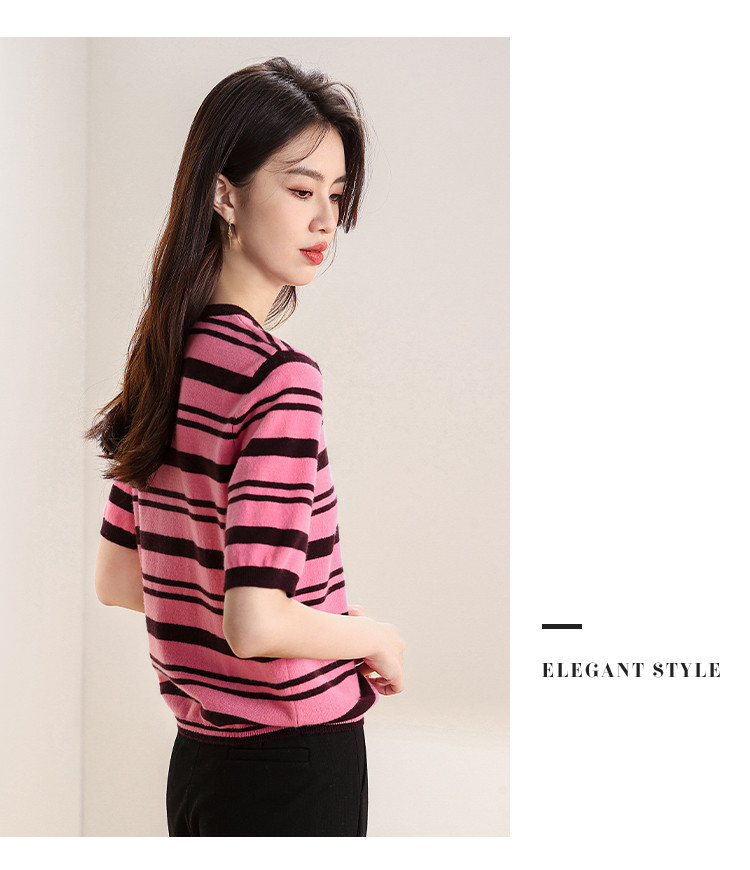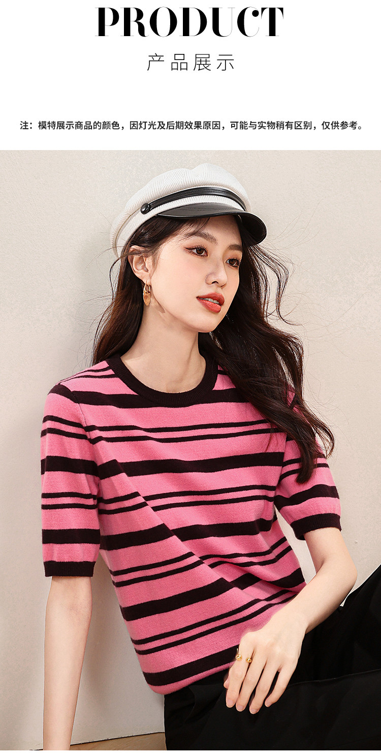 商品名称:撞色条纹圆领短袖100%羊毛上衣女式针织衫T恤 887059