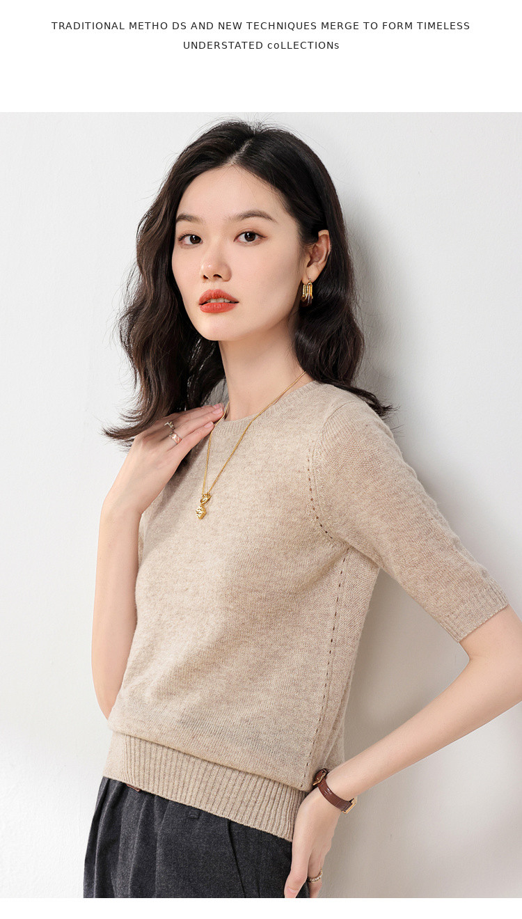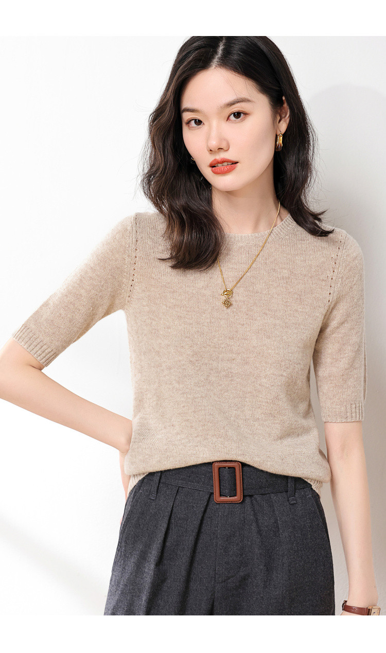 【羊毛混纺】纯色圆领短袖T恤套衫简约百搭针织打底衫毛衣线衫 672915