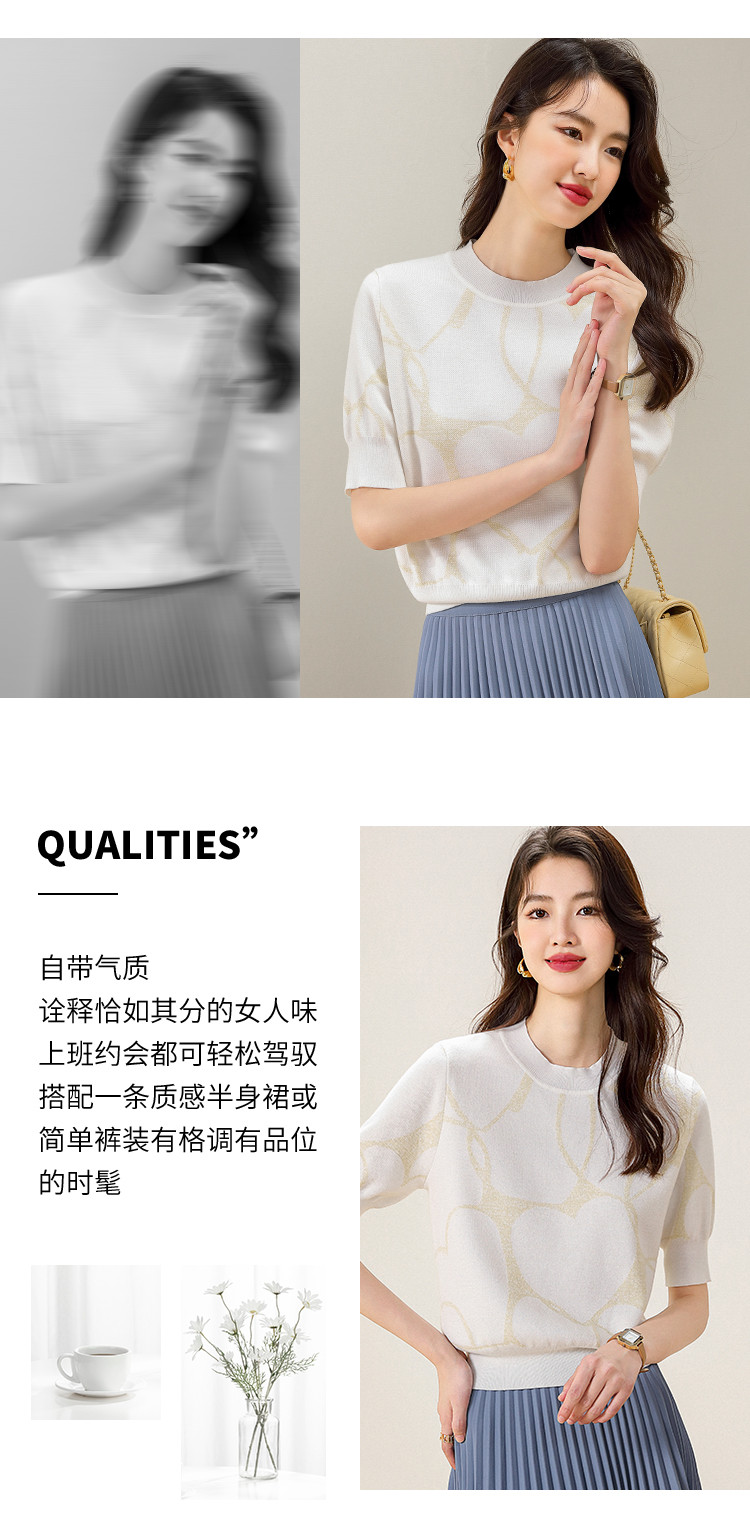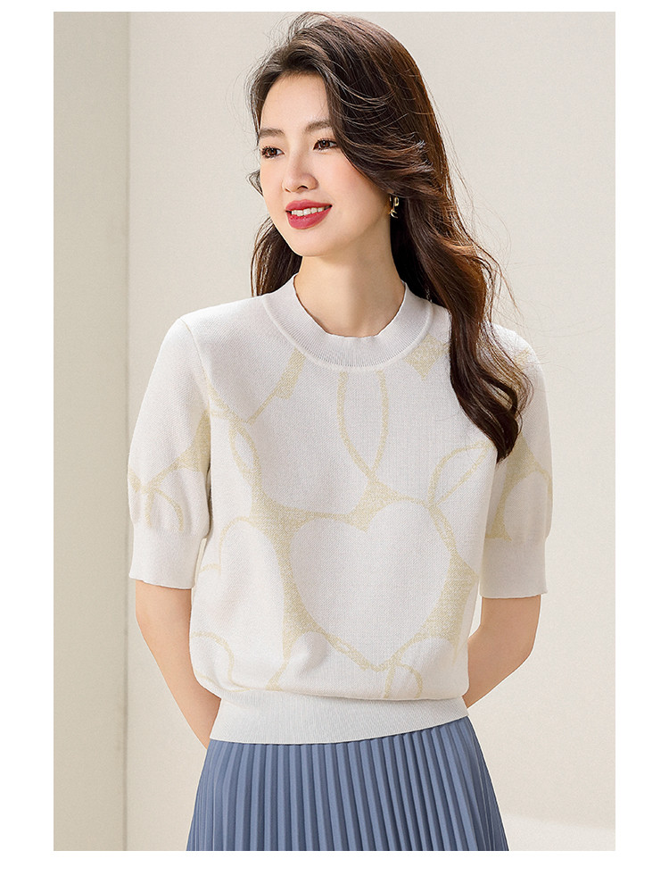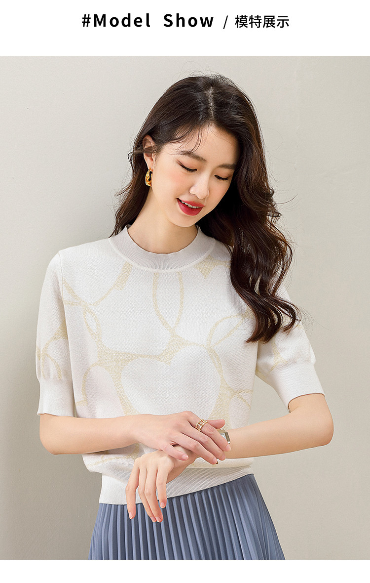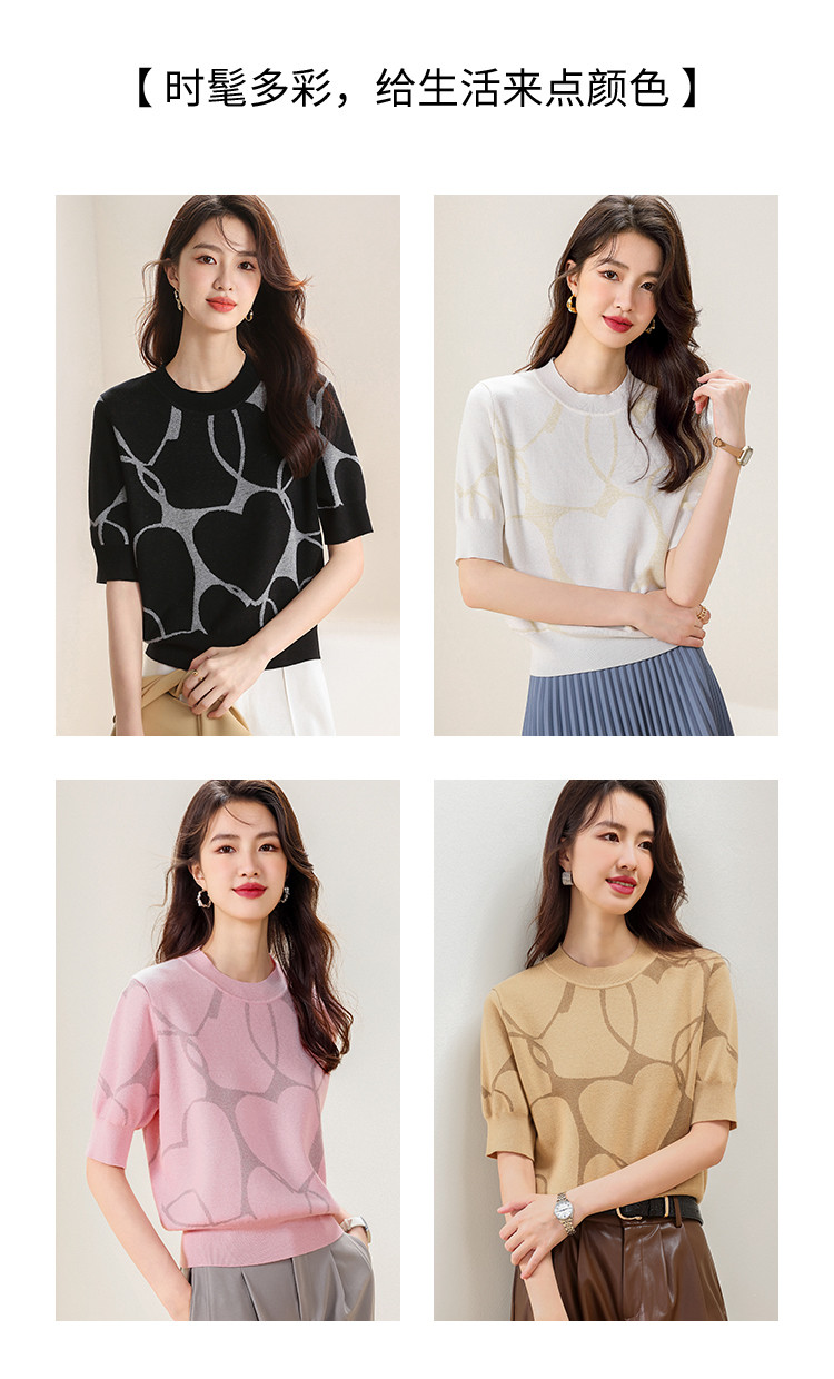 商品名称:圆领爱心提花含桑蚕丝针织打底衫短袖T恤针织衫女 715347