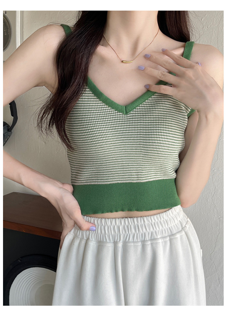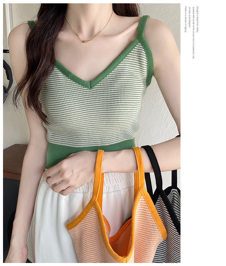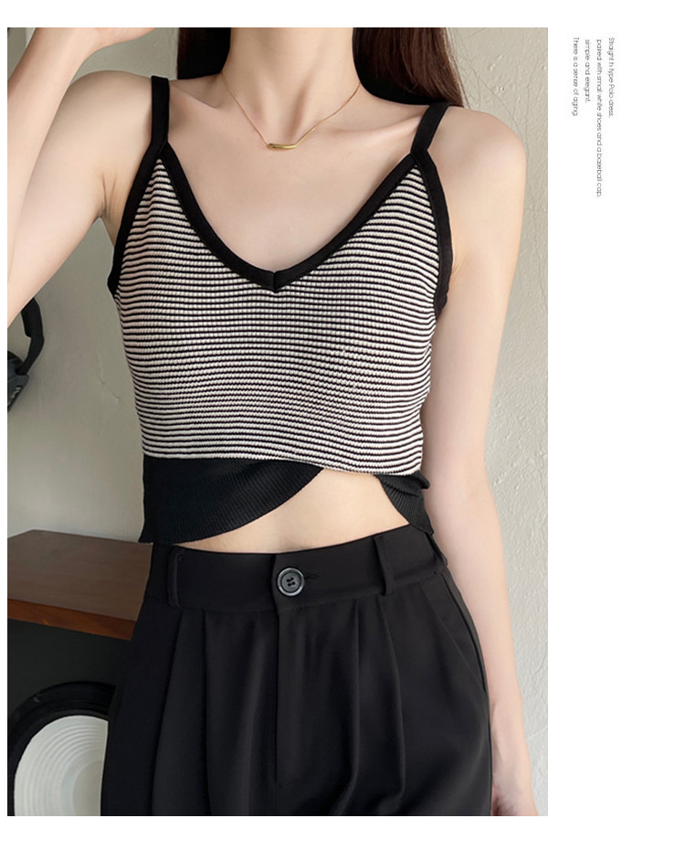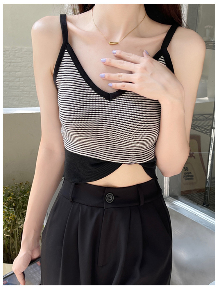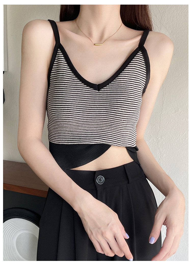 V领条纹针织吊带背心女内搭设计感小众外穿短款上衣 429123