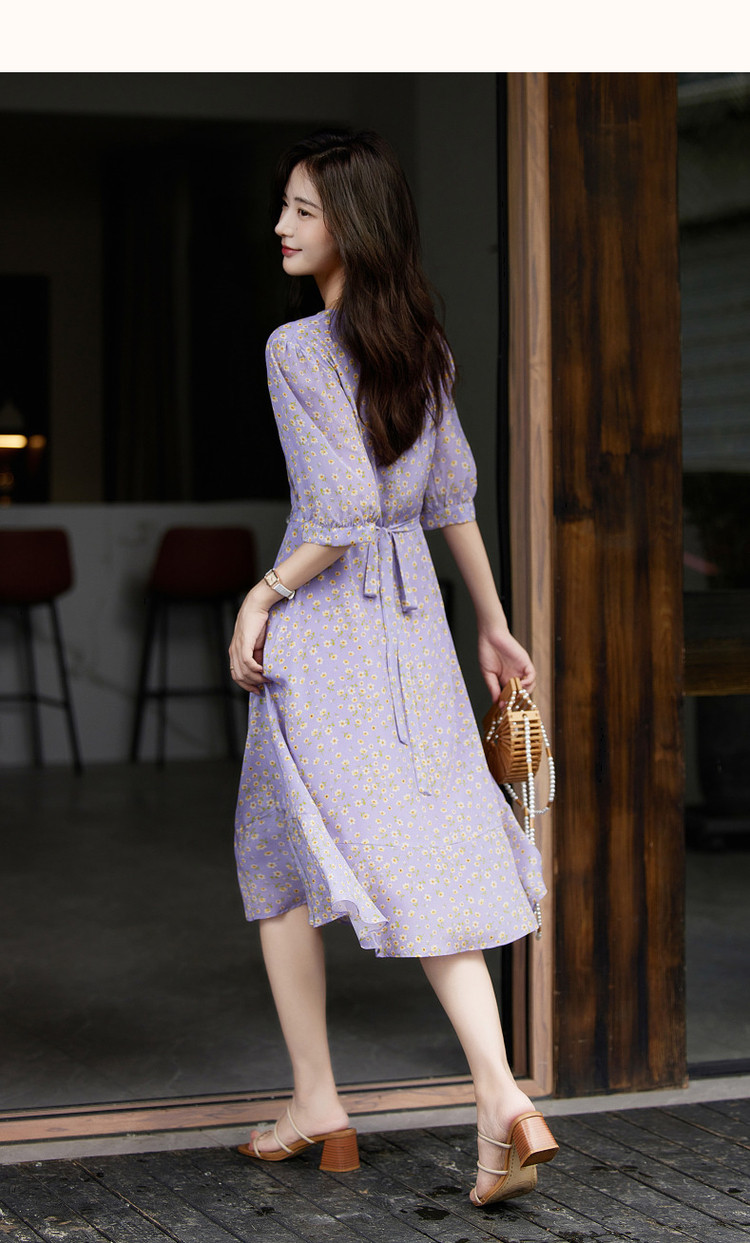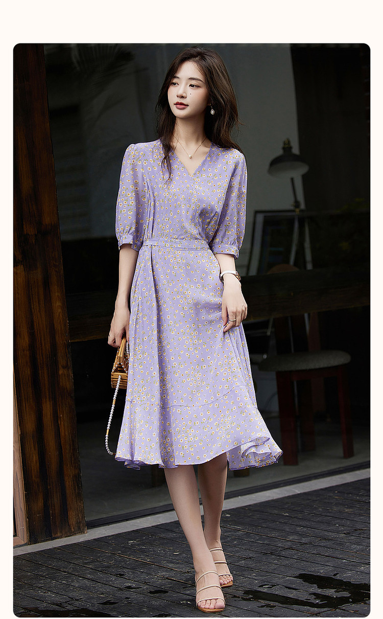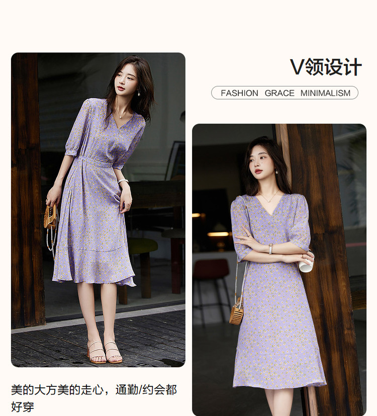 商品名称:【真丝收藏家】春呼吸感桑蚕丝V领印花性感鱼尾连衣裙女 339329