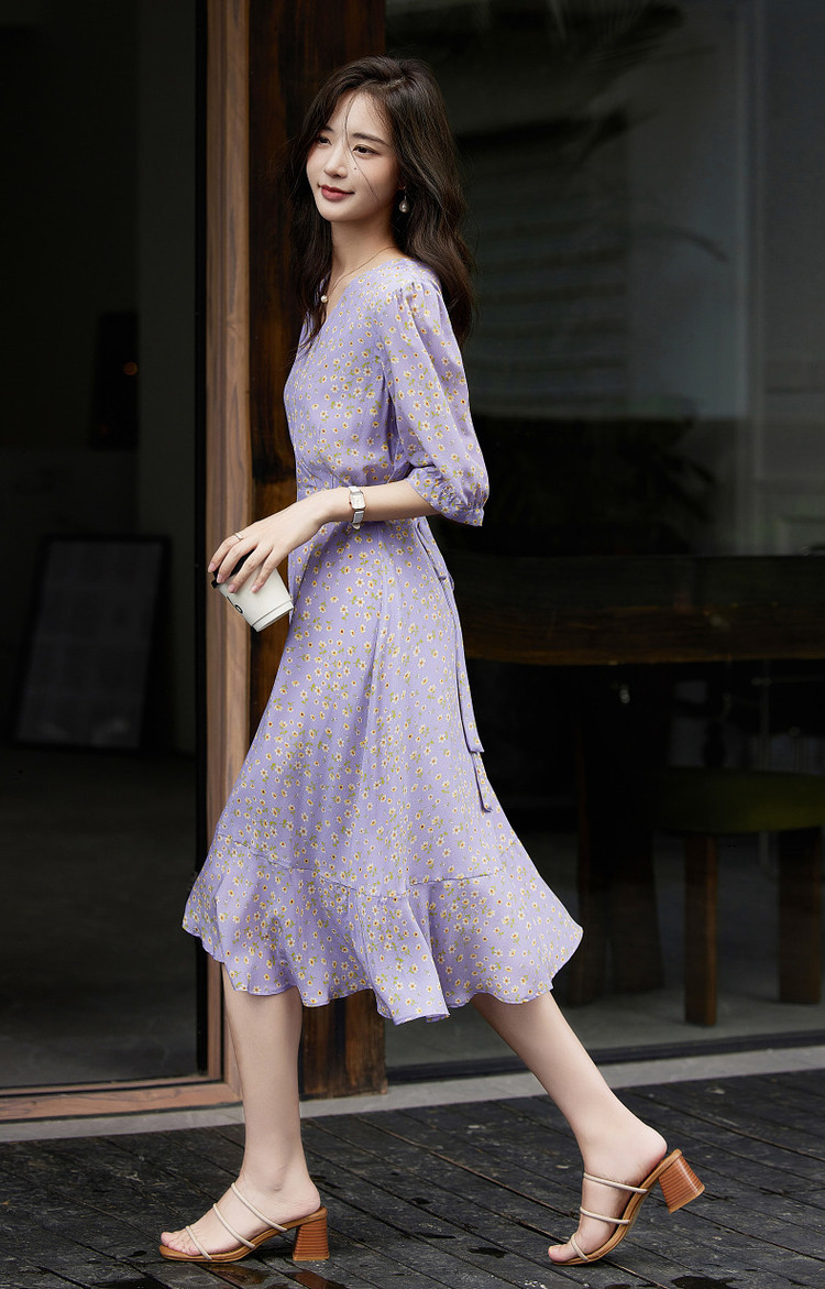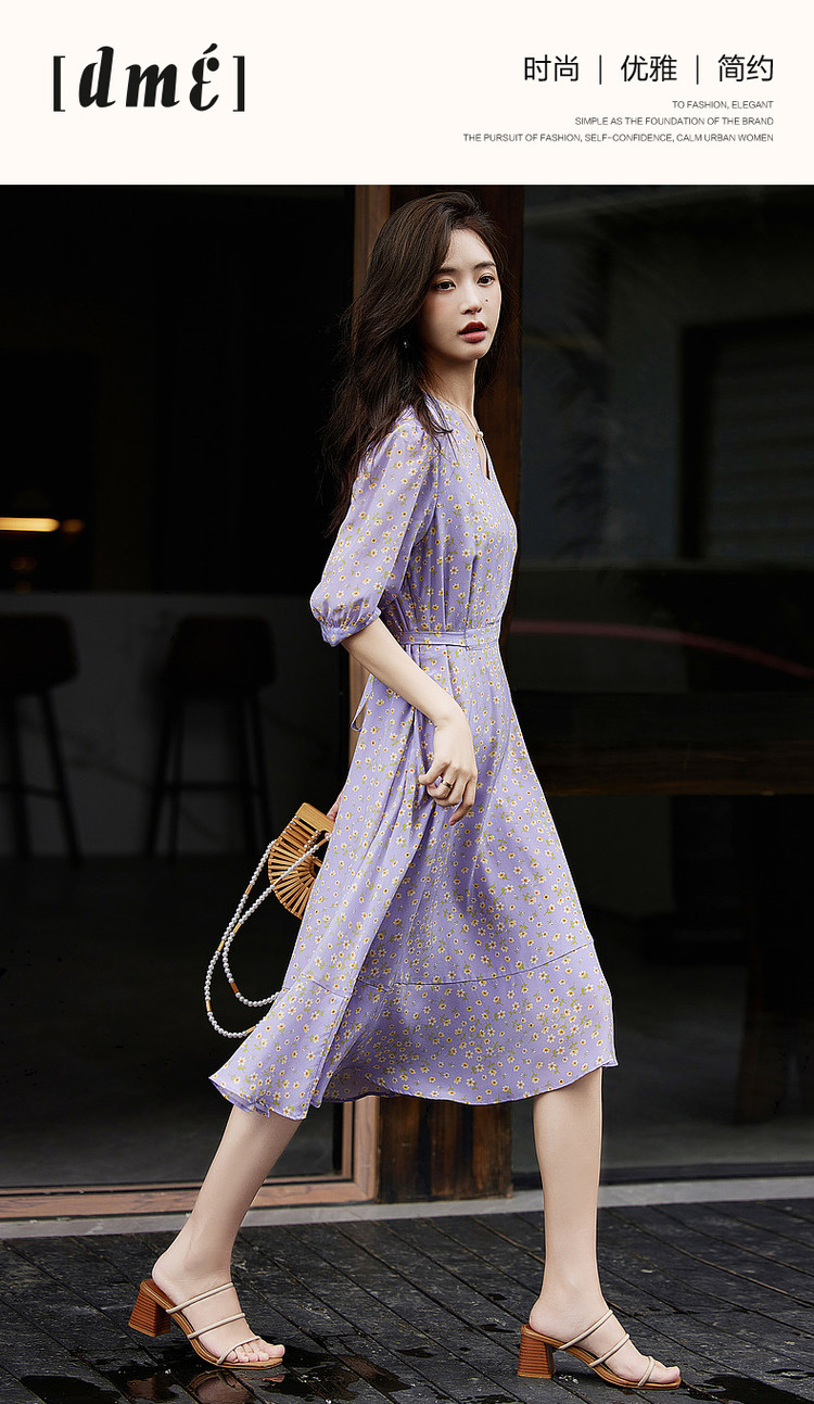 连衣裙圆领收腰七分袖拼接长裙通勤显瘦 661457