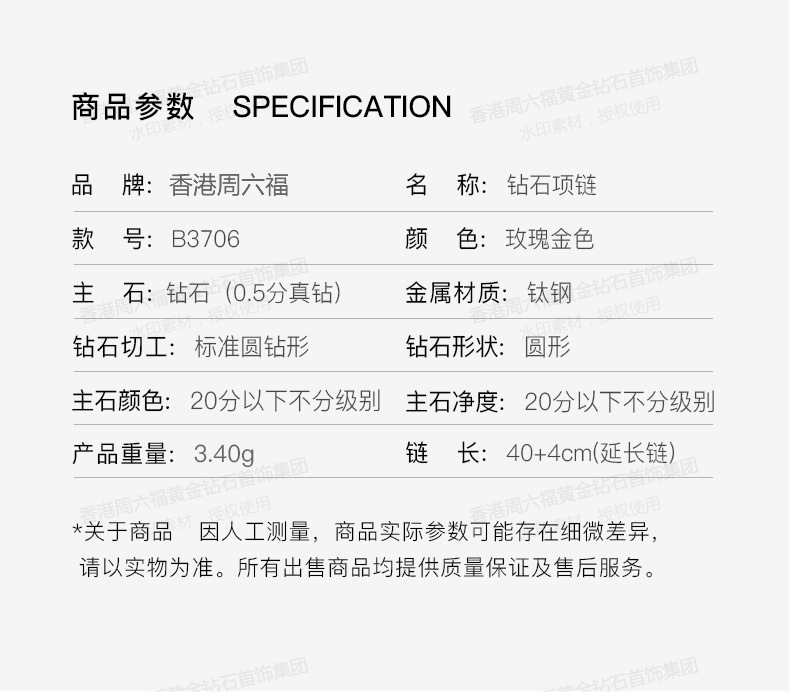 规格:链长约400mm,净重约2克 钻石规格:1分南非真钻 贵金属范围:18KGP