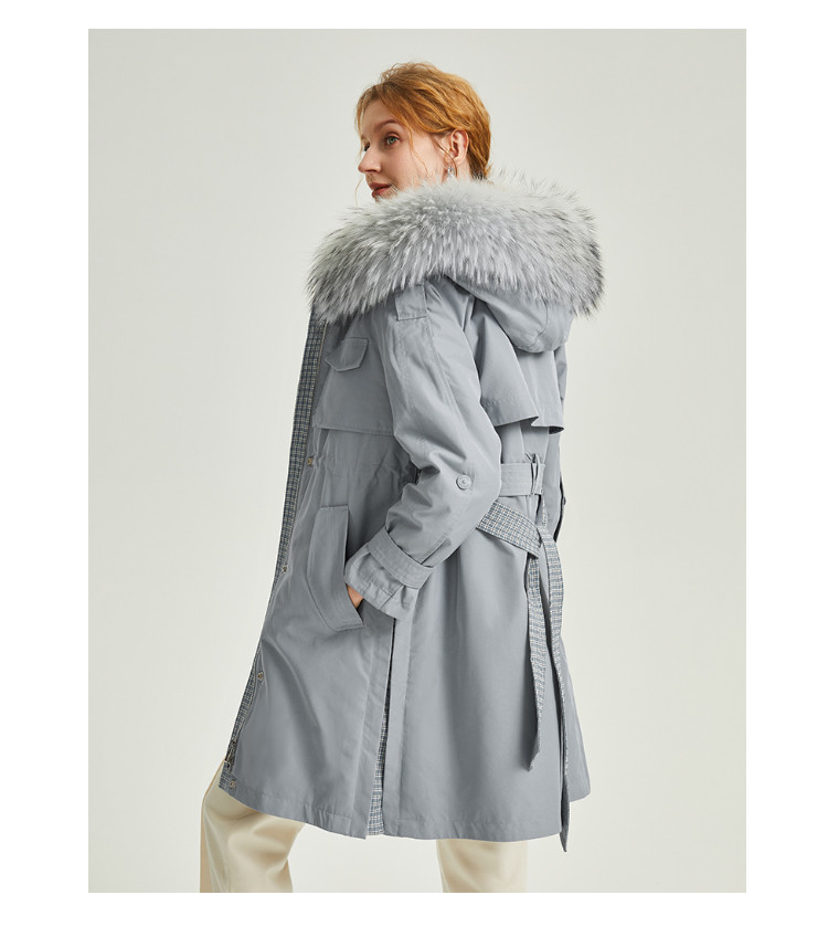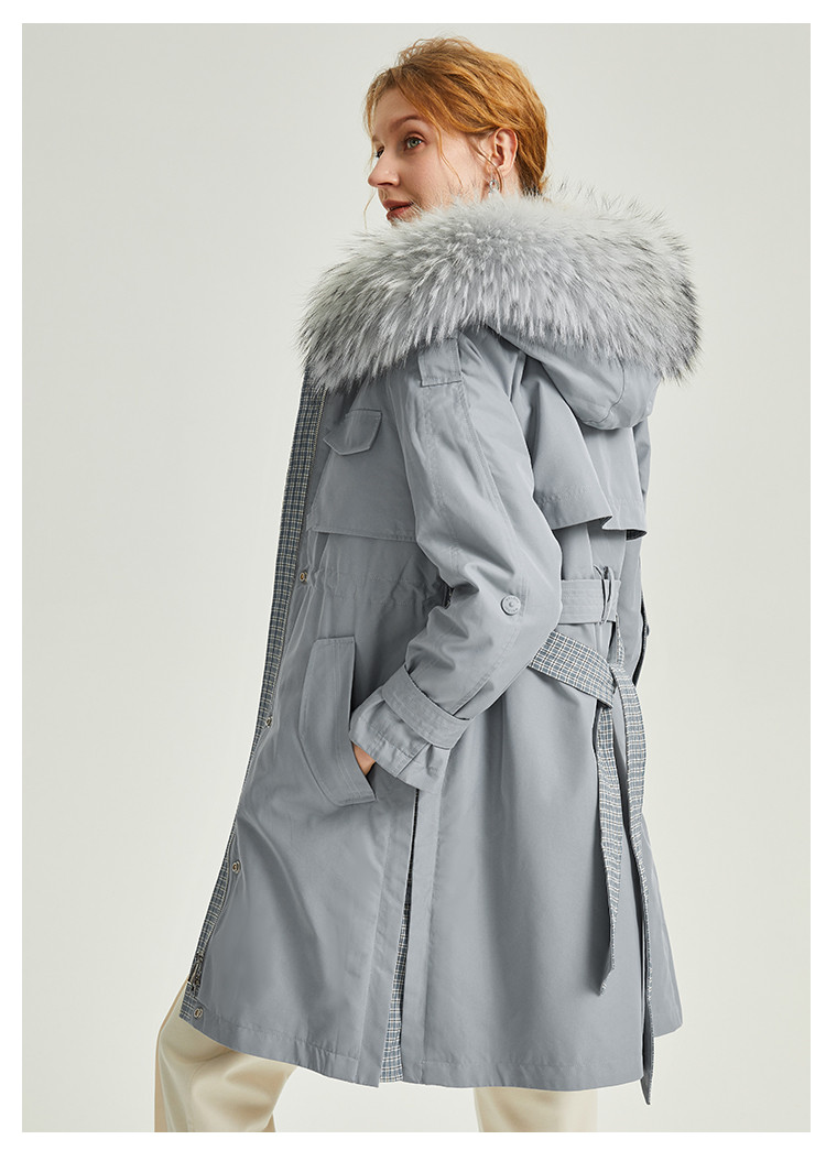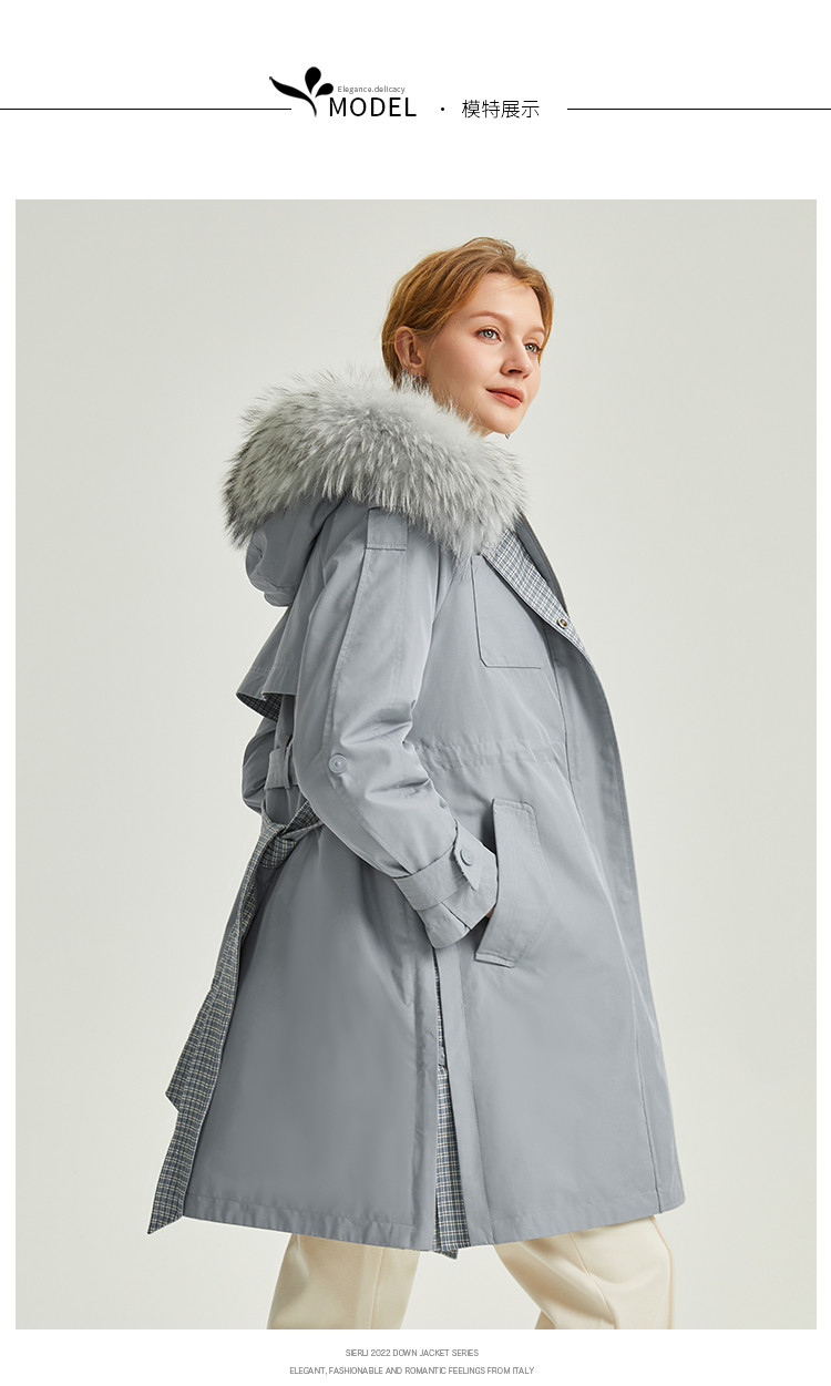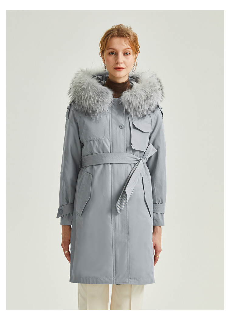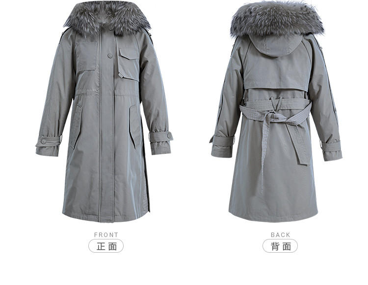 商品名称:秋冬貉子毛领派克服女士休闲连帽收腰中长款工装羽绒服 668703