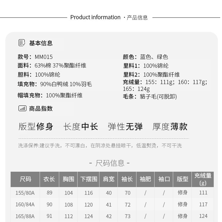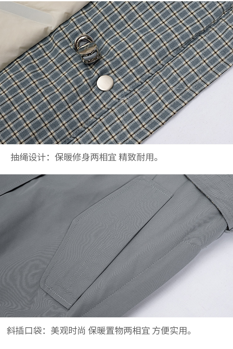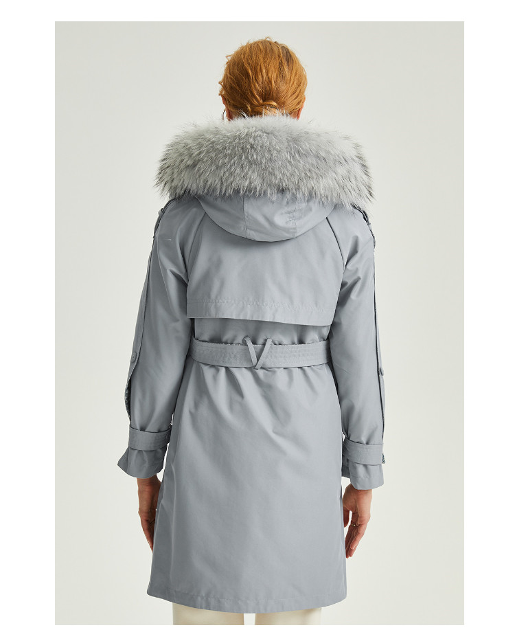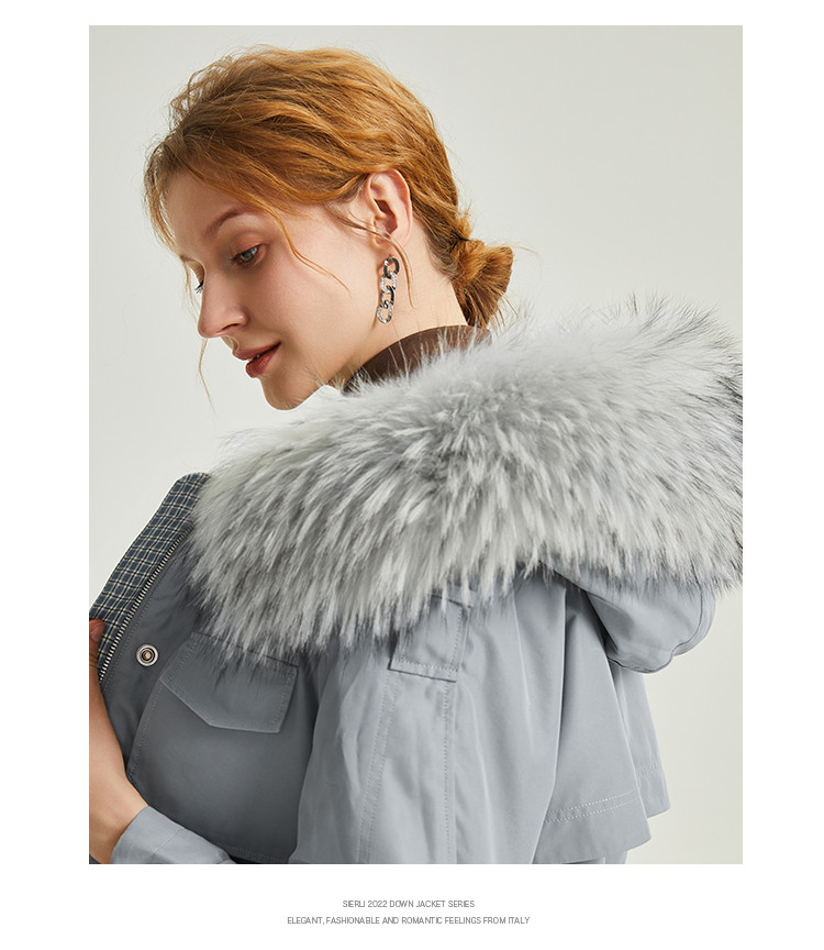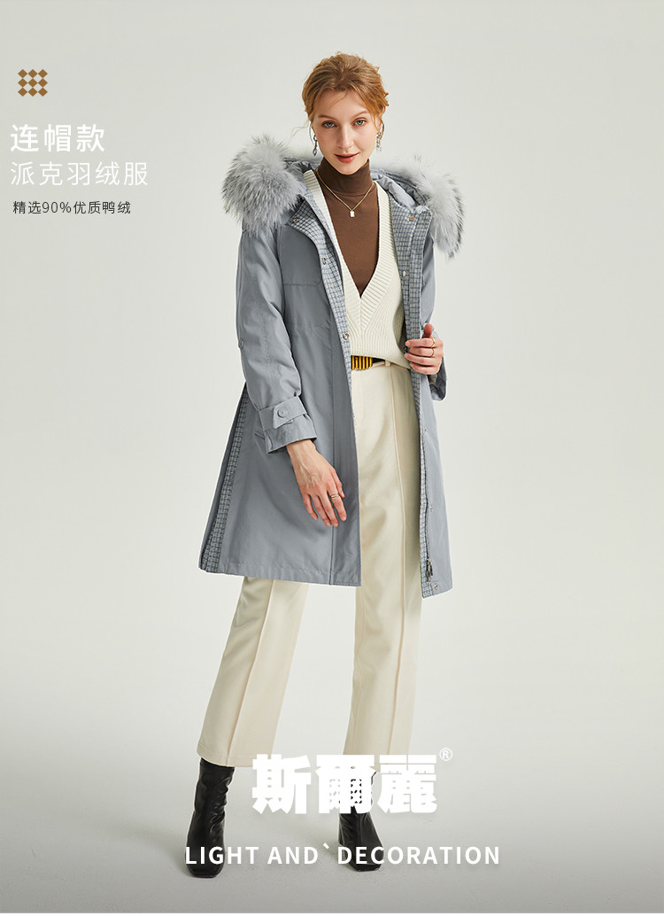 商品名称:秋冬貉子毛领派克服女士休闲连帽收腰中长款工装羽绒服 668703