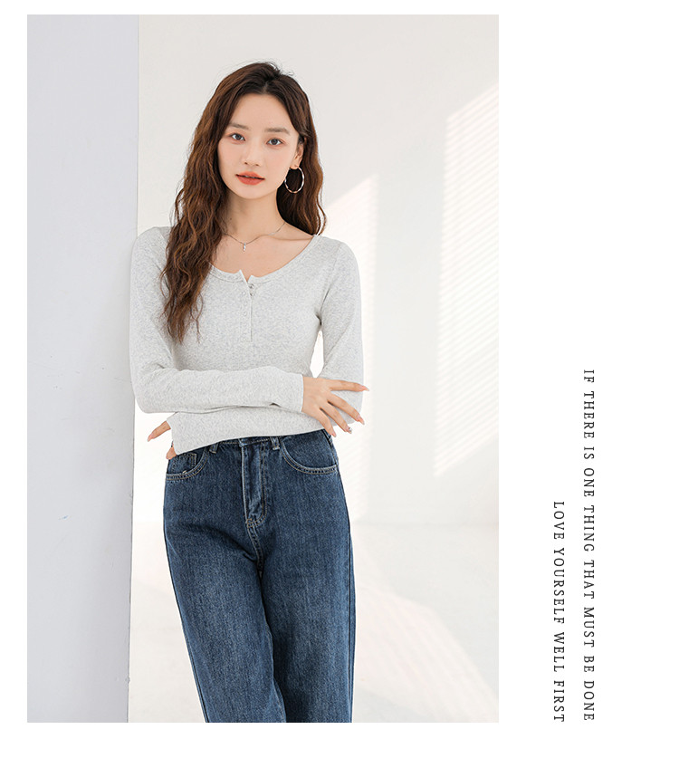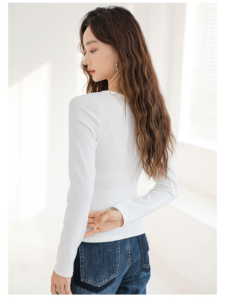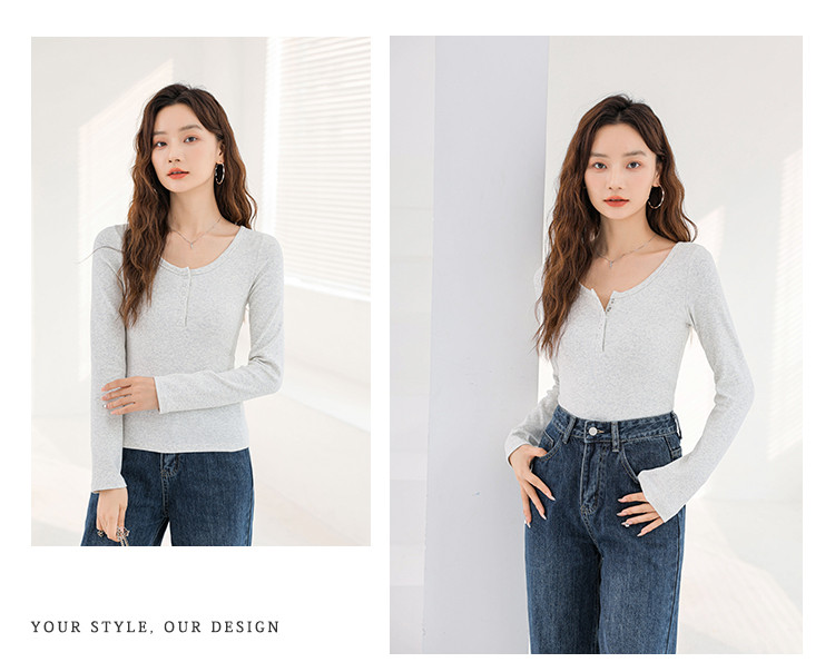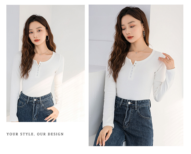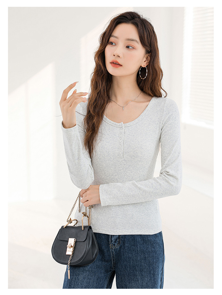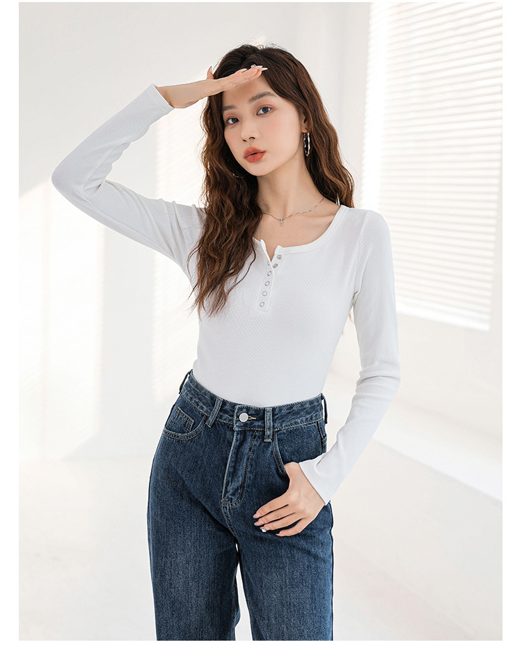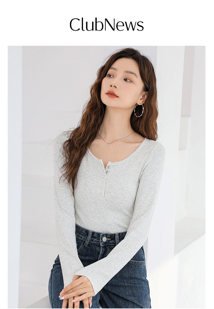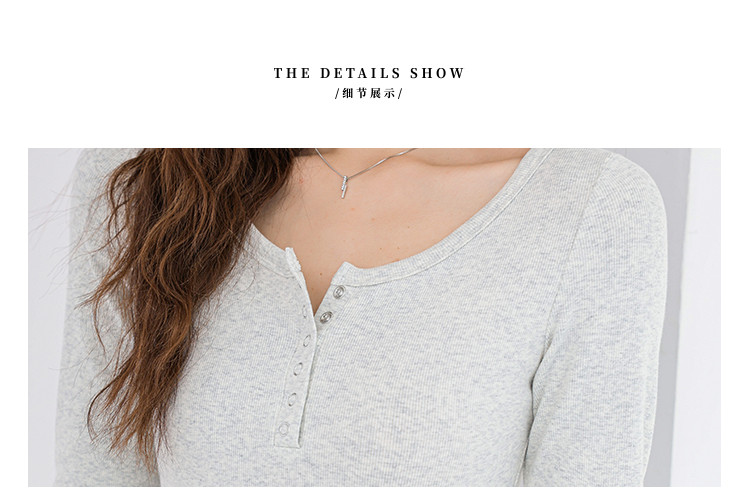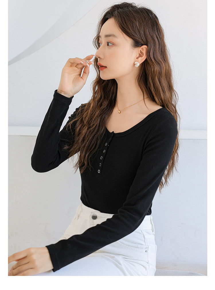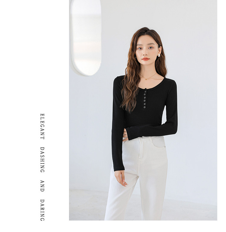 U型领纽扣长袖打底衫女锁骨修身短针织打底上衣 954819