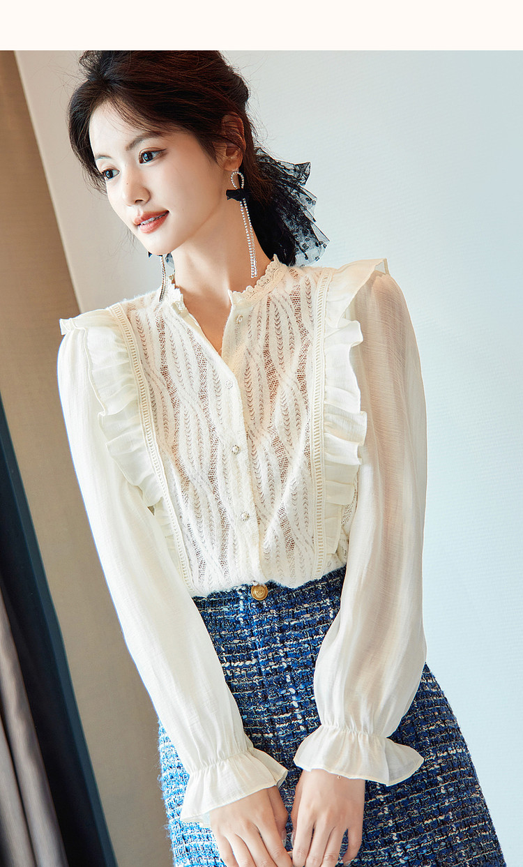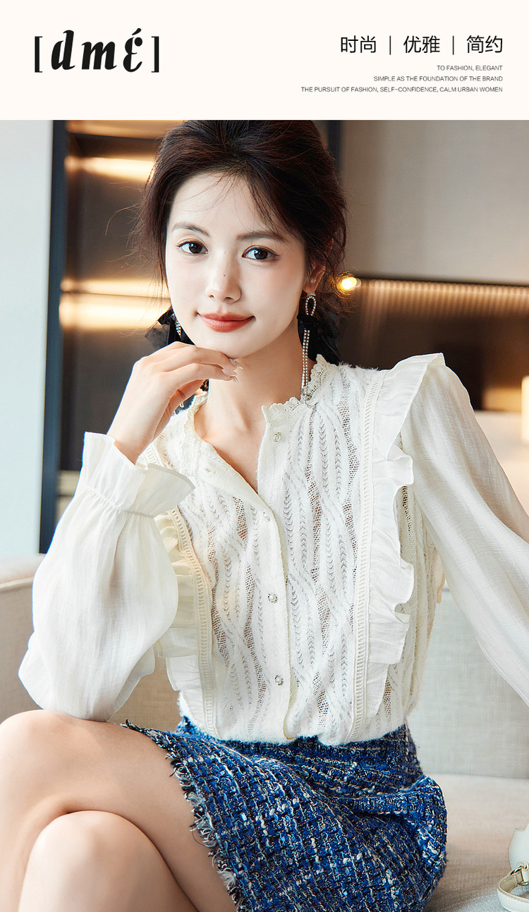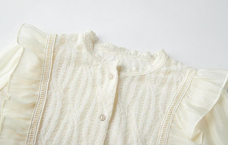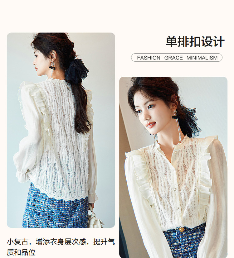 商品名称:【清爽莱赛尔】春秋法式名媛蕾丝衬衫泡泡袖荷叶边衬衣女装上衣 672705