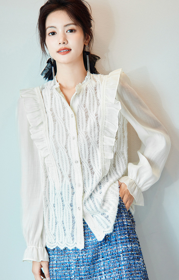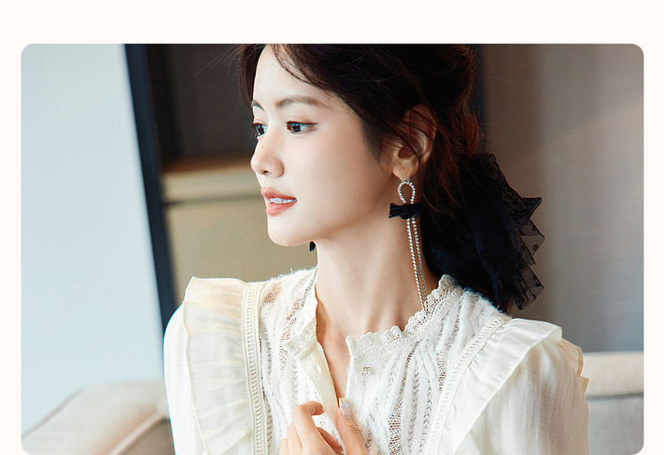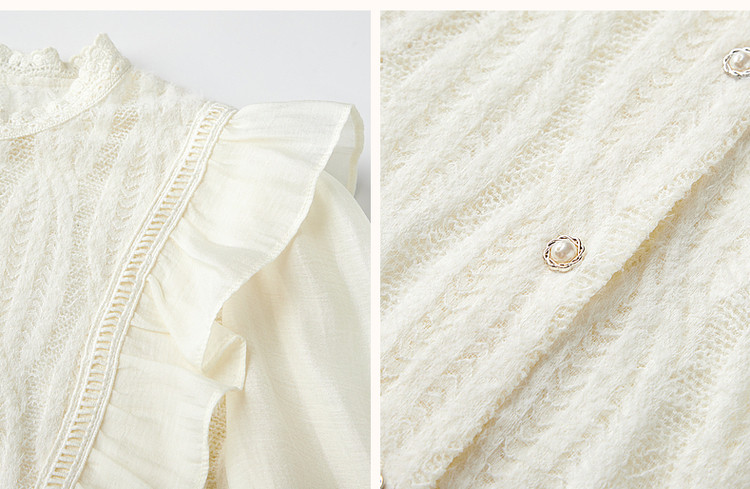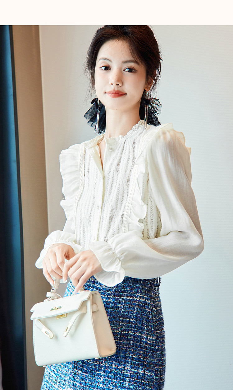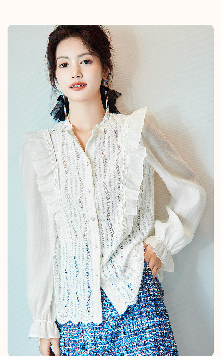 商品名称:【清爽莱赛尔】春秋法式名媛蕾丝衬衫泡泡袖荷叶边衬衣女装上衣 672705