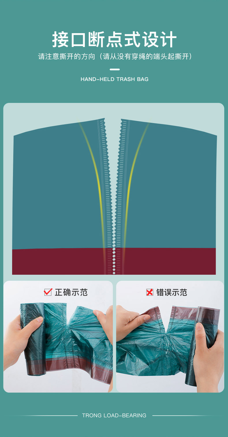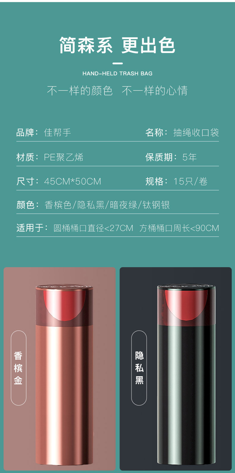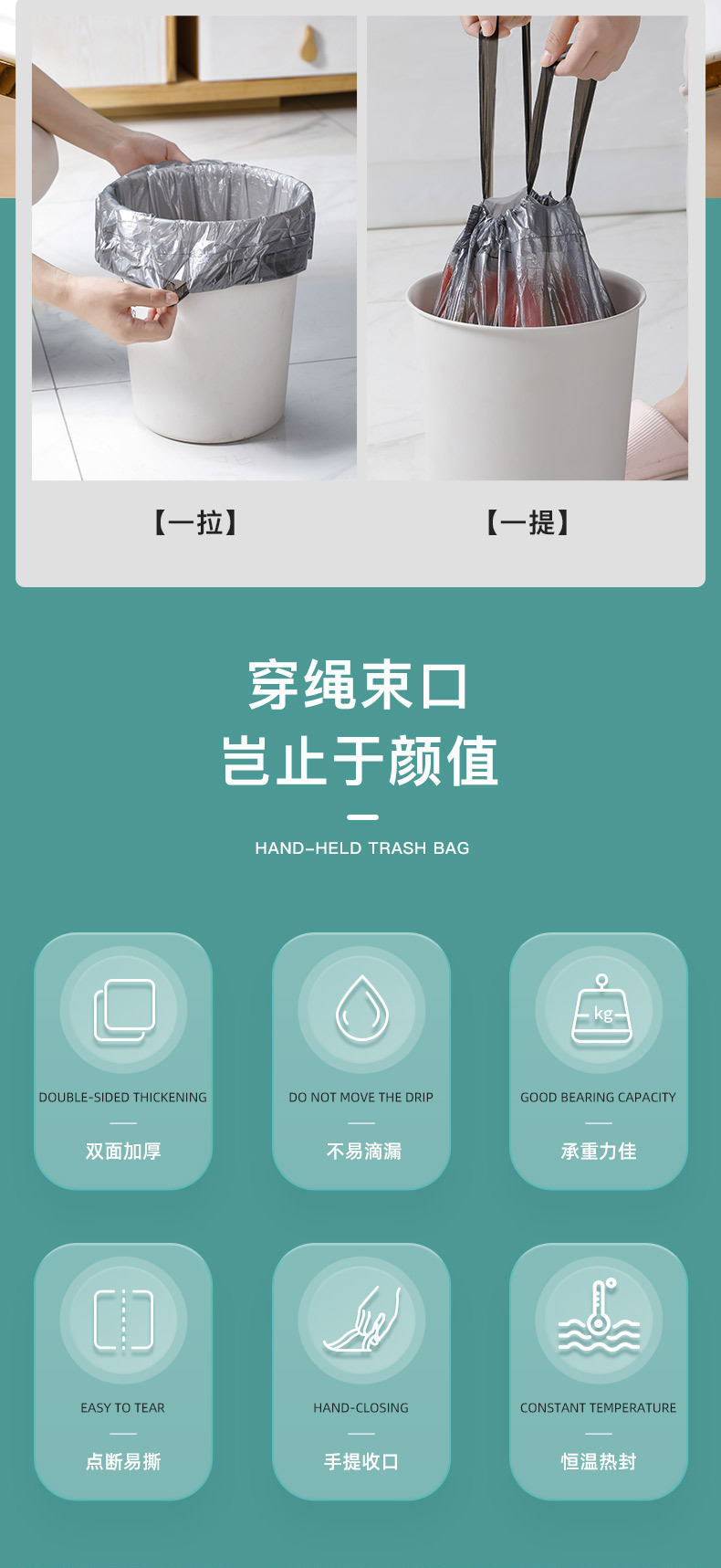 垃圾袋彩色抽绳自动收口不脏手垃圾袋(5卷75只)