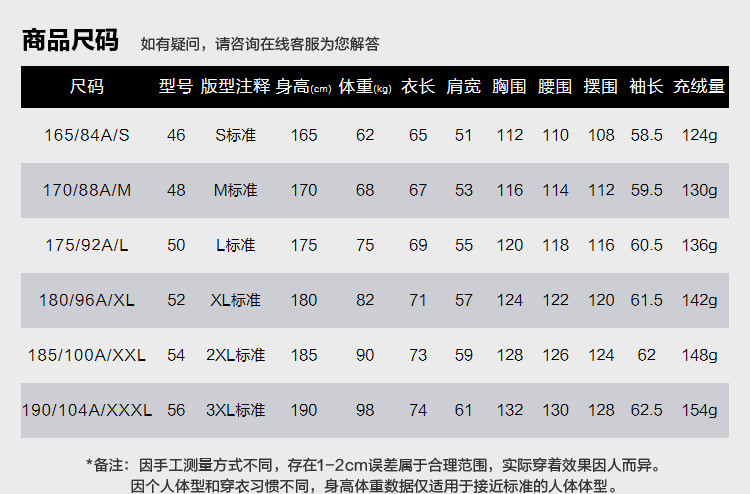 | 尺码 | 衣长(cm) | 肩宽(cm) | 腰围(cm) | 袖长(cm) | 充绒量(g) | 胸围(cm) | 下摆围(cm) | 号型 |