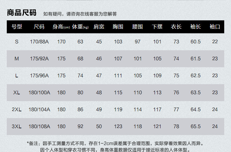 | 2XL | 77 | 49 | 110 | 64.5 | 119 | 113 | 180/104A |