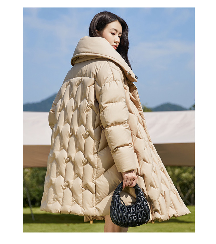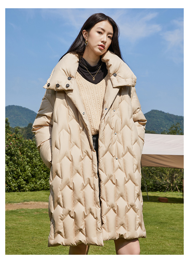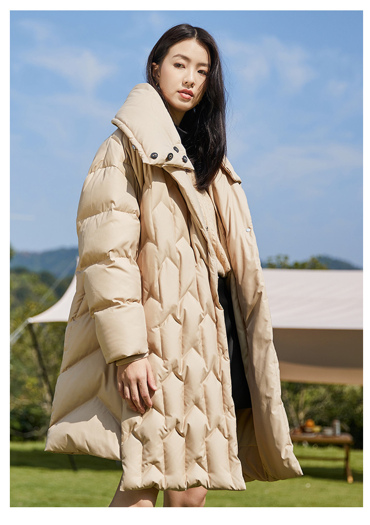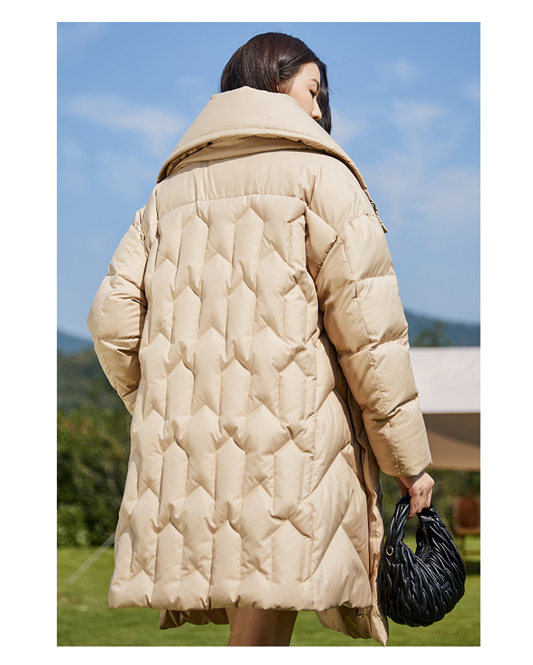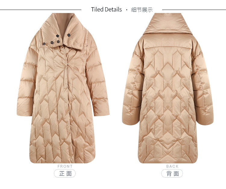商品名称:冬季文艺风女士宽松加厚时尚绗线中长款不对称衣长设计羽绒服 254687
