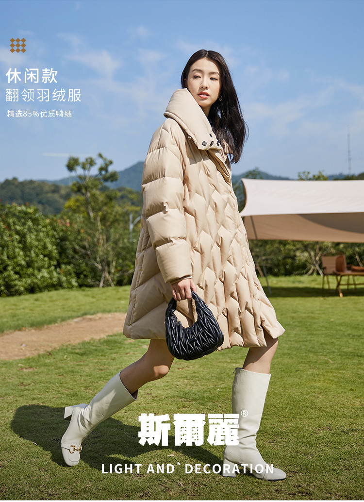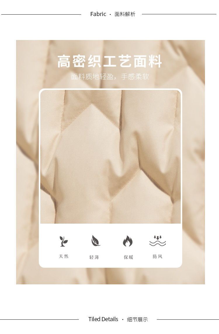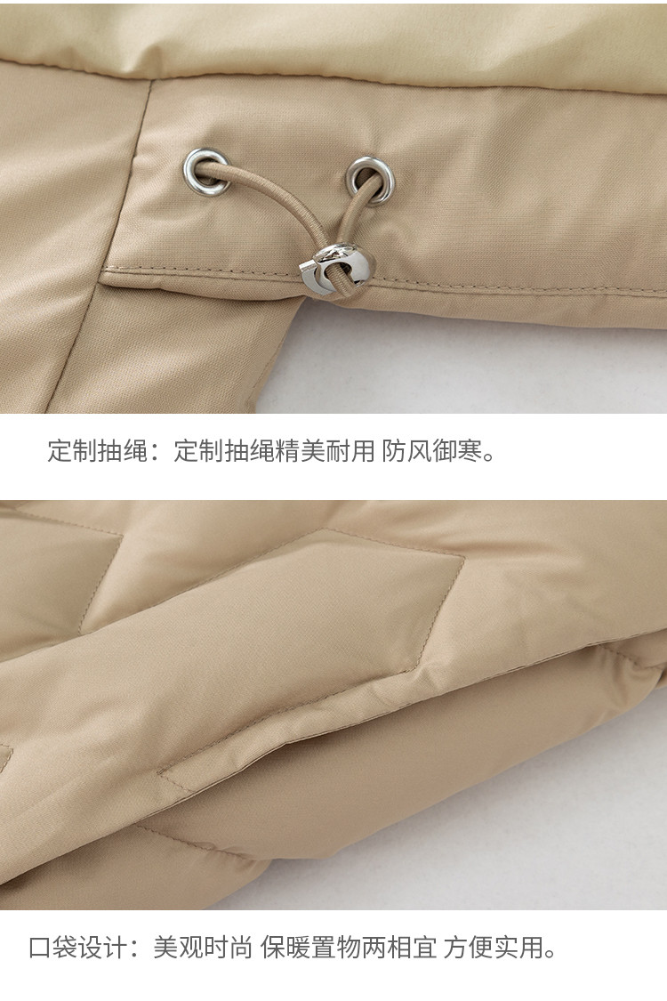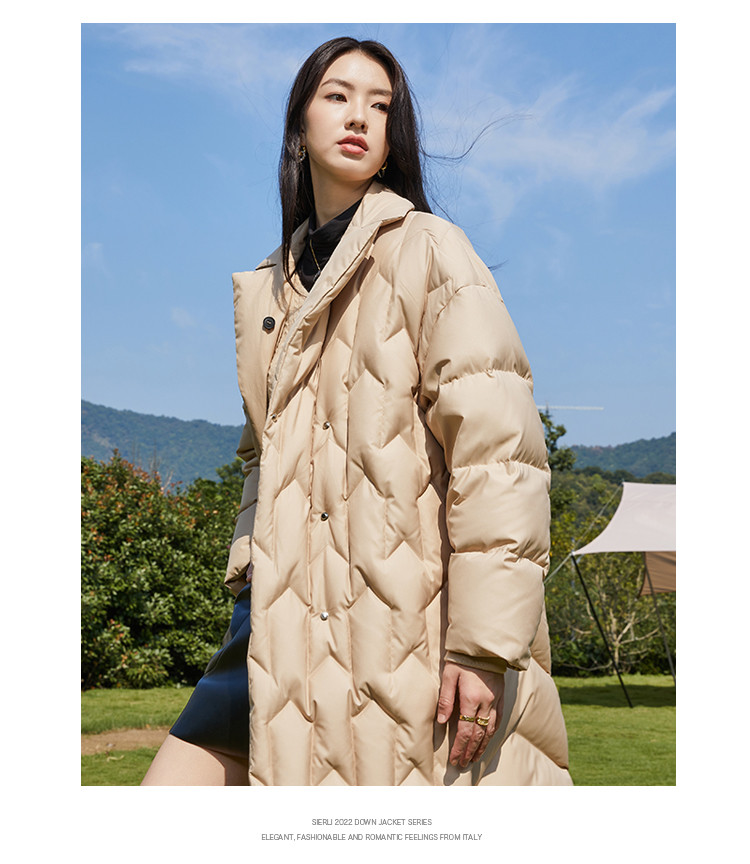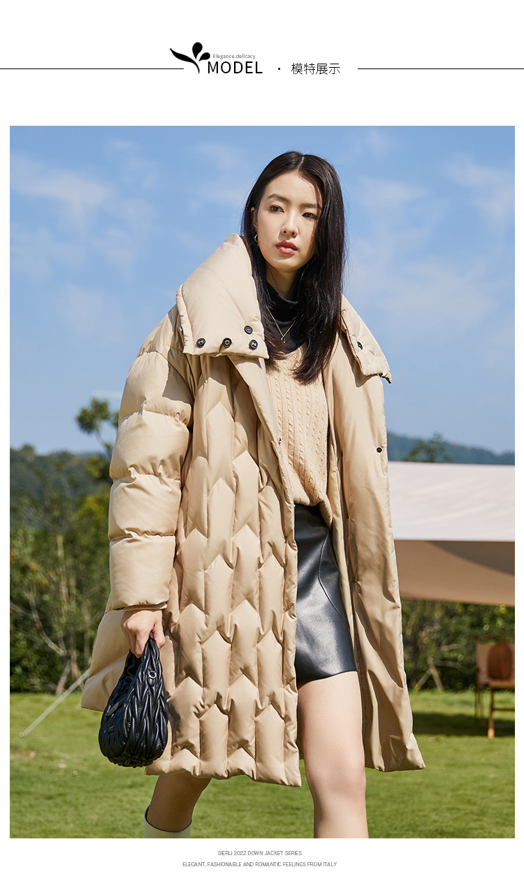 商品名称:冬季文艺风女士宽松加厚时尚绗线中长款不对称衣长设计羽绒服 254687