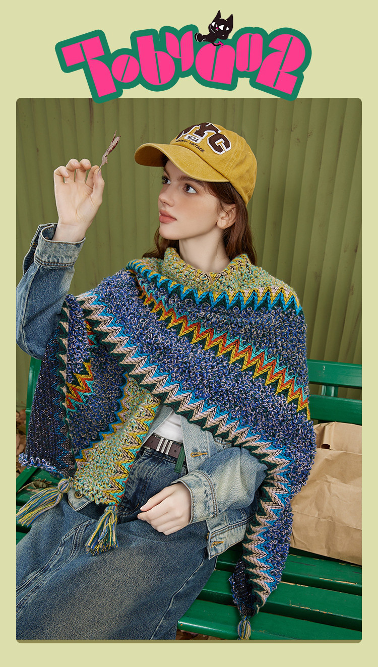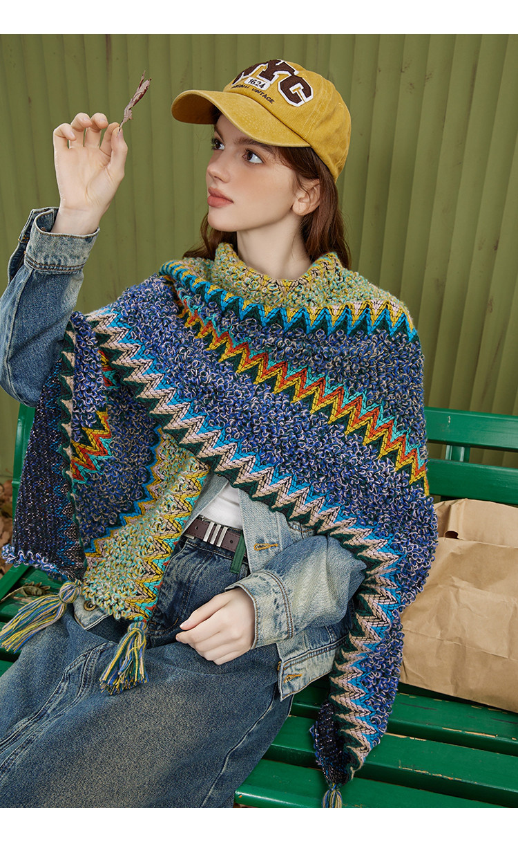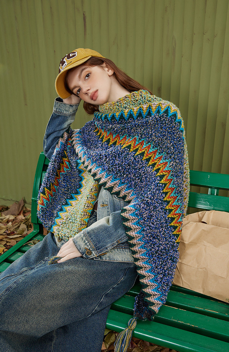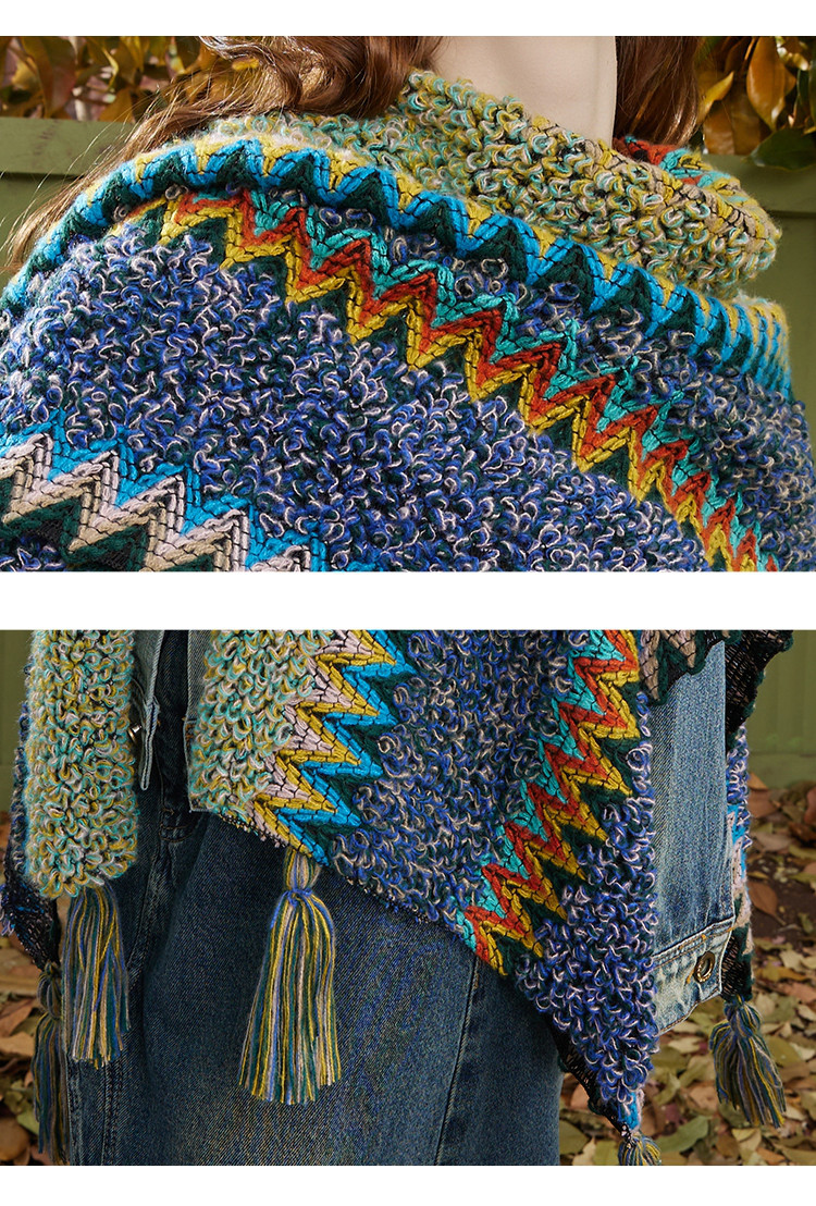新撞色花纹设计流苏披肩复古民族风围巾毛毯 518749
