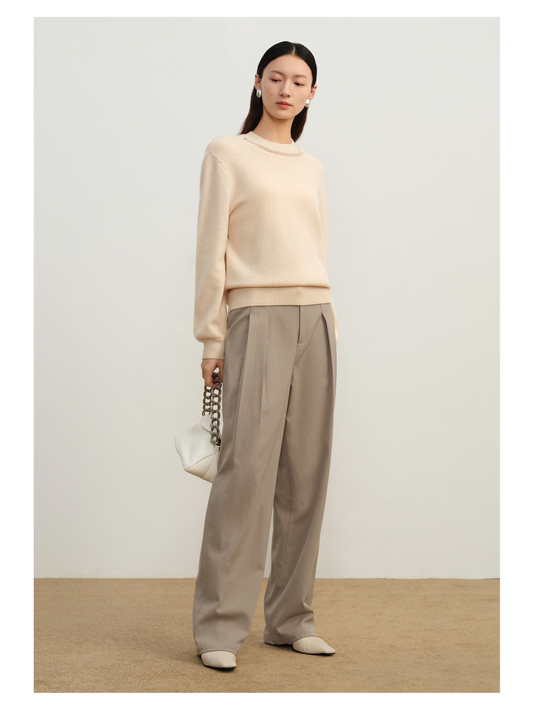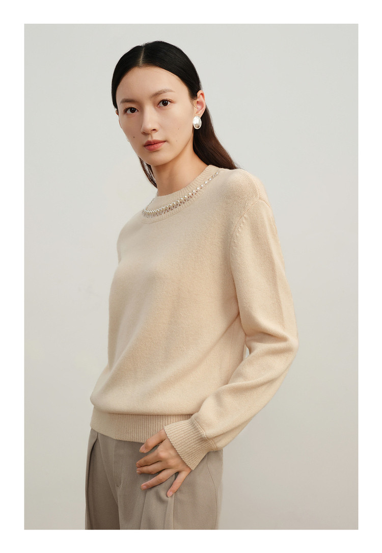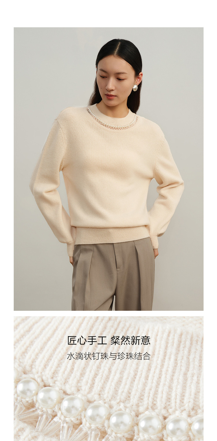 玖姿旗下安娜蔻系列珍珠镂空串珠羊毛衫圆领针织衫女冬季 169612