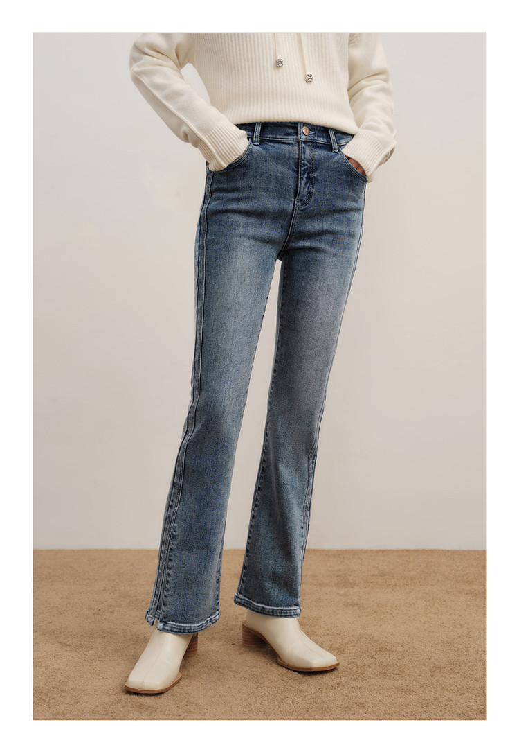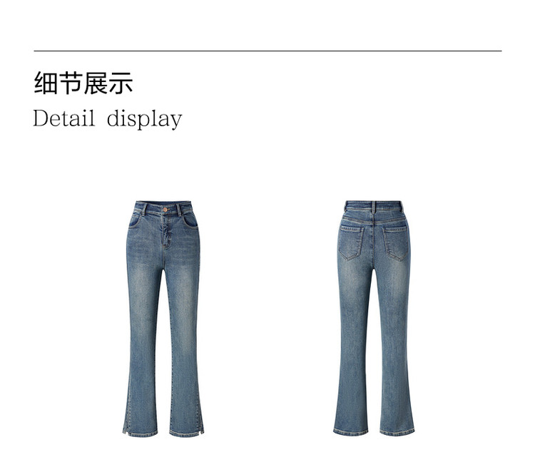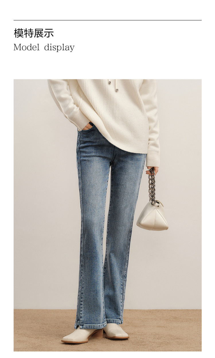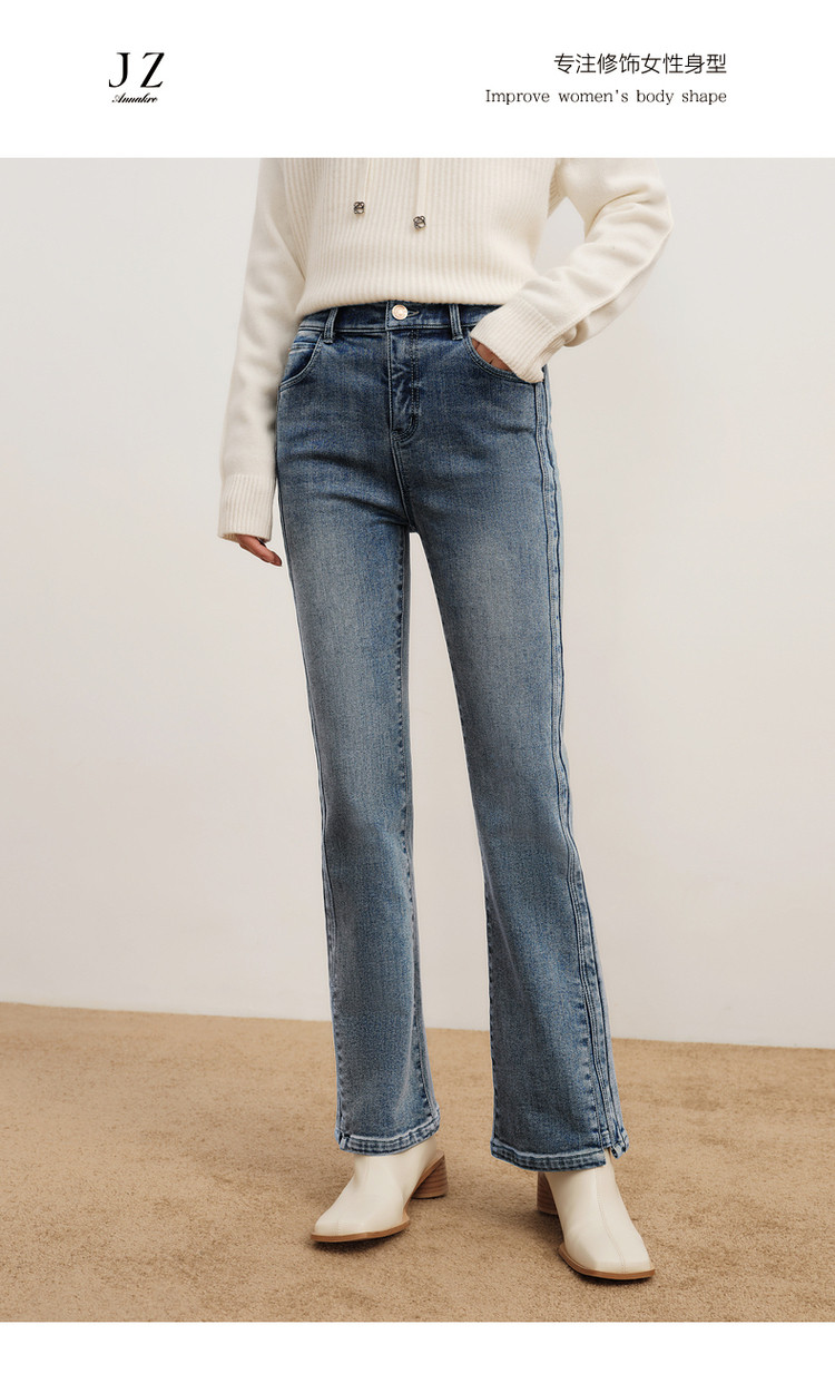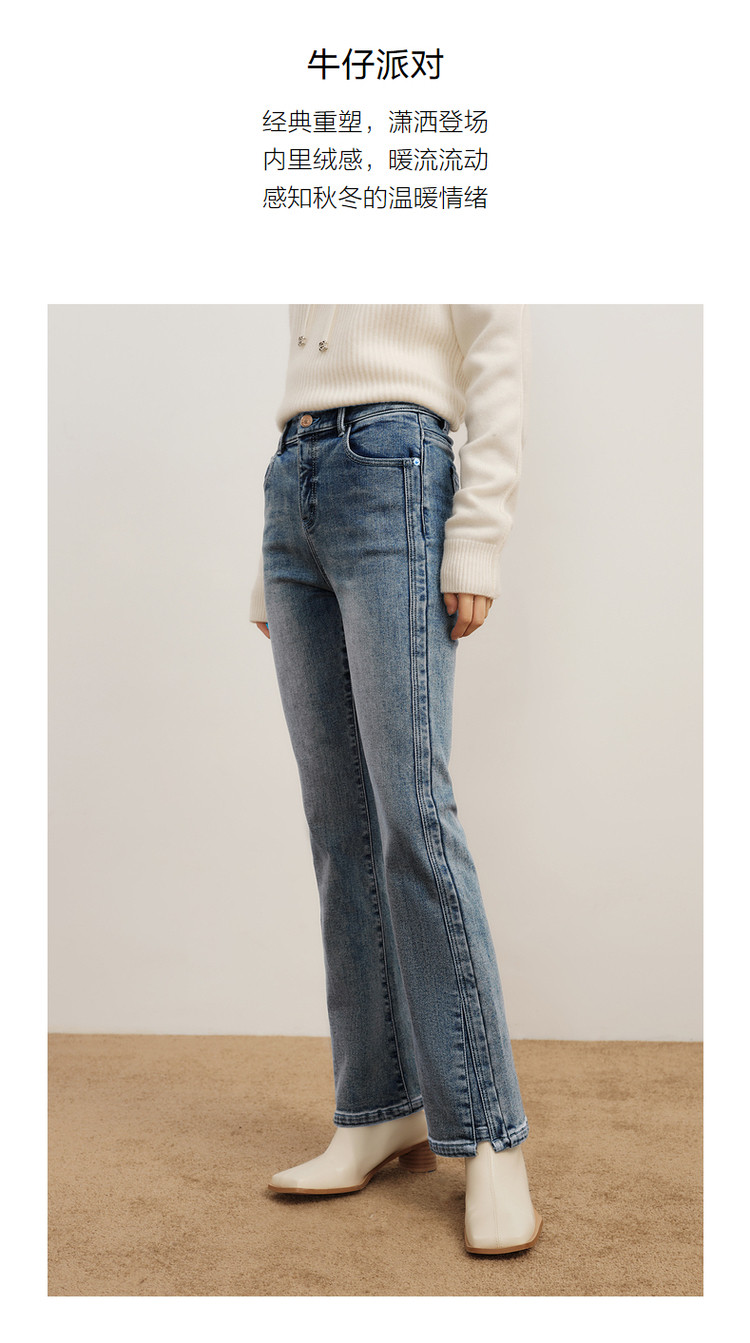 商品名称:玖姿旗下安娜蔻系列复古拼接设计感加绒微喇裤牛仔长裤女冬季 206348
